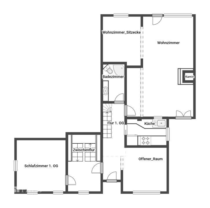 Im 1. Obergeschoss entfaltet sich das Herzstück dieser außergewöhnlichen Wohnung. Eine einladende Diele mit praktischer Kammer für Waschmaschine und Hauswirtschaft führt Sie weiter in die helle Küche mit Einbauküche (im Kaufpreis enthalten), in das angrenzende Esszimmer sowie in das weitläufige Wohnzimmer mit gemütlichem Kamin und einladender Leseecke – ein idealer Ort, um entspannte Stunden im warmen Licht des Feuers zu genießen. Vom Wohnzimmer aus gelangen Sie sowohl auf den Balkon als auch über wenige Stufen auf die große Sonnenterrasse mit freiem Blick über Felder und Wiesen. Der angrenzende, weitläufige Garten ist ein echtes Paradies für Ruhesuchende – ein Ort der Entspannung, des Rückzugs und der stillen Erholung. Hier finden Sie ausreichend Raum für individuelle Gartengestaltung, gemütliche Sitzecken oder einfach nur das Genießen der Natur. Ein weiteres Zimmer auf dieser Ebene bietet zusätzliche Nutzungsmöglichkeiten. Das Wohnzimmer, Esszimmer und die Sitzecke sind mit hochwertigem Echtholz-Stäbchenparkett ausgestattet, das Wärme und Stil gleichermaßen ausstrahlt. Ein modernes Badezimmer mit Duschkabine komplettiert diese Ebene.
