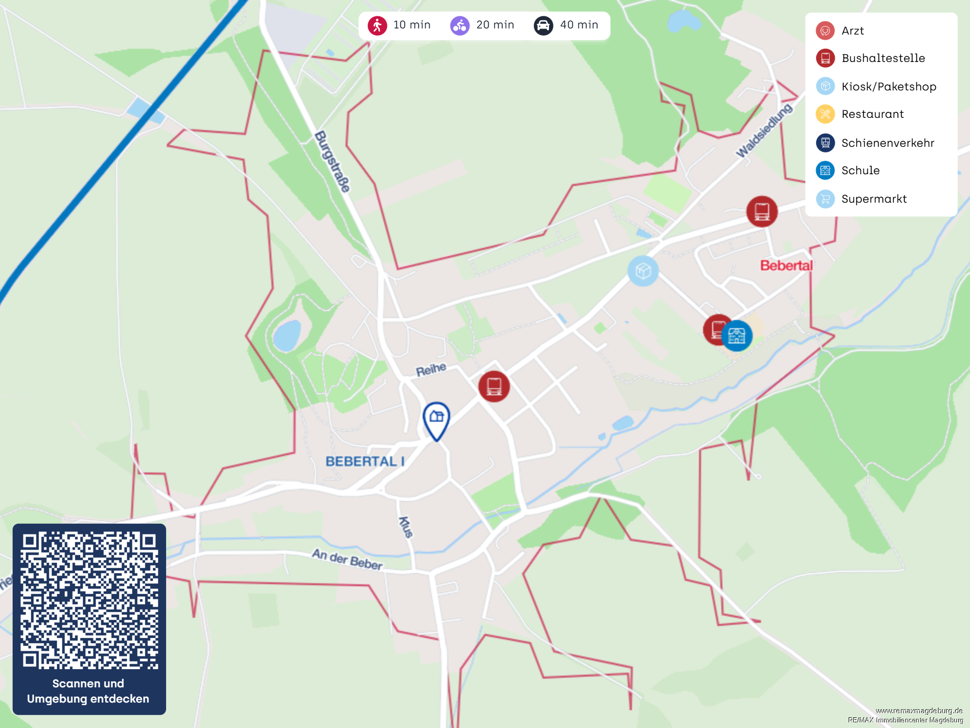 Bebertal verfügt über eine gute Grundversorgung sowie eine gewachsene Infrastruktur. Einkaufsmöglichkeiten für den täglichen Bedarf, ärztliche Versorgung, Kindertagesstätten und weitere Einrichtungen sind im Ort bzw. in den umliegenden Gemeinden gut erreichbar. Eine gute Verkehrsanbindung ermöglicht zudem eine schnelle Verbindung in Richtung Magdeburg und in die umliegenden Orte, wodurch auch Pendler von der Lage profitieren.