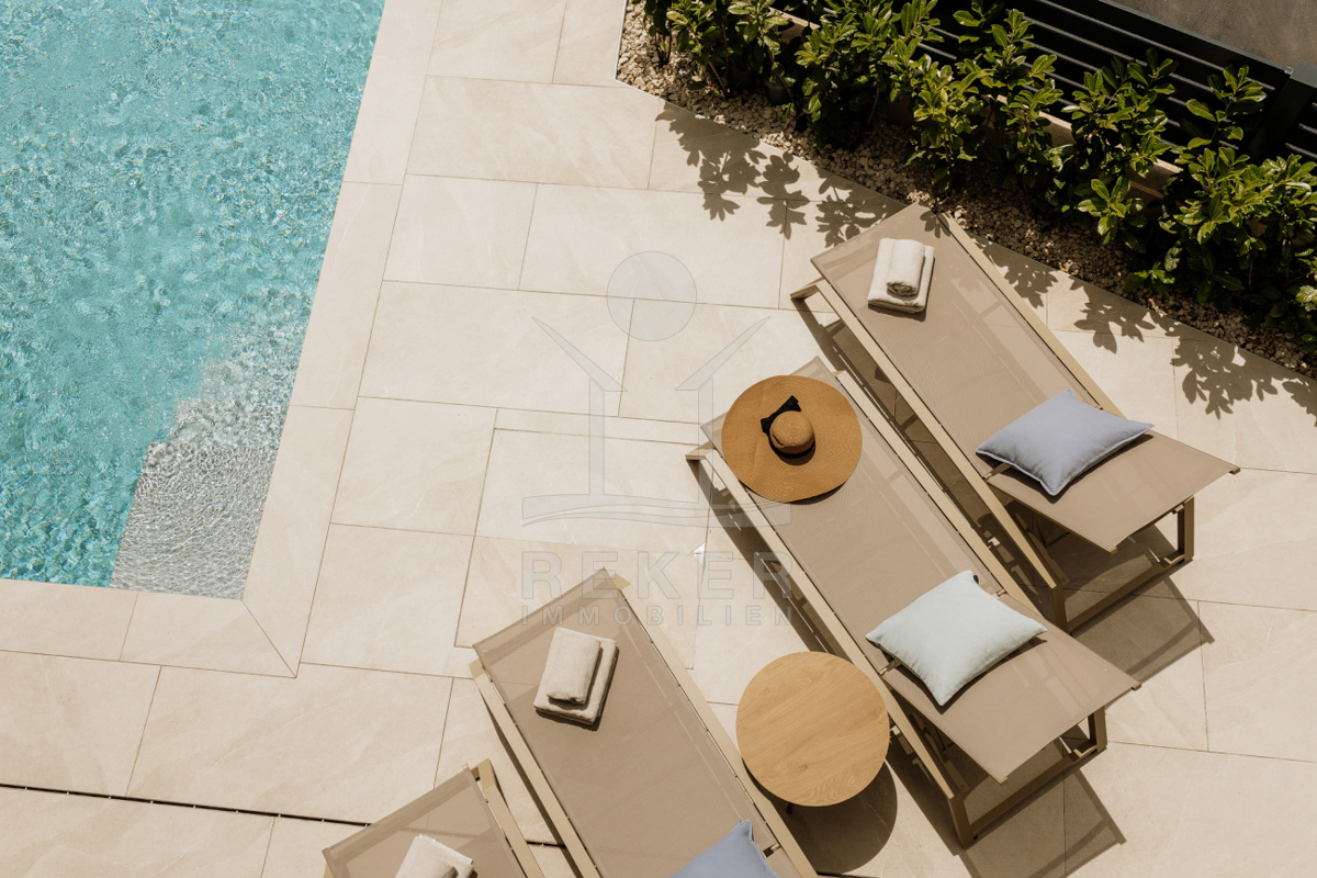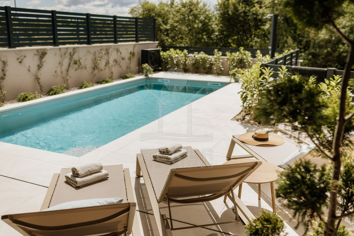 Das 350 m² große Grundstück ist sorgfältig angelegt. Rasenflächen, ein Olivenbaum und Hecken schaffen eine grüne Oase. Mittelpunkt ist der private Pool mit Sonnenterrasse. Hier entspannen Sie oder verbringen Zeit mit Familie und Freunden. Die überdachte Terrasse von 19 m² bietet Platz für einen großen Esstisch. Ergänzt wird das Angebot durch einen Grillbereich für gesellige Abende im Freien.