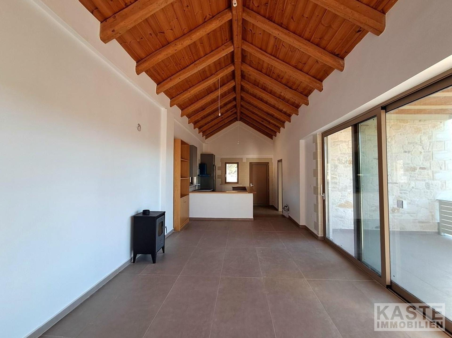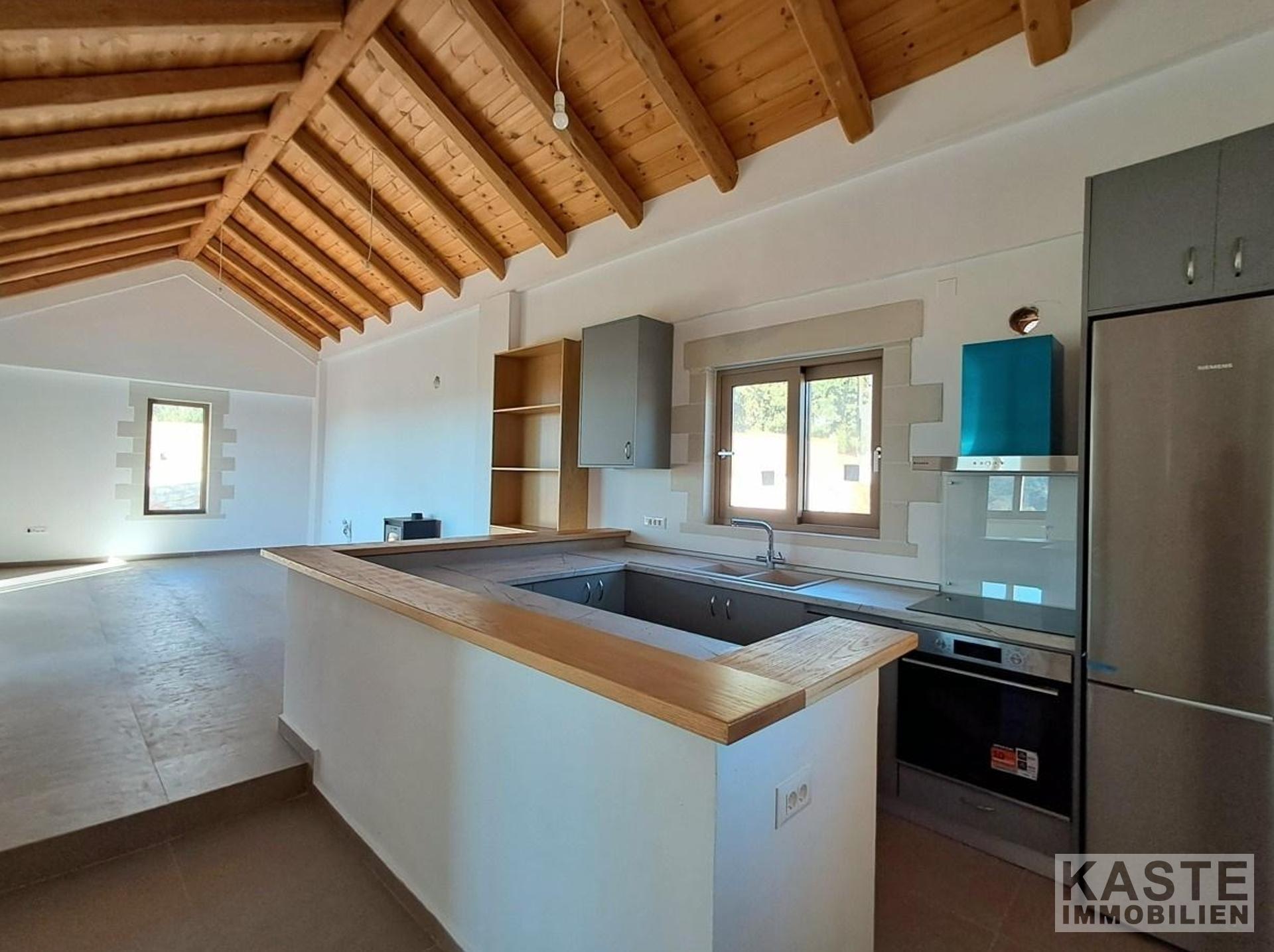 Das Innere des Hauses bietet ein harmonisches Wohnambiente. Die offene Wohnraumgestaltung sorgt für ein großzügiges Raumgefühl, während hochwertige Materialien und eine moderne Ausstattung für Komfort sorgen. Ein Holzofen schafft Gemütlichkeit in den kühleren Monaten, während eine effiziente Klimaanlage und eine moderne Wärmepumpe für angenehme Temperaturen zu jeder Jahreszeit sorgen.