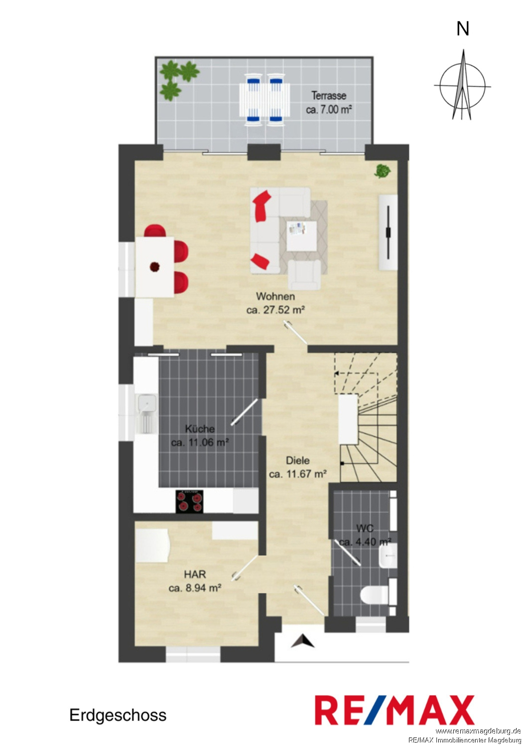 Erdgeschoss: - Diele, - HAR/HWR, - Gäste-Bad mit Dusche, - Wohnen und Essen mit Zugang zur Terrasse, - Kochen,