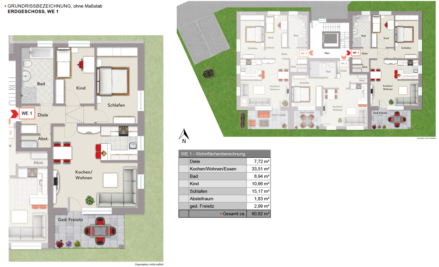 Die Häuser werden in konventioneller Bauweise (Stein auf Stein) im Neubaustandard nach GEG (Gebäudeenergiegesetz) im KfW40-Standard unter Verwendung hochwertiger Baumaterialien errichtet. Für das Gebäude wird ein Lüftungskonzept erstellt und alle notwendigen Fenster erhalten eine im Fensterprofil integrierte Pfalzlüftung. Die Fenster zur Bahn sind Schallschutzfenster, um eine ruhige Wohnatmosphäre zu gewährleisten. Als umweltfreundliche Heizlösung kommt eine Erdwärmepumpe zum Einsatz, die nicht nur den KfW40-Energieeffzienzstandard erfüllt, sondern auch zu Energieeinsparungen führt. Zudem wird auf dem Dach eine 9 kWp PV-Anlage installiert, die den Gemeinschaftsstrom abdeckt und damit zur Reduzierung der Betriebskosten beiträgt.