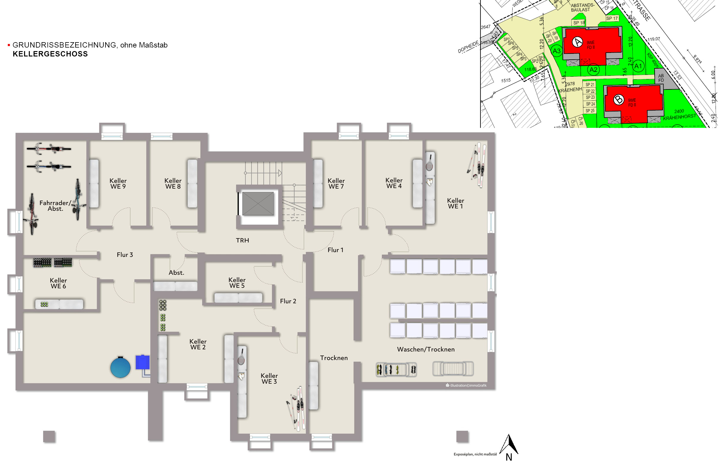 Keller: Jede Wohnung verfügt über einen separaten Kellerraum. Ein Wasch-/Trockenkeller steht zur gemeinsamen Nutzung zur Verfügung. Ein Kellerraum für Fahrräder, Kinderwagen etc. ist vorhanden.