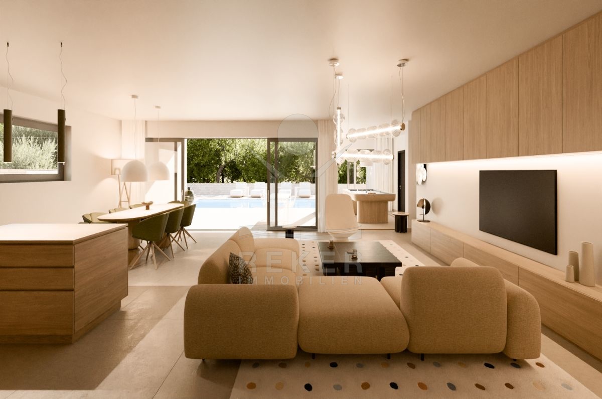 Die großzügige überdachte Terrasse des Hauses bildet das Herzstück des Außenbereichs und bietet einen herrlichen Blick auf den angelegten Garten. Ein Swimmingpool lädt an heißen Tagen zum Erfrischen ein und macht die Terrasse zum idealen Ort für gesellige Sommerabende oder entspannte Stunden allein. Mit dieser Kombination aus eleganter Architektur und luxuriösen Outdoor-Annehmlichkeiten ist dieses Neubauprojekt die perfekte Wahl für alle, die modernes und stilvolles Wohnen suchen.