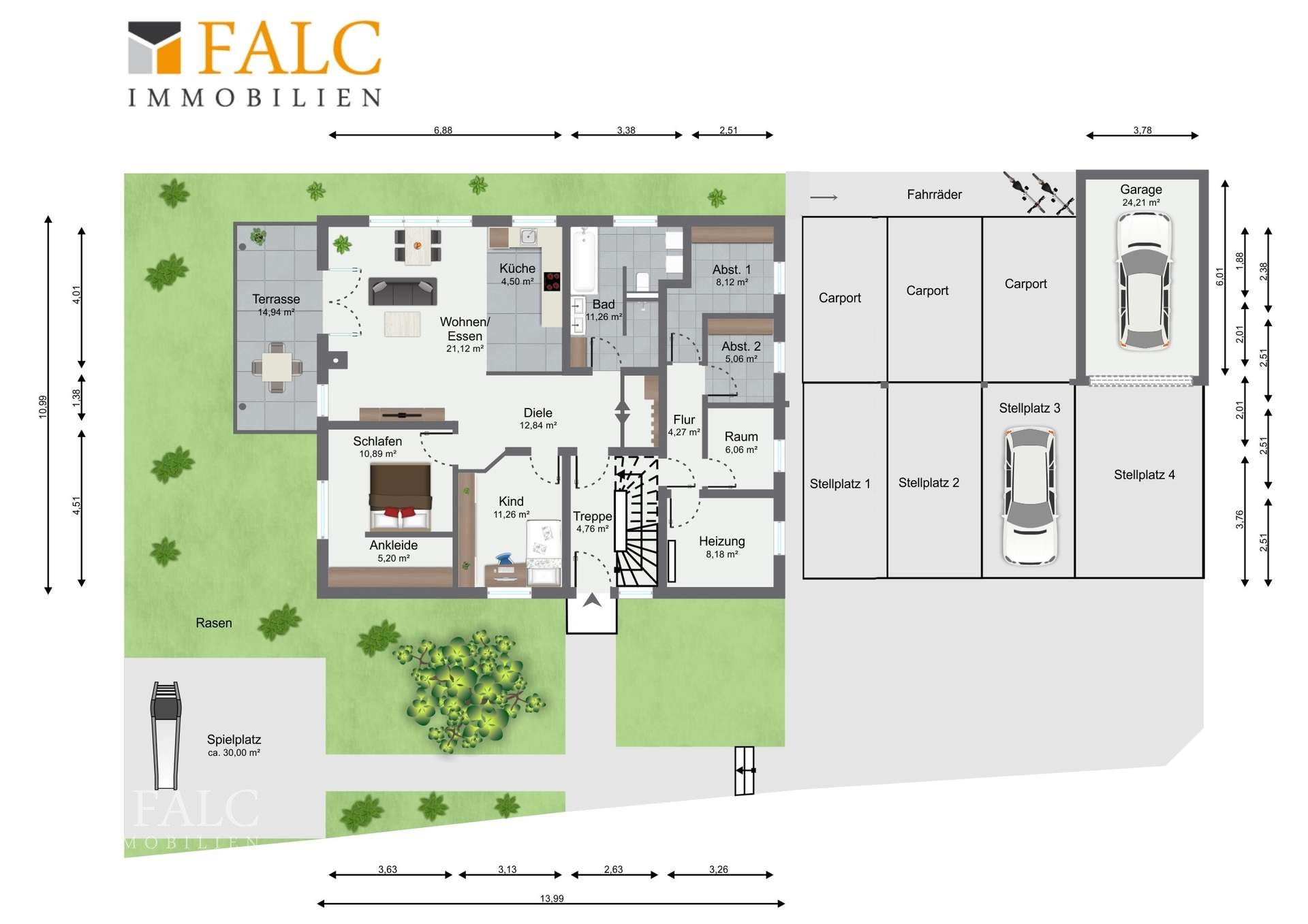 Außenbereich: 1 Garage, 3 Carports, 4 Außenstellplätze, Fahrradabstellplätze im hinteren Bereich der Carports, Gartenbereich