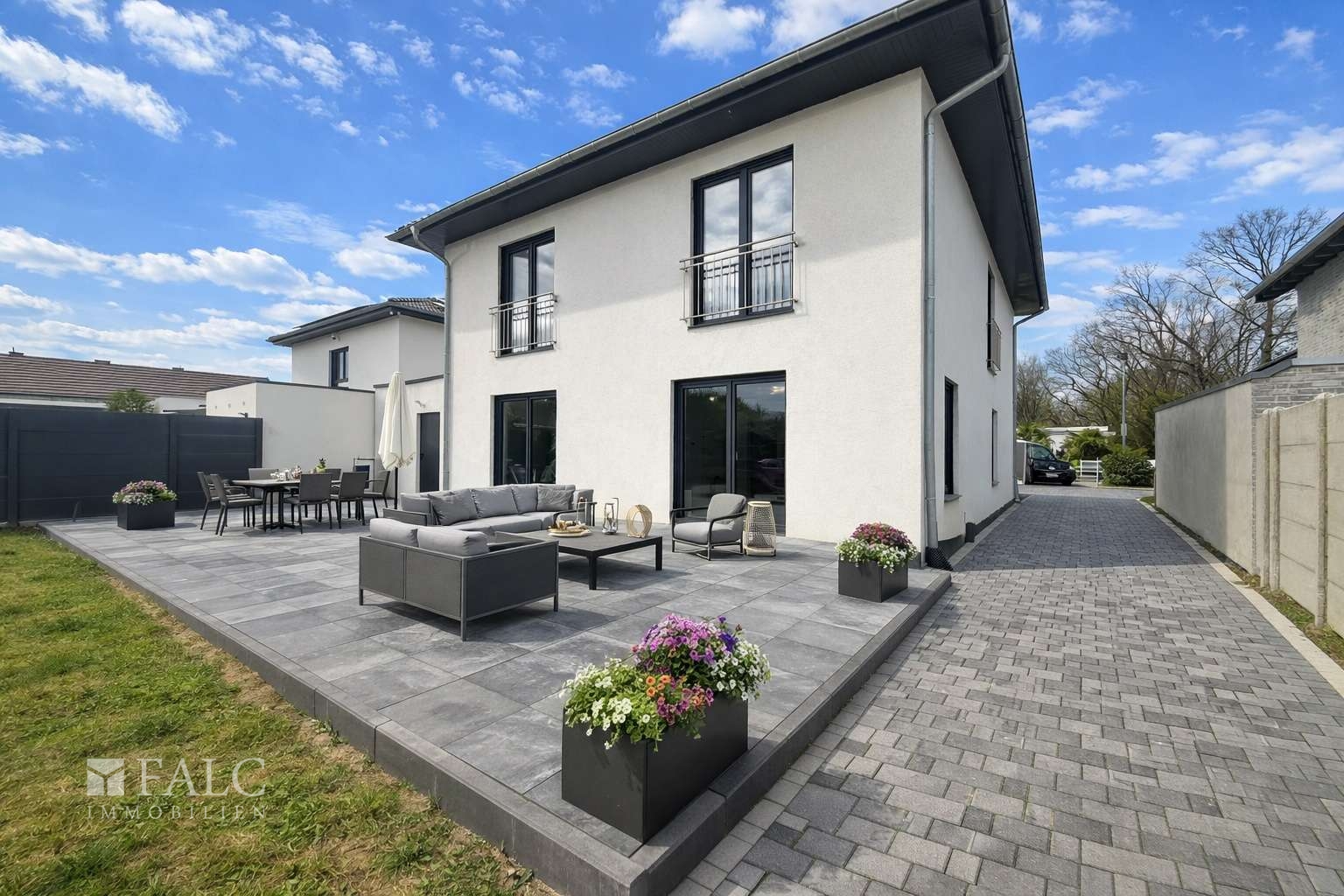 „Einmaliges Wohnen in bester Nachbarschaft mit visueller Bepflanzung “„Exklusive Stadtvilla mit Charakter und visueller Bepflanzung “„Großzügige Terrasse zur freien Gestaltung, visualisierte Bepflanzung und Pflasterung der Seiteneinfahrt.“„Eine prachtvolle, großzügige Terrasse – eine wahre Wohltat für Ihre Seele mit visueller Rasenfläsche“„Der offene Eingangsbereich mit Luftraum setzt ein starkes architektonisches Statement.“„Galerieartiger Flurbereich im Obergeschoss mit lichtdurchflutetem Ambiente“„Großzügige, beheizte Loggia – Boden und Möblierung beispielhaft visualisiert.“„Lichtdurchfluteter Sitzbereich mit bodentiefen Fenstern, Möblierung visualisiert.“„Offener Wohn- und Küchenbereich mit großzügigem Raumgefühl, Möblierung visualisiert.“„Offener Wohnbereich mit Zugang zur großzügigen Terrasse, Möblierung visualisiert.“„Helles, großzügiges Schlafzimmer mit bodentiefen Fenstern, Accessoires dezent visualisiert.“„Flexibel nutzbarer Schlafbereich Möblierung visualisiert.“„Freundliches Kinderzimmer mit guter Belichtung Möblierung visualisiert.“„Großzügiger Raum zur freien Gestaltung, beispielhaft als Homeoffice visualisiert.“„Stilvolles Badezimmer mit Badewanne, Dusche und exklusiver Fliesengestaltung.“„Stilvolles Gäste-Duschbad im Erdgeschoss.“„Stilvolles Gäste-WC mit Tageslicht.“„Funktionaler Technikraum mit integrierter Waschgelegenheit sowie Waschmaschinen- und Trockneranschluss.“„Garage mit separatem Heizungsraum, aktuell baubedingt mit Material belegt – Visualisierung.“Grundriss-ErdgeschossGrundriss Obergeschoss„Lassen Sie Ihren Träumen freien Lauf – Ihr exklusives Zuhause erwartet Sie Bepflanzung visualisiert“