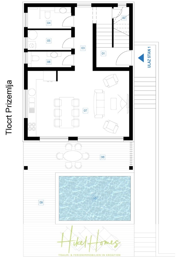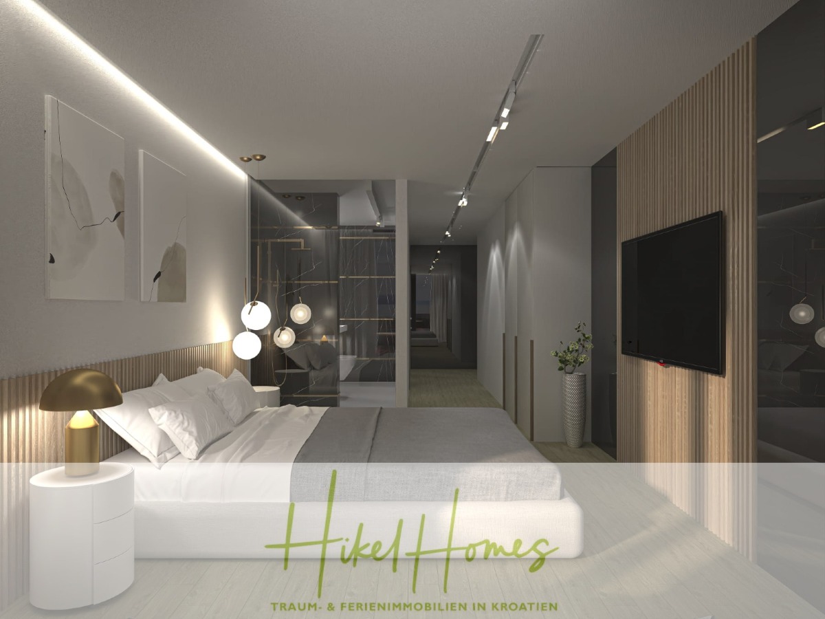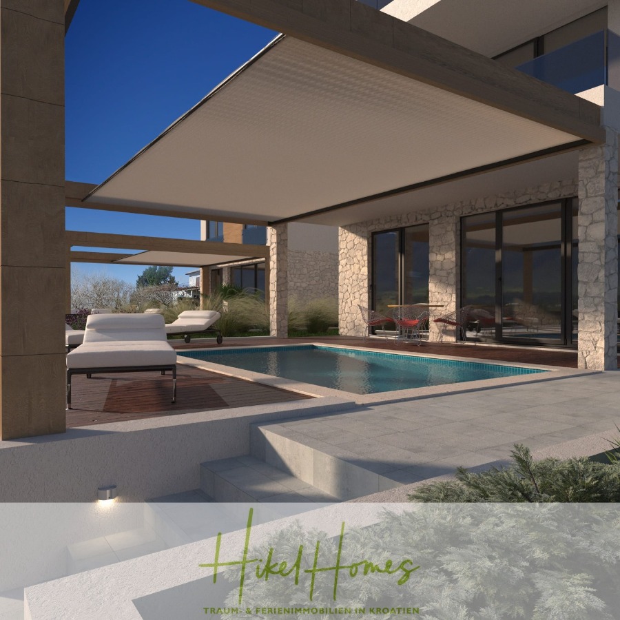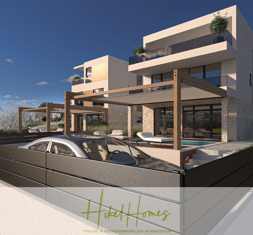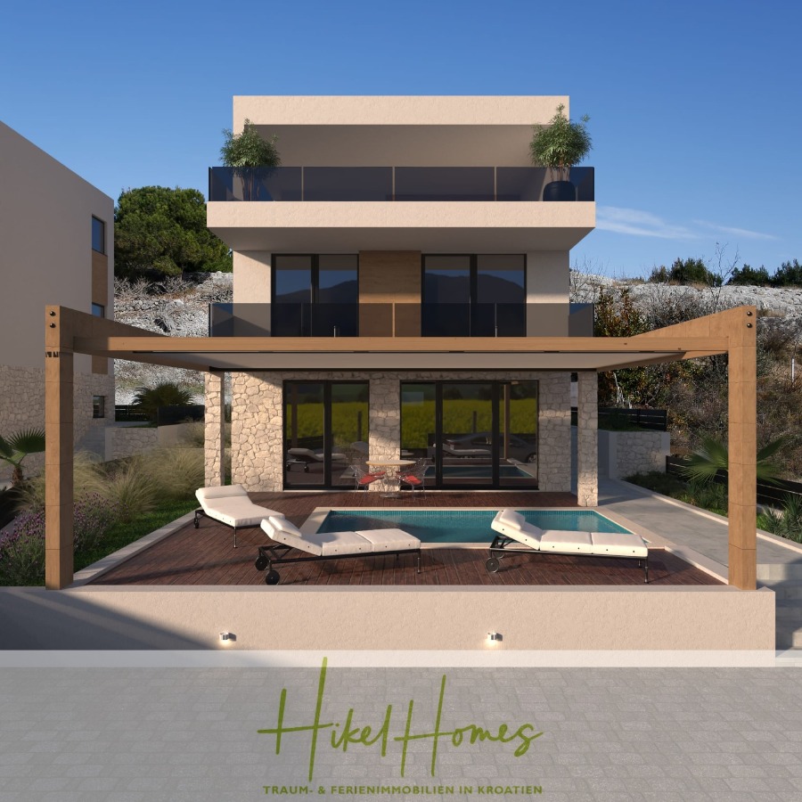 Die moderne Architektur erstreckt sich über zwei Stockwerke mit insgesamt vier großzügigen Zimmern, darunter drei Schlafzimmer und vier hochwertige Badezimmer. Der Wohnbereich wird durch überdachte und offene Terrassen ergänzt, die Ihnen jederzeit entspannte Stunden im Freien ermöglichen. Ein besonderes Highlight ist der private Pool (5 x 3 m), der mit einer Wärmepumpe beheizt wird und durch eine natürliche Salz-Elektrolyse betrieben wird.