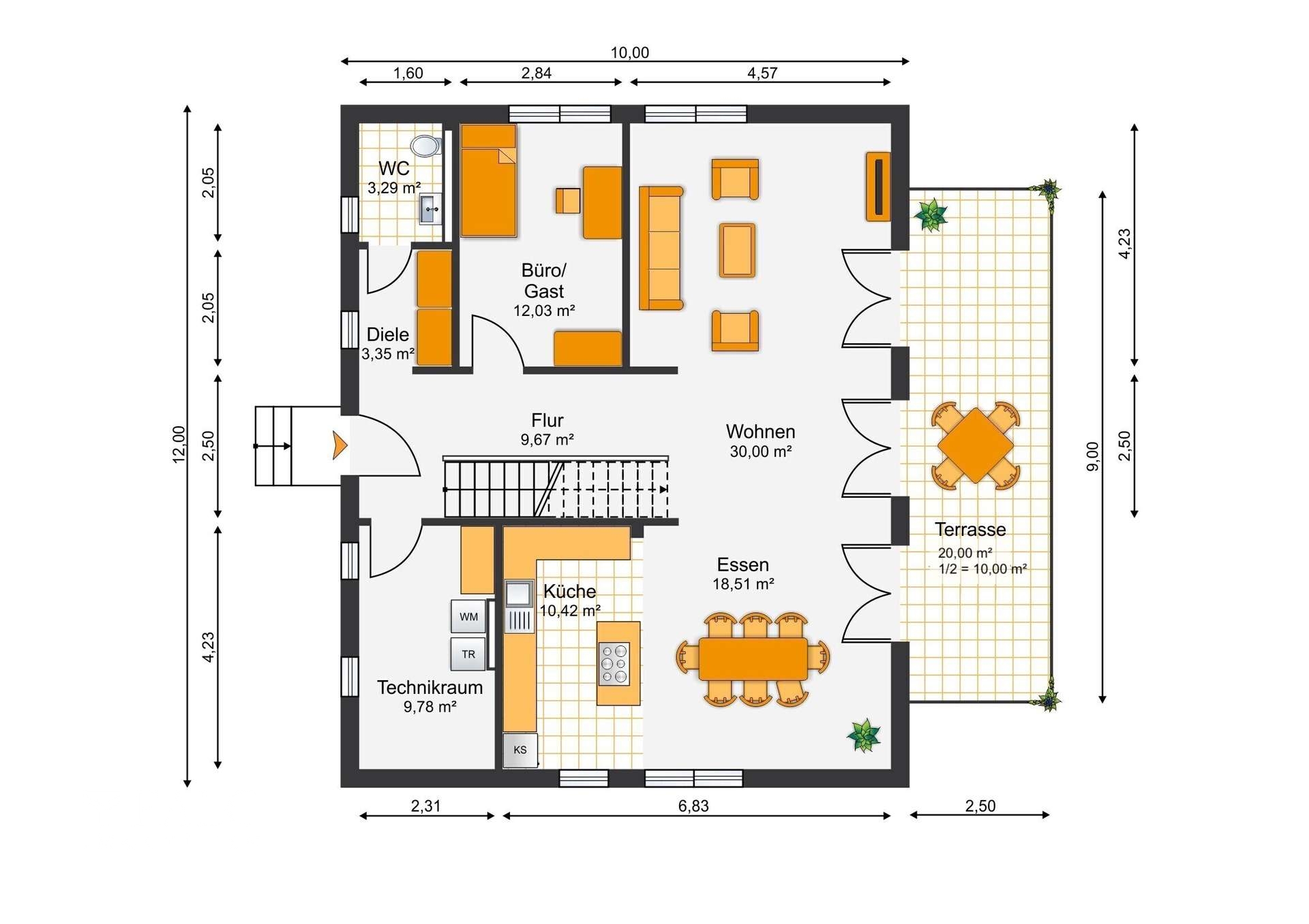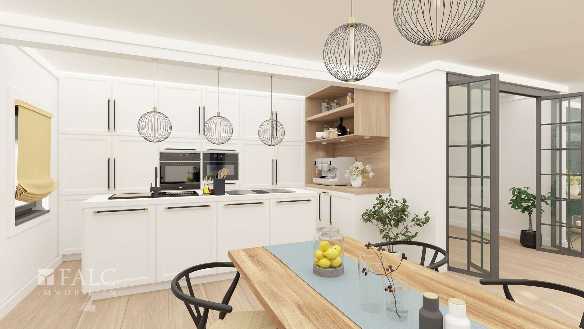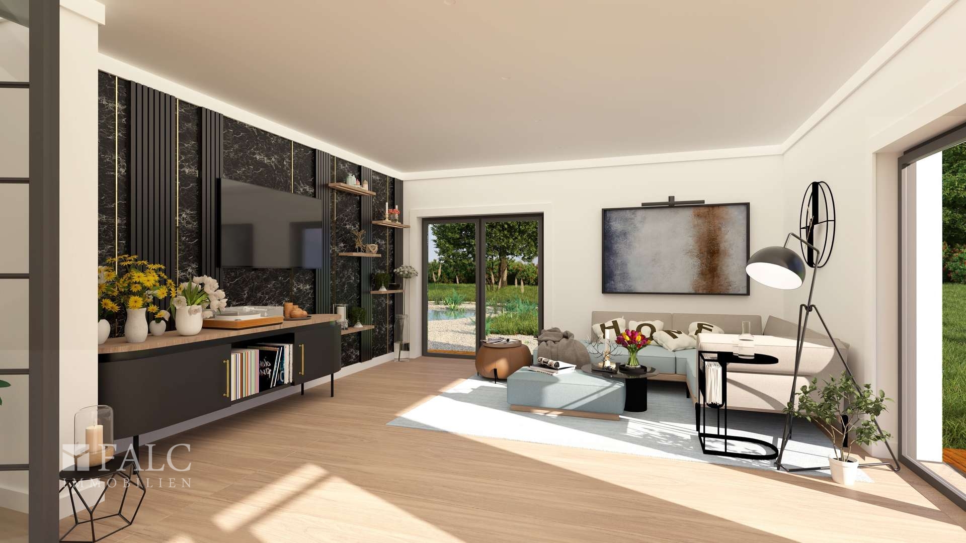 Geradeaus gelangen Sie in den großzügig geschnittenen Wohn- und Essbereich, welcher mit seiner Größe von ca. 58 m² viel Platz für Sie und Ihre Familie bietet. Das offene Raumkonzept wird durch eine traumhafte Küche abgerundet, in der Kochen zum Highlight wird. Durch die bodentiefen Fenster ist der Raum lichtdurchflutet und Sie gelangen von hier über die Terrasse gleich in Ihren wunderschönen Garten.
