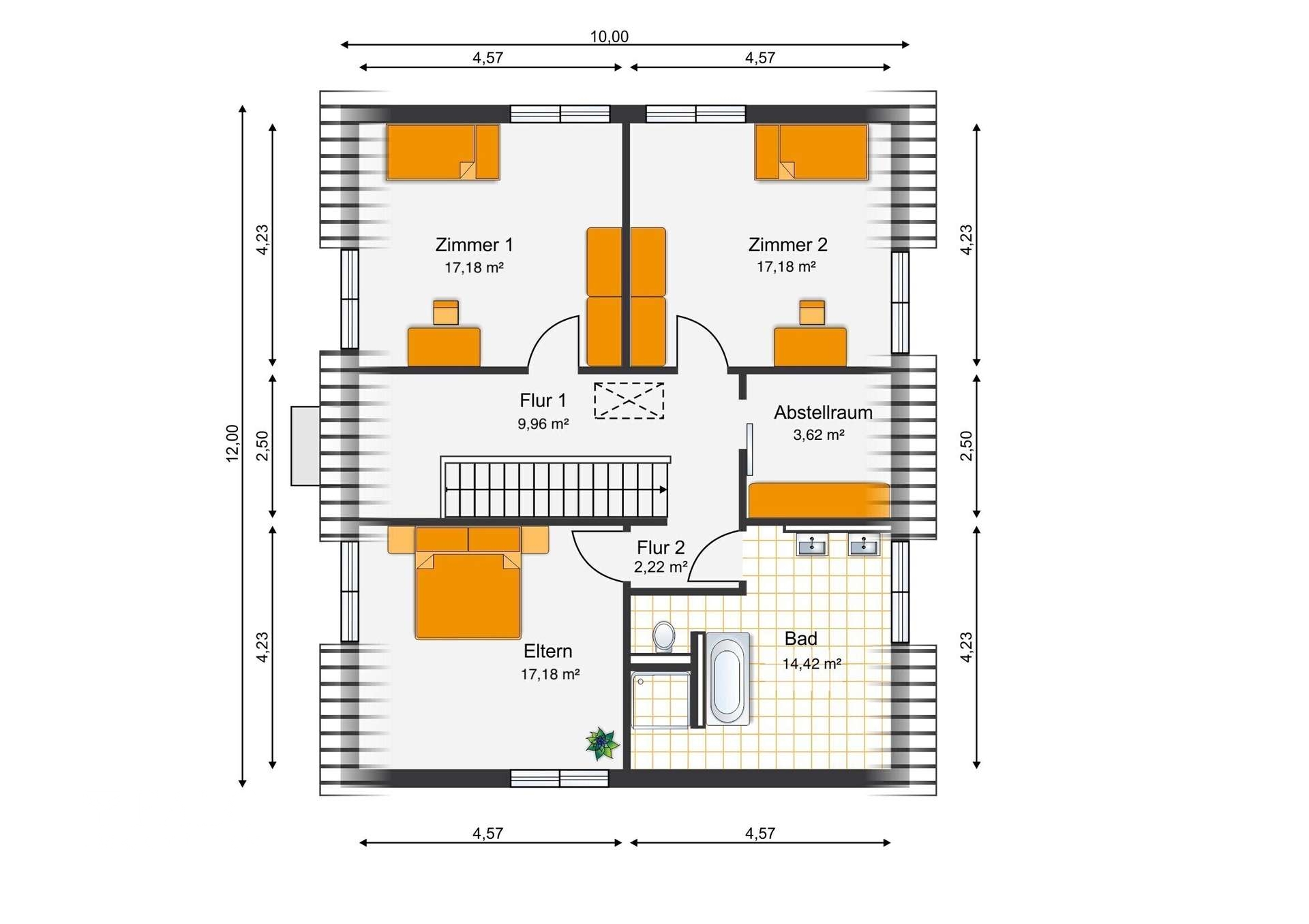 Im Obergeschoss befinden sich das Elternschlafzimmer, die beiden großen Kinderzimmer, das Badezimmer mit Badewanne und Dusche, sowie ein praktischer Abstellraum.