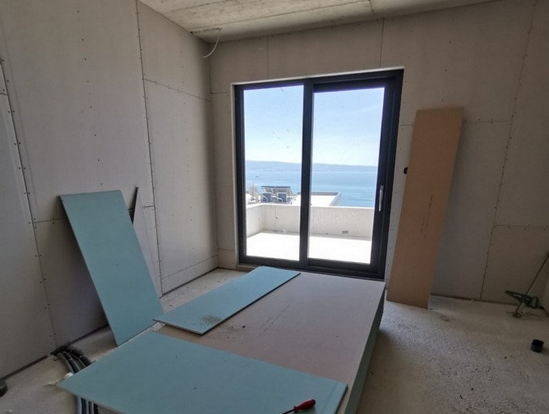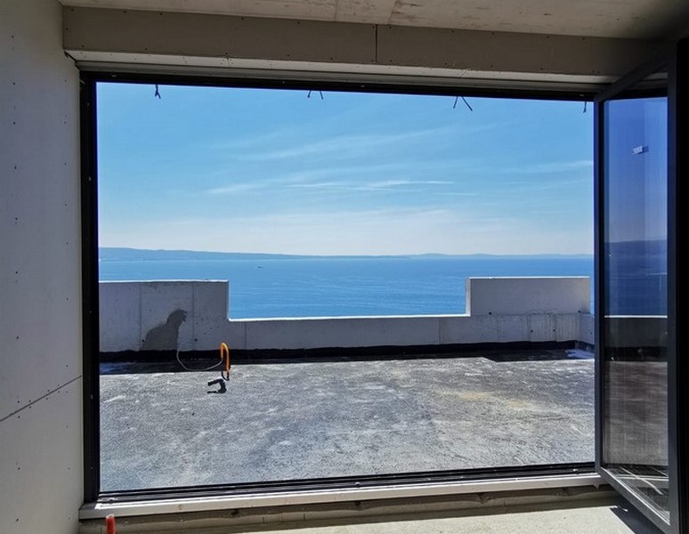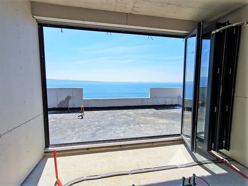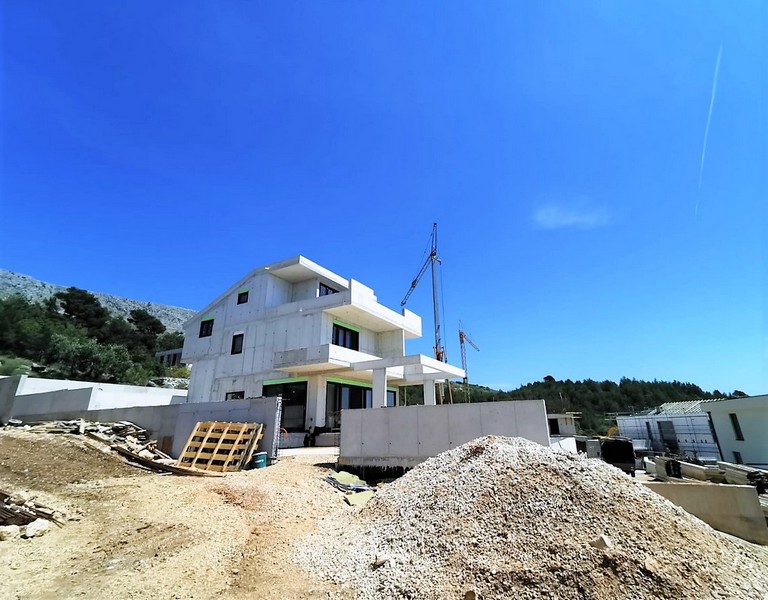 Bei diesem Anwesen handelt es sich um eine neu gebaute Villa im modernen Stil, die sich in einer erstklassigen Panoramalage in einem Vorort südlich von Split in Dalmatien befindet.
