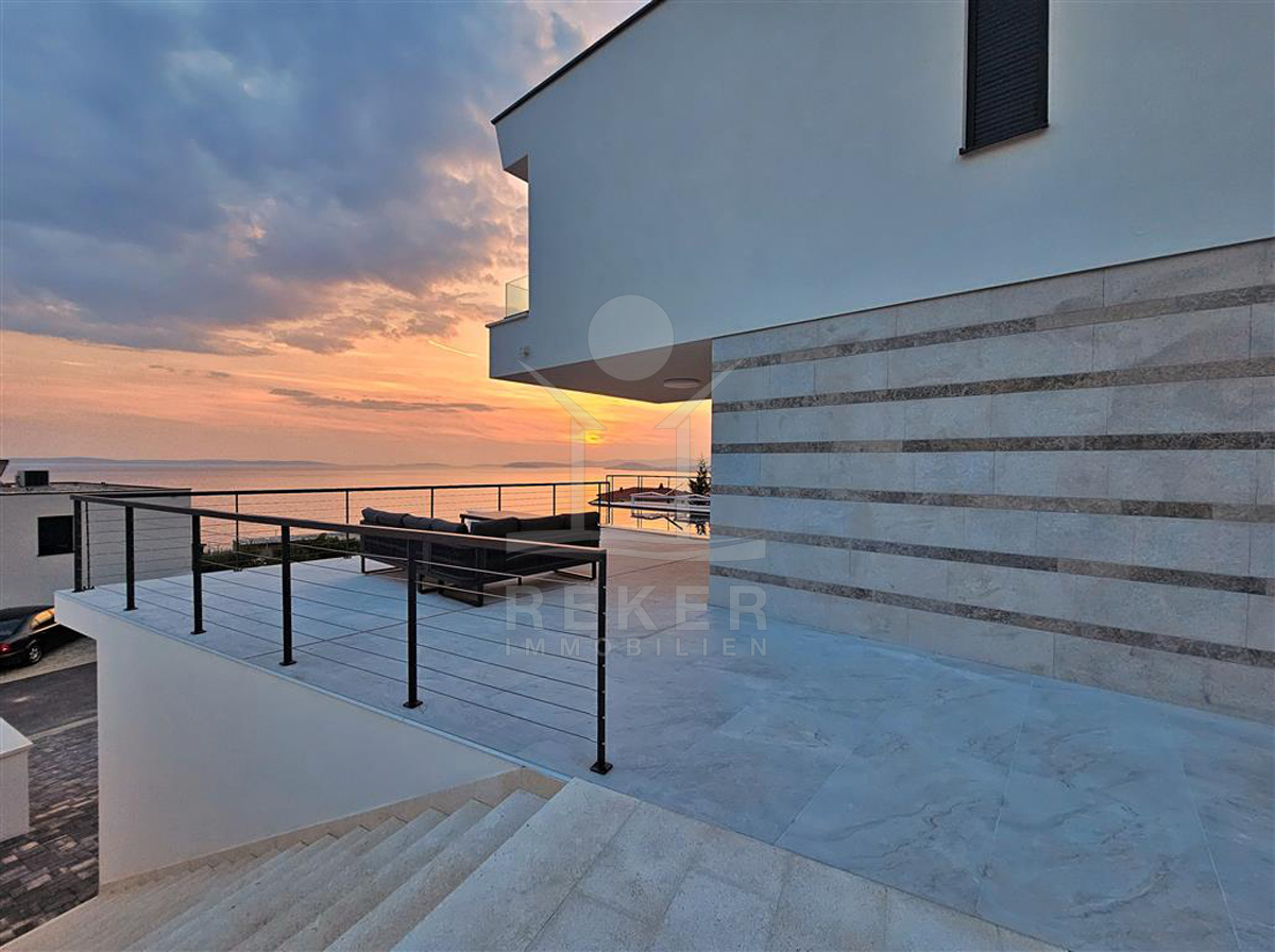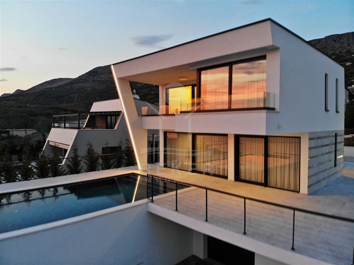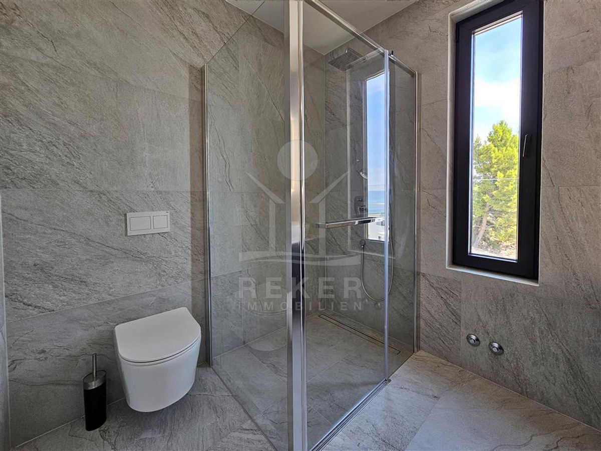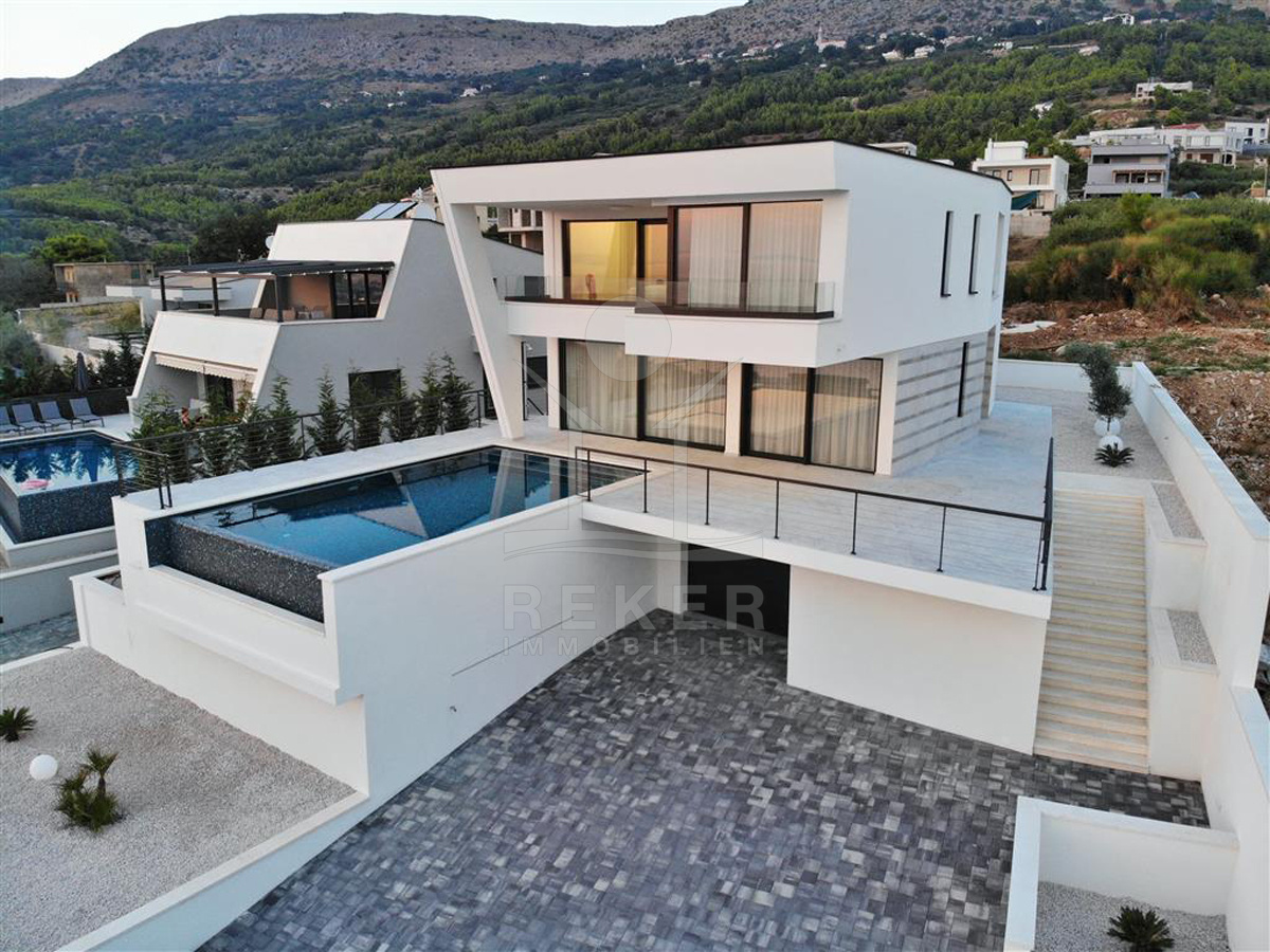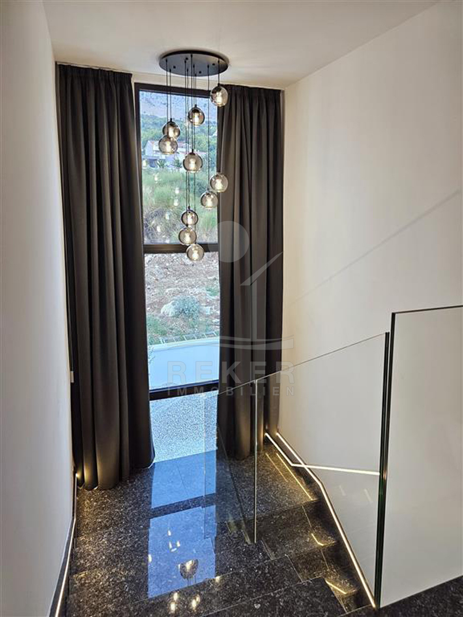 Das Anwesen liegt auf einem 910 m² großen Grundstück in Hanglage. Sie ist von wunderschönen kaskadenförmigen Gärten umgeben, die mit Olivenbäumen und dalmatinische Pflanzen bepflanzt wird. Das Gebäude erstreckt sich über 3 Etagen und verfügt über eine Wohnfläche von 320 m². Die Bauarbeiten und Fertigstellung sind voraussichtlich Sommer 2024 abgeschlossen. Das Haus ist mit einem Untergeschoss ausgestattet und bietet zusätzliche Räume sowie einen Wellness- und Fitnessbereich.