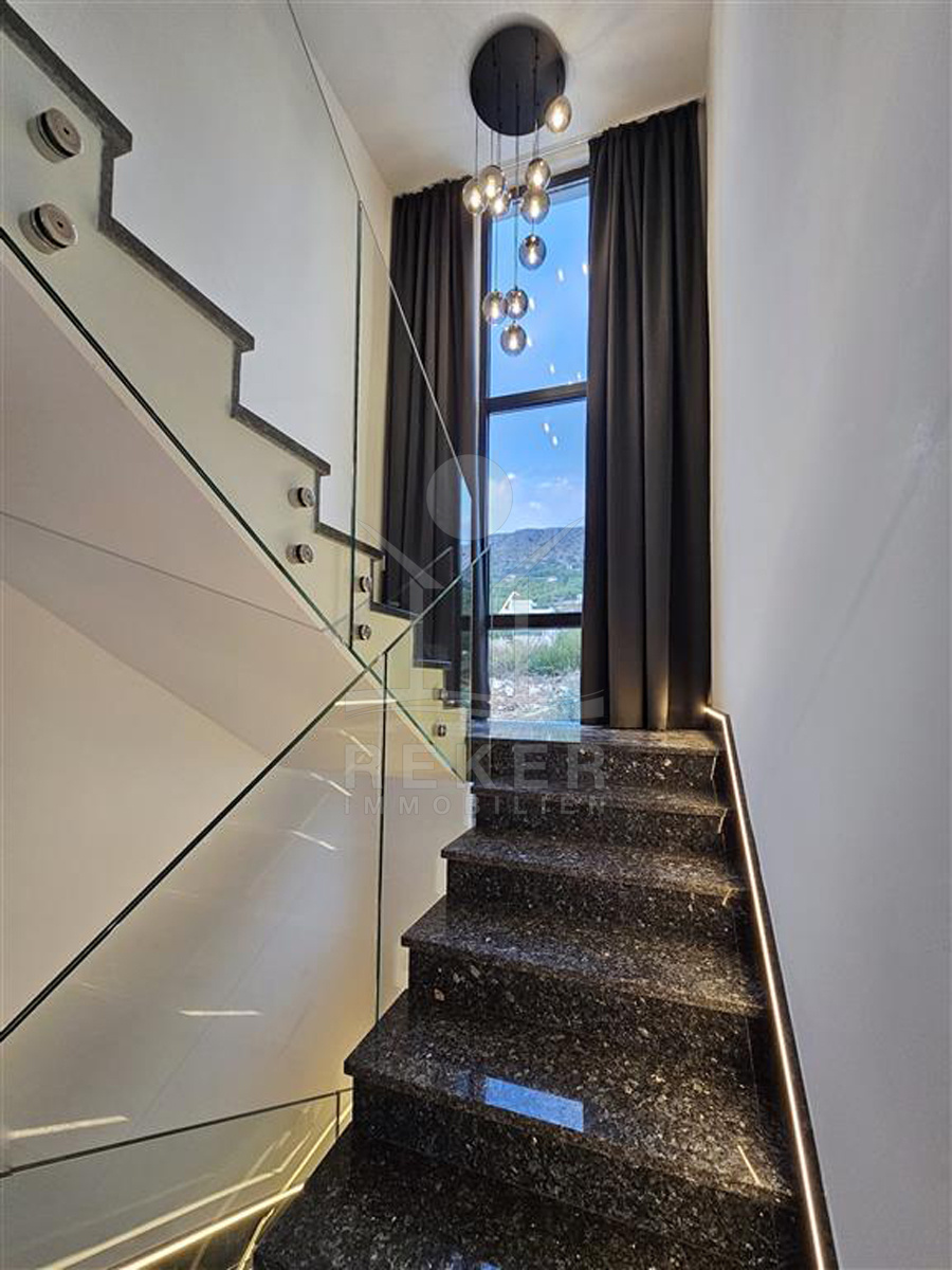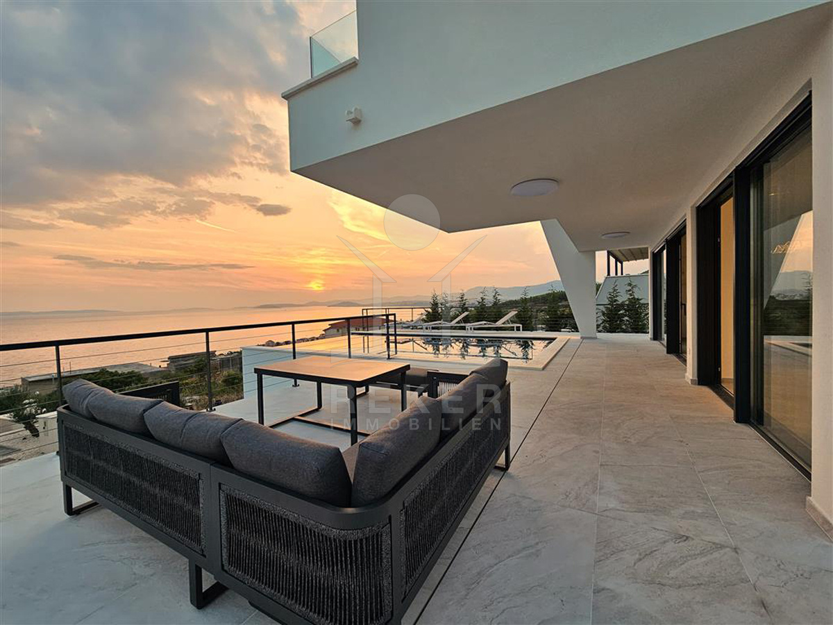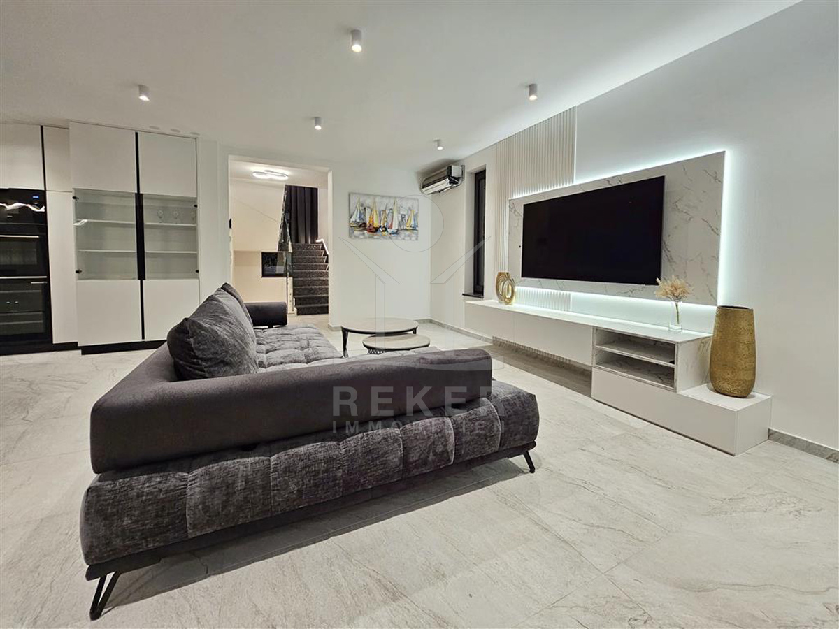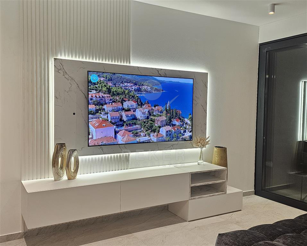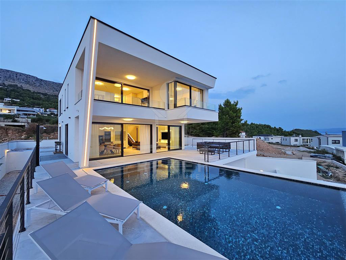 Das Anwesen liegt auf einem 910 m² großen Grundstück in Hanglage. Sie ist von wunderschönen kaskadenförmigen Gärten umgeben, die mit Olivenbäumen und dalmatinische Pflanzen bepflanzt wird. Das Gebäude erstreckt sich über 3 Etagen und verfügt über eine Wohnfläche von 320 m². Die Bauarbeiten und Fertigstellung sind voraussichtlich Sommer 2024 abgeschlossen. Das Haus ist mit einem Untergeschoss ausgestattet und bietet zusätzliche Räume sowie einen Wellness- und Fitnessbereich.