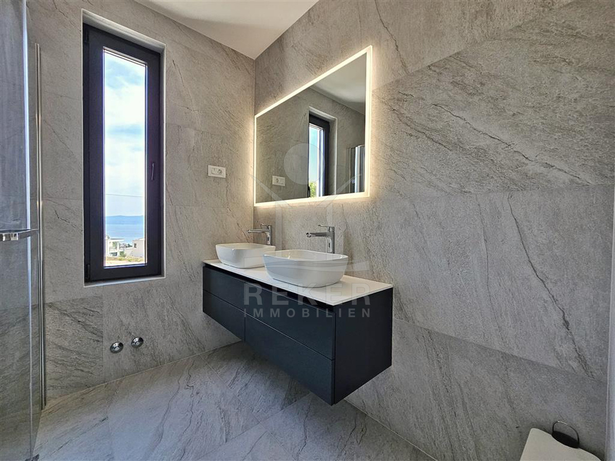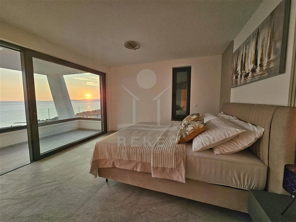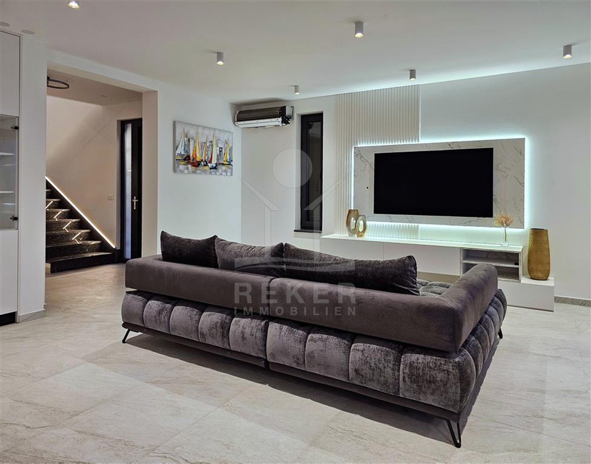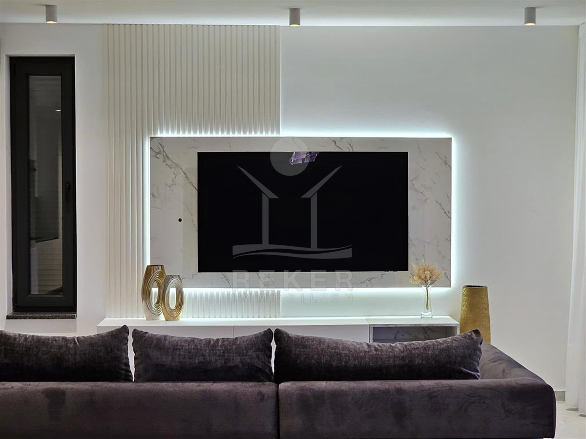 Das Anwesen liegt auf einem 910 m² großen Grundstück in Hanglage. Sie ist von wunderschönen kaskadenförmigen Gärten umgeben, die mit Olivenbäumen und dalmatinische Pflanzen bepflanzt wird. Das Gebäude erstreckt sich über 3 Etagen und verfügt über eine Wohnfläche von 320 m². Die Bauarbeiten und Fertigstellung sind voraussichtlich Sommer 2024 abgeschlossen. Das Haus ist mit einem Untergeschoss ausgestattet und bietet zusätzliche Räume sowie einen Wellness- und Fitnessbereich.