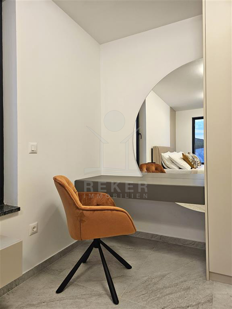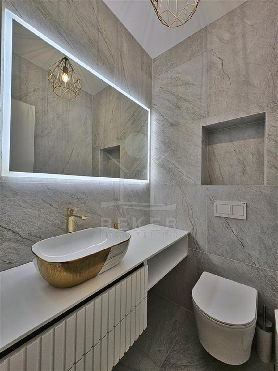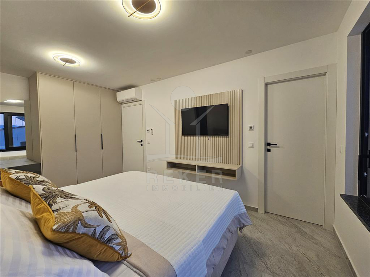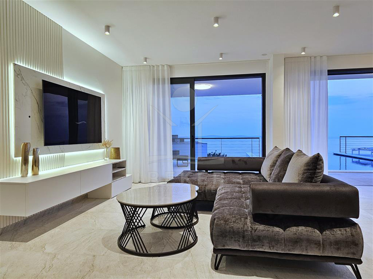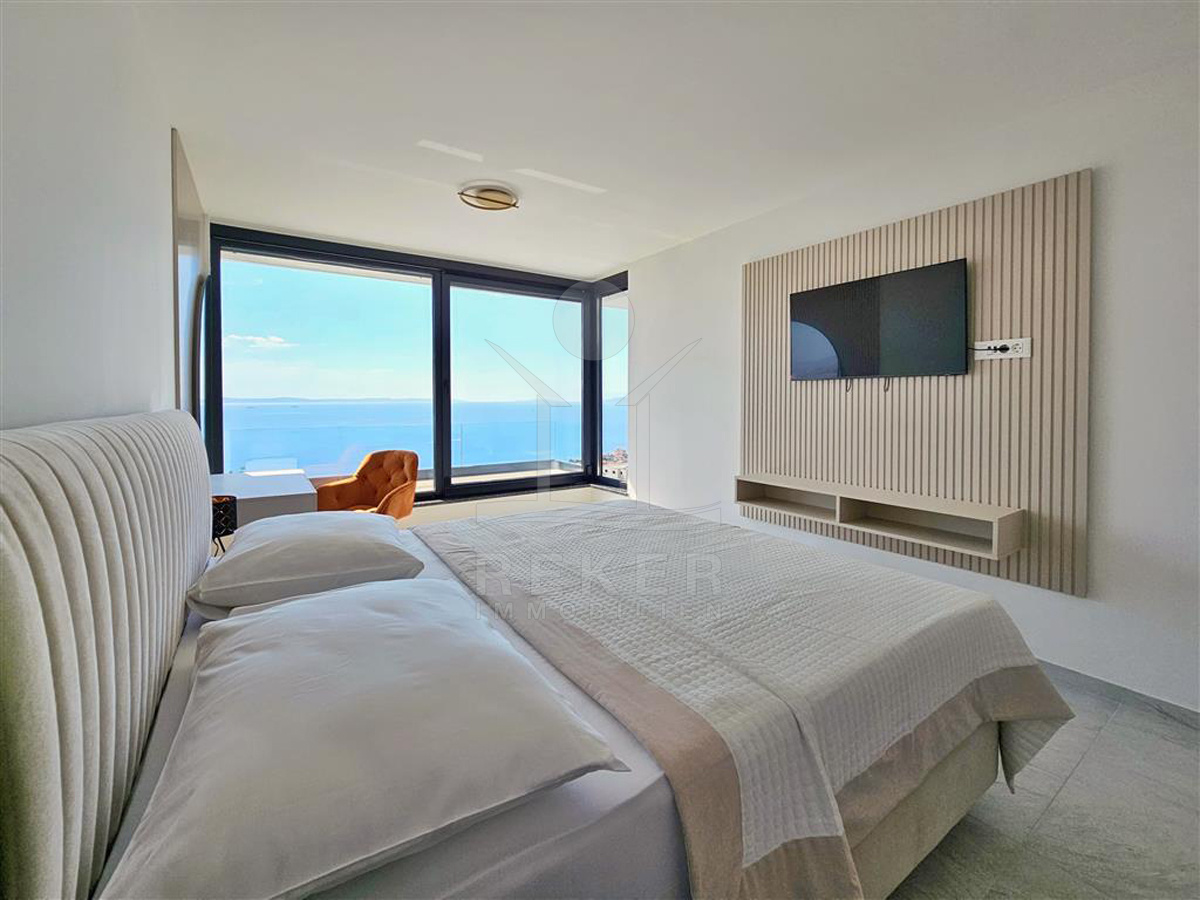 Das Anwesen liegt auf einem 910 m² großen Grundstück in Hanglage. Sie ist von wunderschönen kaskadenförmigen Gärten umgeben, die mit Olivenbäumen und dalmatinische Pflanzen bepflanzt wird. Das Gebäude erstreckt sich über 3 Etagen und verfügt über eine Wohnfläche von 320 m². Die Bauarbeiten und Fertigstellung sind voraussichtlich Sommer 2024 abgeschlossen. Das Haus ist mit einem Untergeschoss ausgestattet und bietet zusätzliche Räume sowie einen Wellness- und Fitnessbereich.