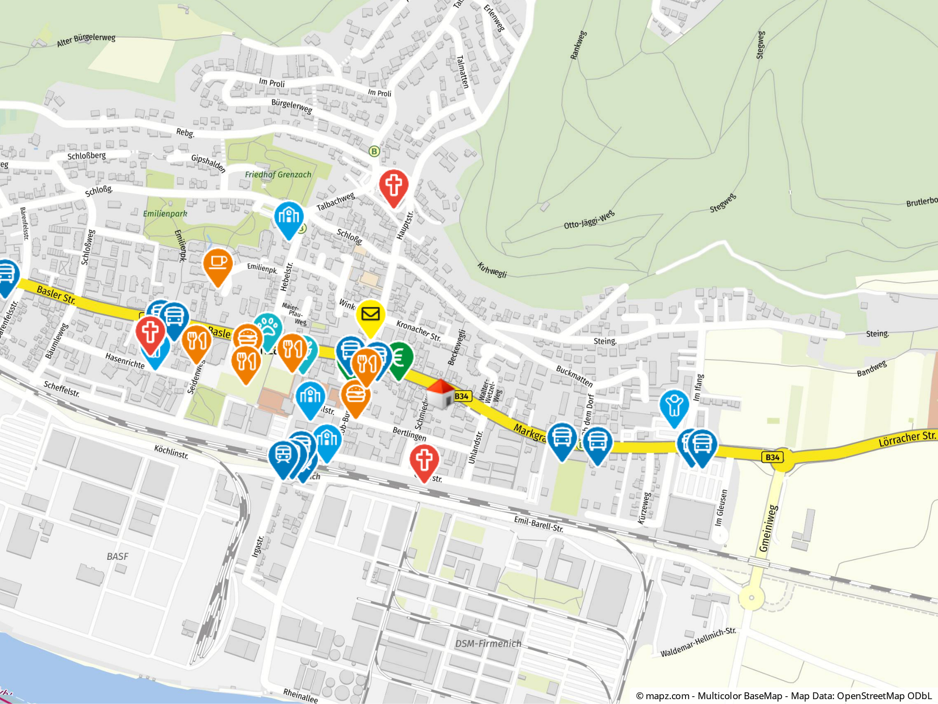 Ein kurzer Spaziergang von etwa zehn Minuten führt Sie zum Grenzacher Hallenbad und dem beliebten Lebensmittelladen Allnatura. Auch Einkaufsmöglichkeiten wie Lidl und Hieber Markt sowie eine Vielzahl von Restaurants sind nur einen Katzensprung entfernt. Familien profitieren von der Nähe zu Grundschulen und Kindergärten, während die Realschule in Wyhlen bequem mit dem Bus in wenigen Minuten erreichbar ist.