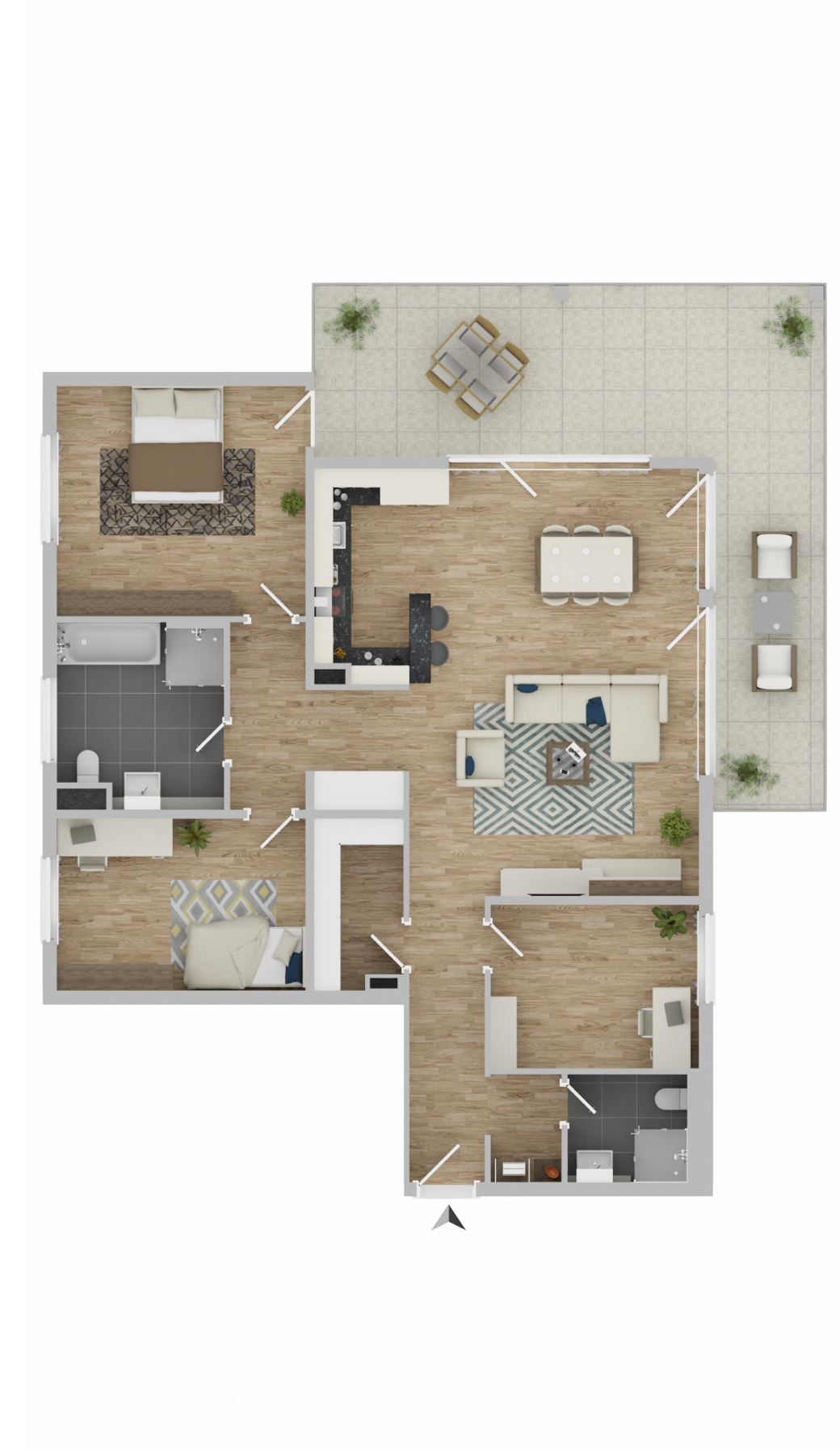 Wohnraum Wohnraum mit Küche W3Küche Schlafzimmer 3 Schlafzimmer 1 Schlafzimmer 2 Bad1 Balkon Geolyzer KartenausschnittLageplanGrundriss mit Beispiel MöbelnFrontansicht Haus