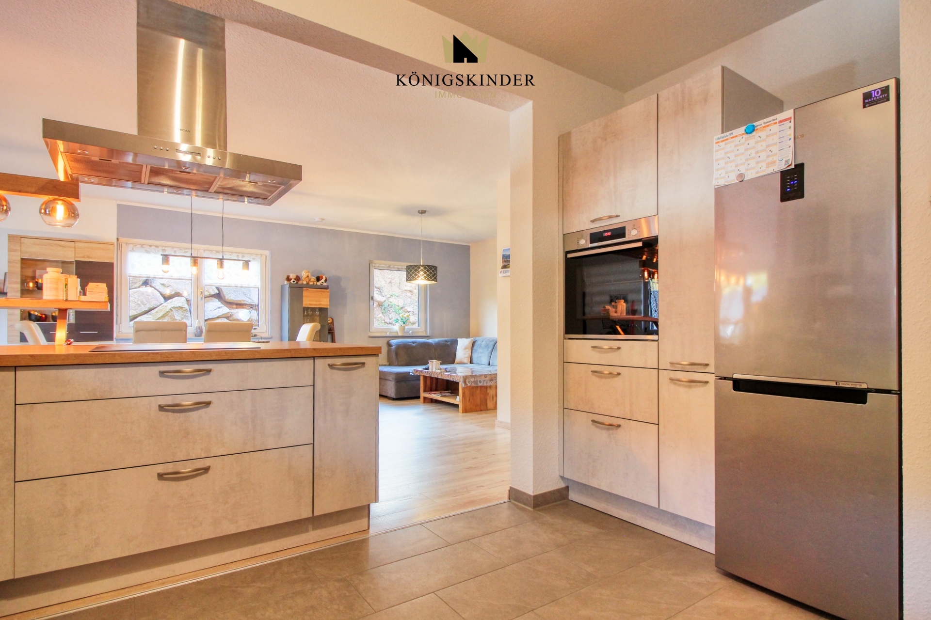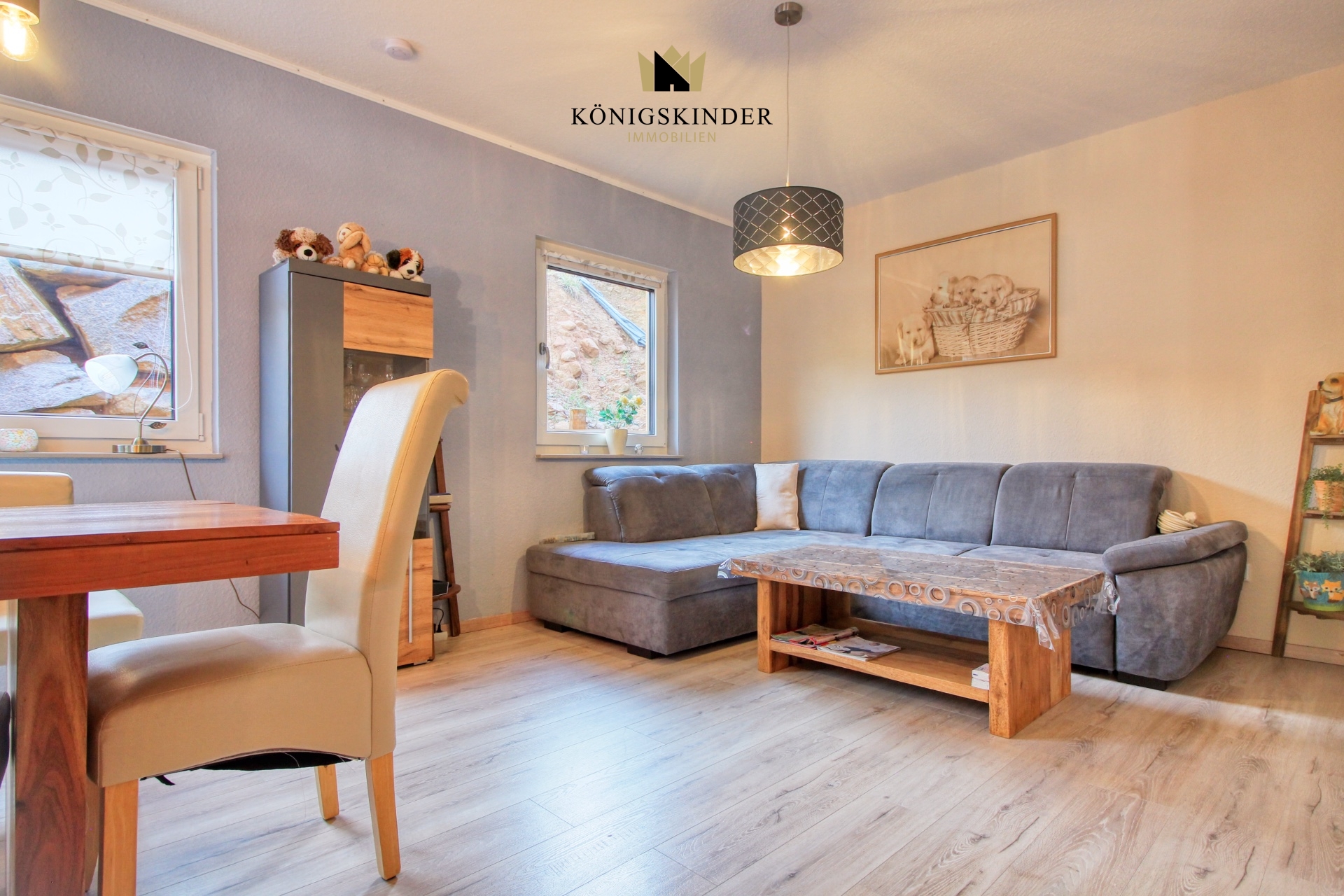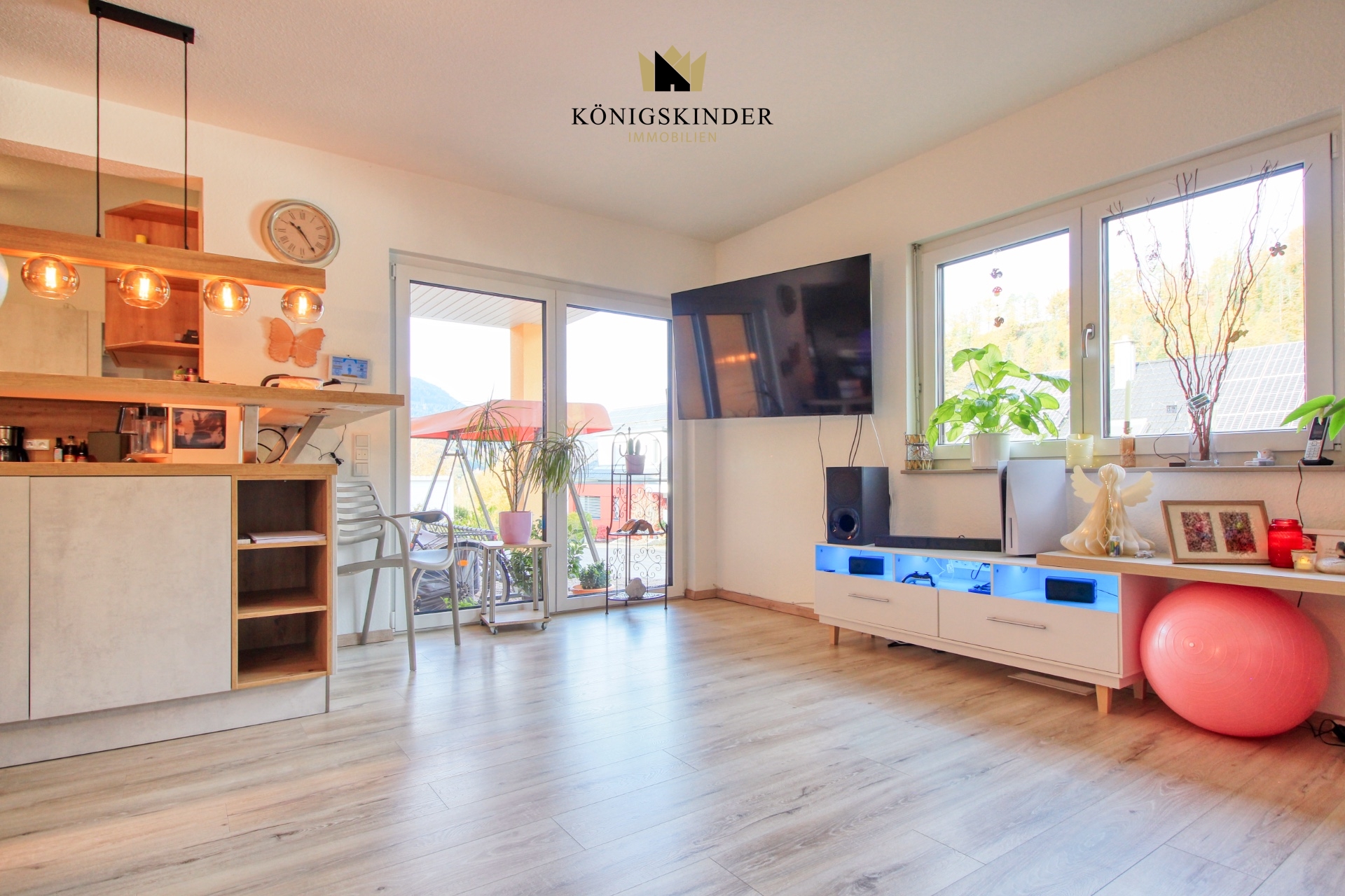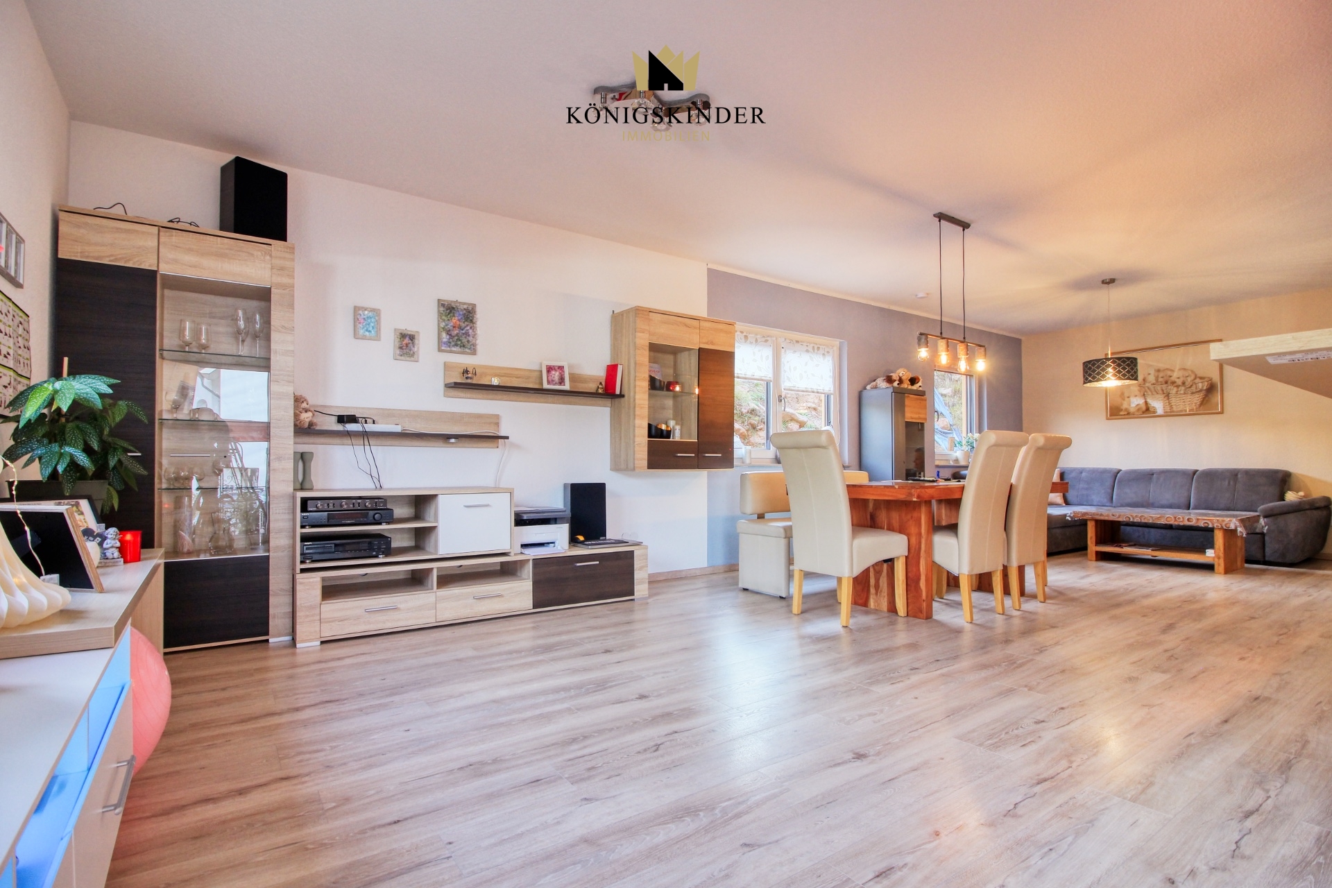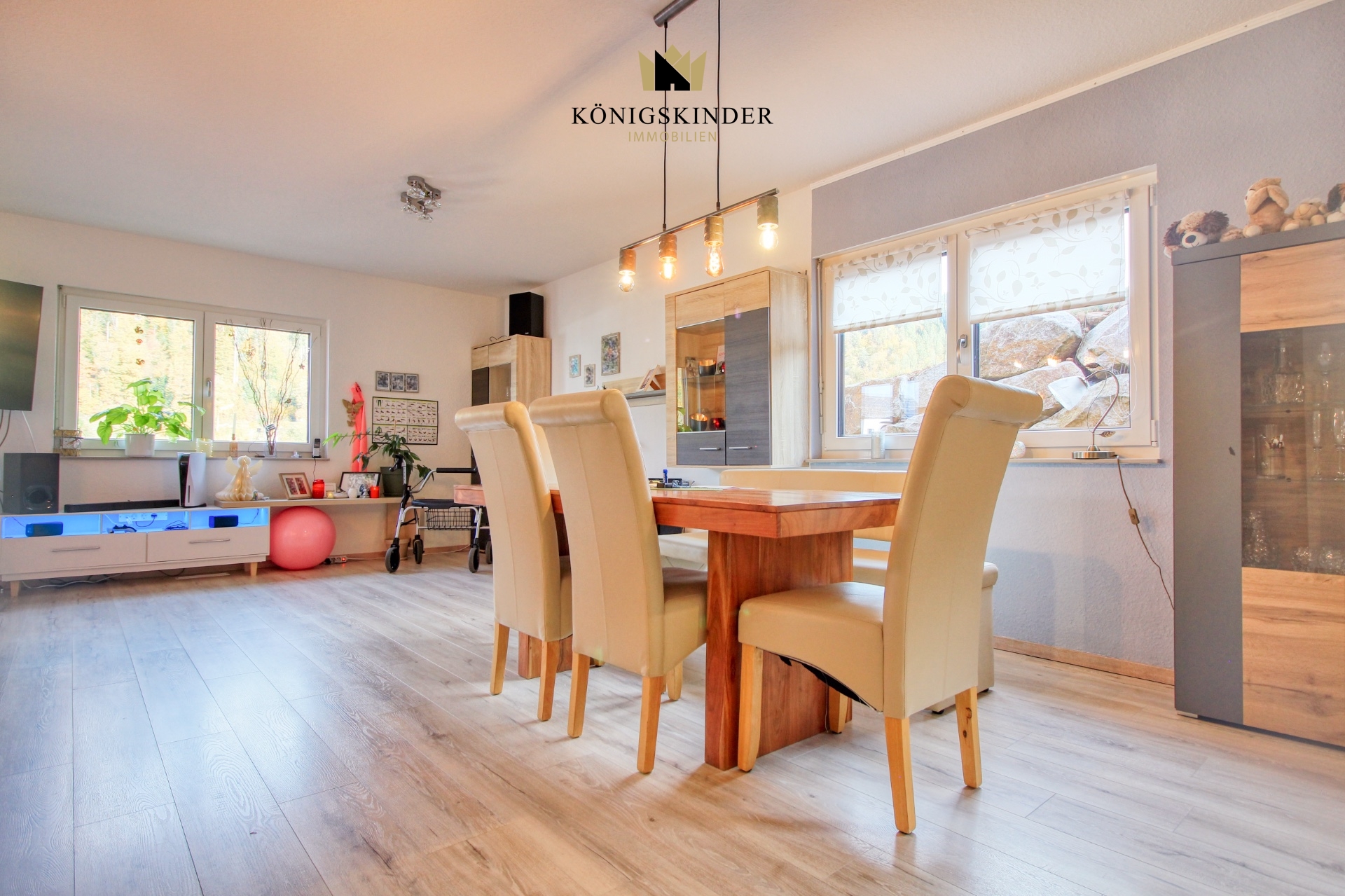 Der lichtdurchflutete Wohn- und Essbereich mit seinen großzügigen Fensterfronten schafft eine warme, einladende Atmosphäre und öffnet sich direkt zur Terrasse. Hier entsteht ein wunderbarer Ort, um Familie und Freunde zu empfangen, oder einfach die Ruhe zu genießen.