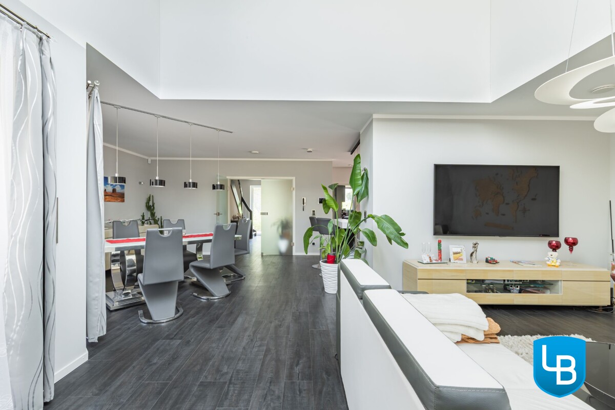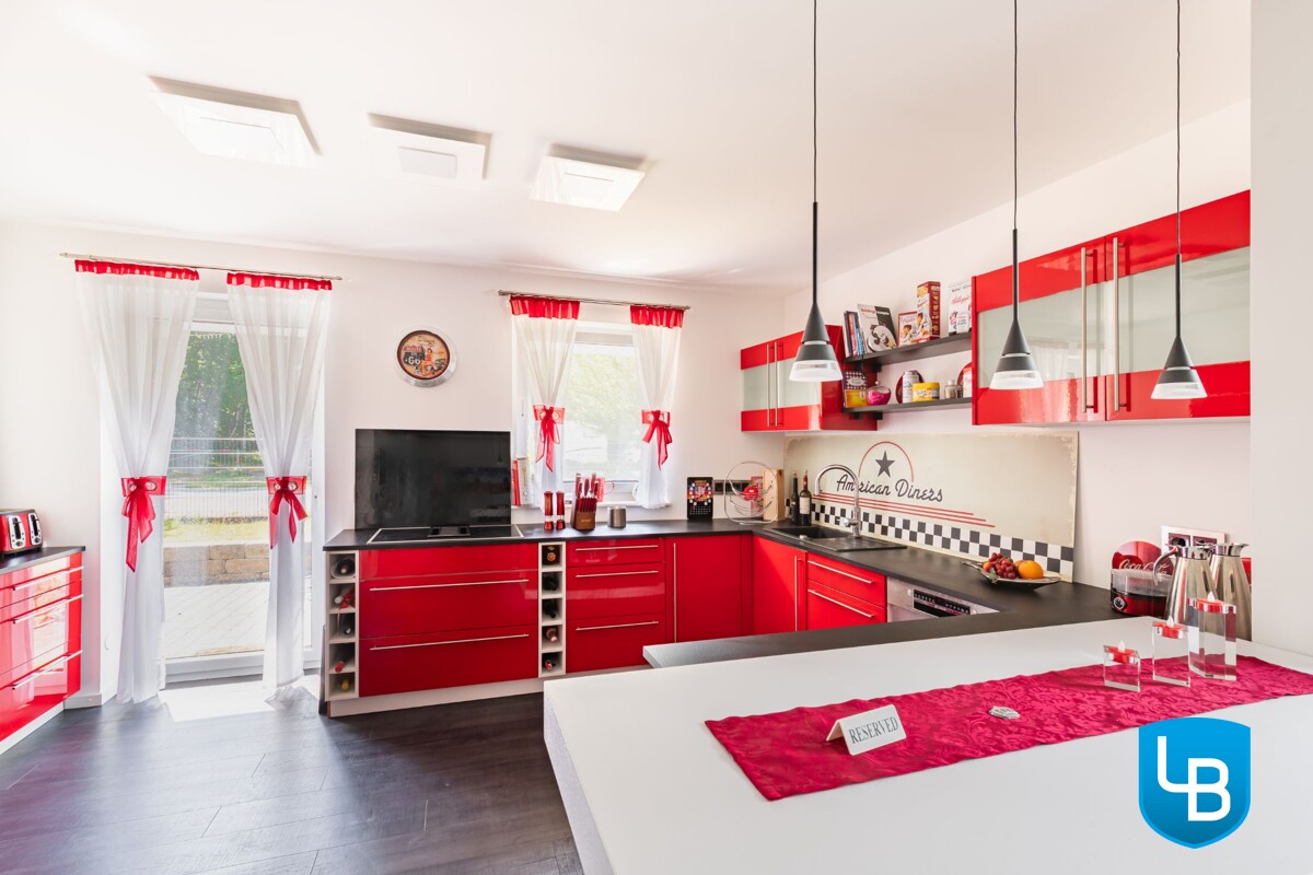 Im Inneren begeistert das Haus mit einem durchdachten Grundriss und einer hellen, offenen Atmosphäre. Der großzügige Wohn-, Ess- und Küchenbereich bildet das Herzstück – erreichbar über elegante Glas-Flügeltüren und mit direktem Zugang zur teils überdachten Terrasse. Großflächige Fenster, auch in der Dachschräge, lassen viel Tageslicht herein und schaffen ein angenehmes Wohnklima. Ein besonderer Blickfang ist die rote Designküche, die nicht nur stilvoll gestaltet, sondern auch praktisch durch ihren Zugang zum Außenbereich ist.
