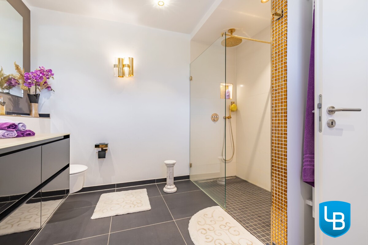 Zwei großzügige Schlafzimmer, jeweils mit eigenem Bad en Suite, bieten hohen Komfort und Privatsphäre. Das Hauptbad beeindruckt mit einer bodengleichen Dusche, edlen Goldarmaturen und einer insgesamt eleganten Ausstattung. Ergänzt wird das Raumangebot durch ein separates Gäste-WC, einen Hauswirtschaftsraum mit Küchenzeile, Heiztechnik und Waschmaschinenanschluss sowie praktischen Stauraum unter der Treppe.
