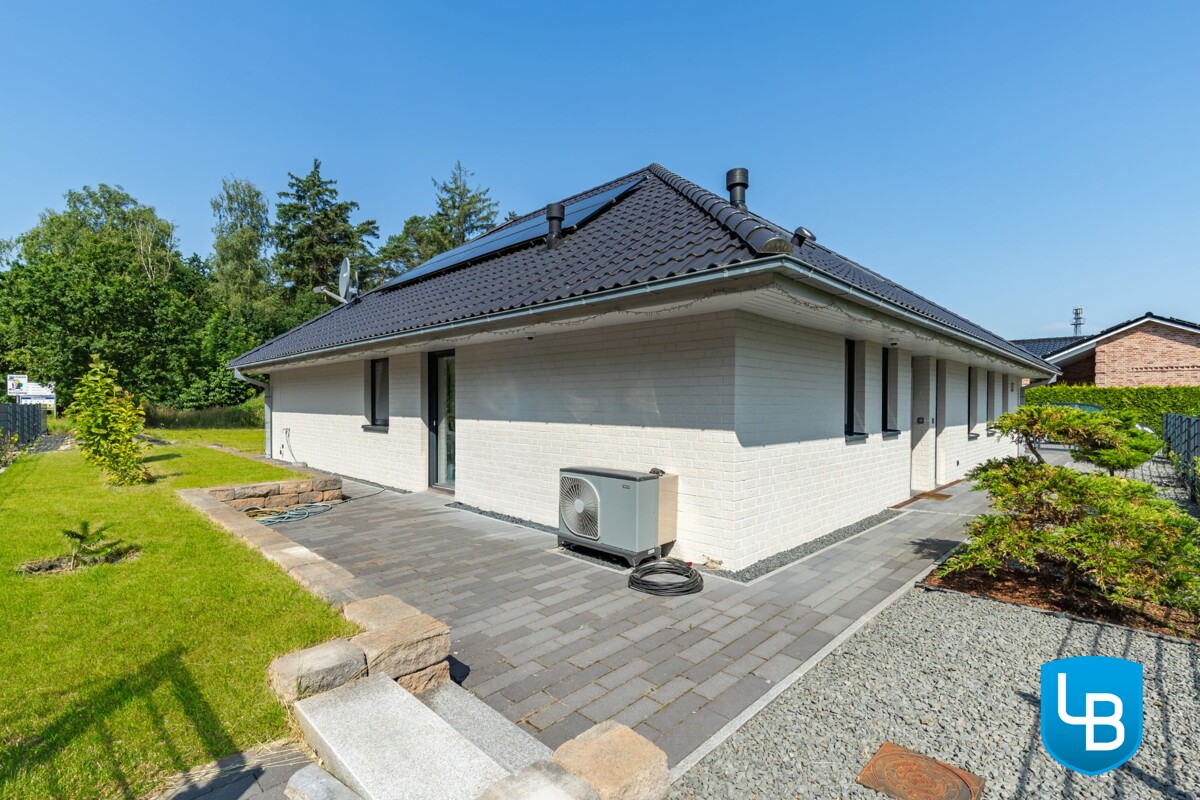 Zur hochwertigen Ausstattung zählen eine effiziente Luft-Wasser-Wärmepumpe, elektrische Außenrollläden und ein Alarmsystem im Erdgeschoss. Der Außenbereich präsentiert sich gepflegt mit einem umlaufenden, gepflasterten Weg und einer stilvoll angelegten Terrasse.