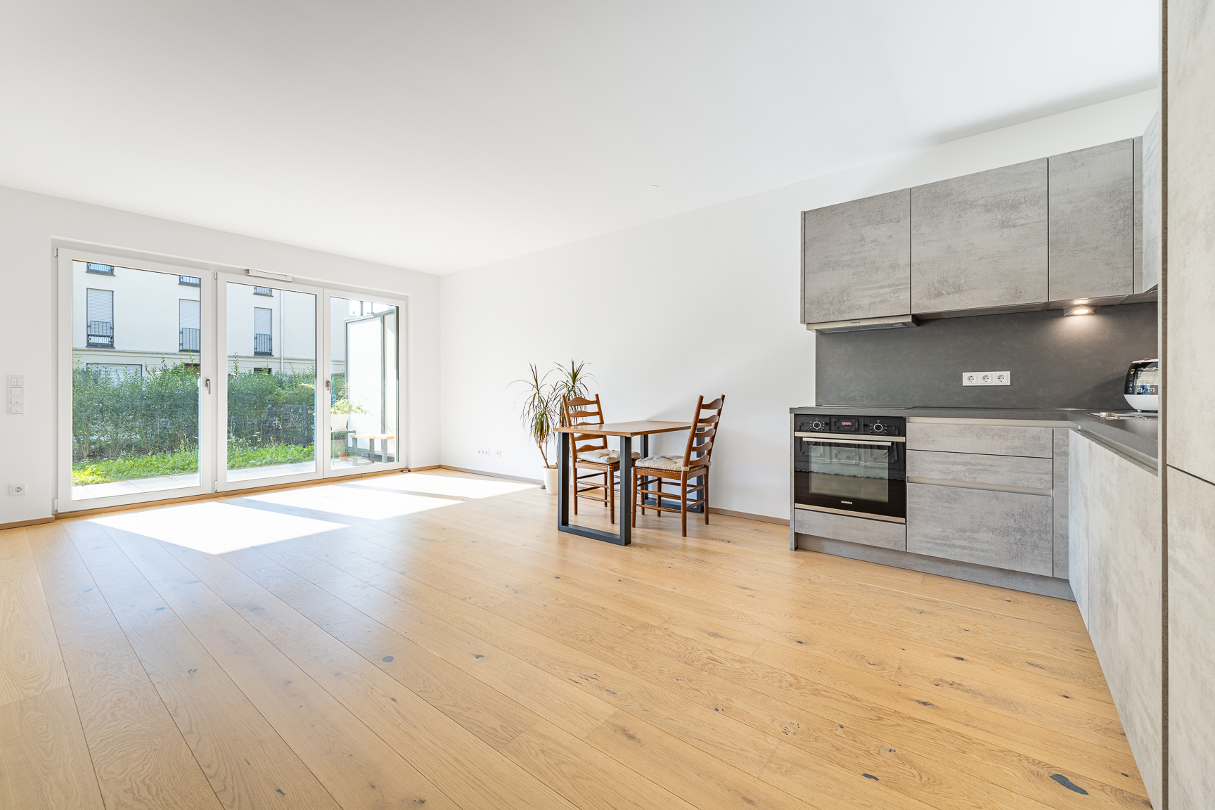Der offene Wohn- und Essbereich ist das Herzstück der Wohnung. Bodentiefe Fenster lassen viel Licht herein und öffnen den Raum zur Terrasse mit angrenzendem Garten. Hier erweitert sich das Wohnen nach draußen – ideal für entspannte Stunden an der Sonne, ein Abendessen mit Freunden oder gemütliche Grillabende. Die hochwertige Nolte-Einbauküche mit Markengeräten fügt sich nahtlos in den Wohnbereich ein und macht gemeinsames Kochen zu einem Genuss.