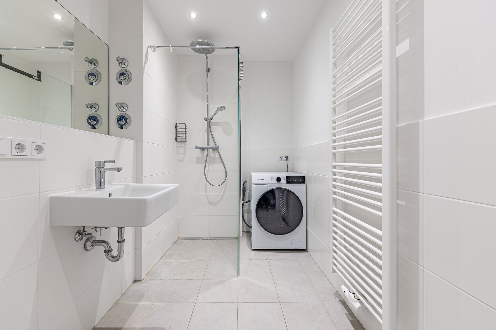 Auch die Ausstattung überzeugt in allen Details: Eichenparkett, Fußbodenheizung in allen Räumen, elektrische Rollläden, zwei geschmackvoll gestaltete Tageslichtbäder – eines mit Wanne, das andere mit bodengleicher Rainshower-Dusche – sowie ein praktischer Abstellraum in der Wohnung.