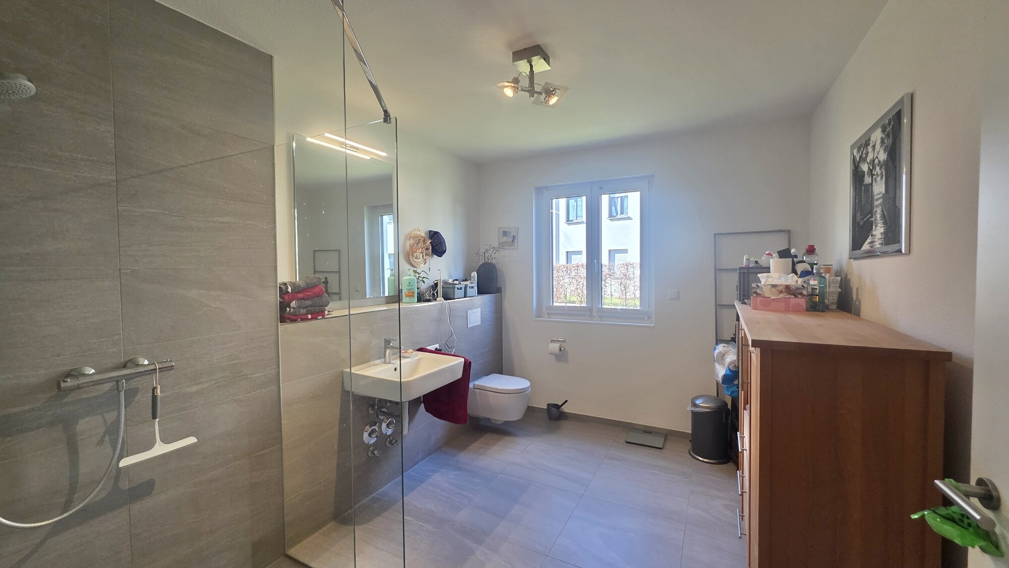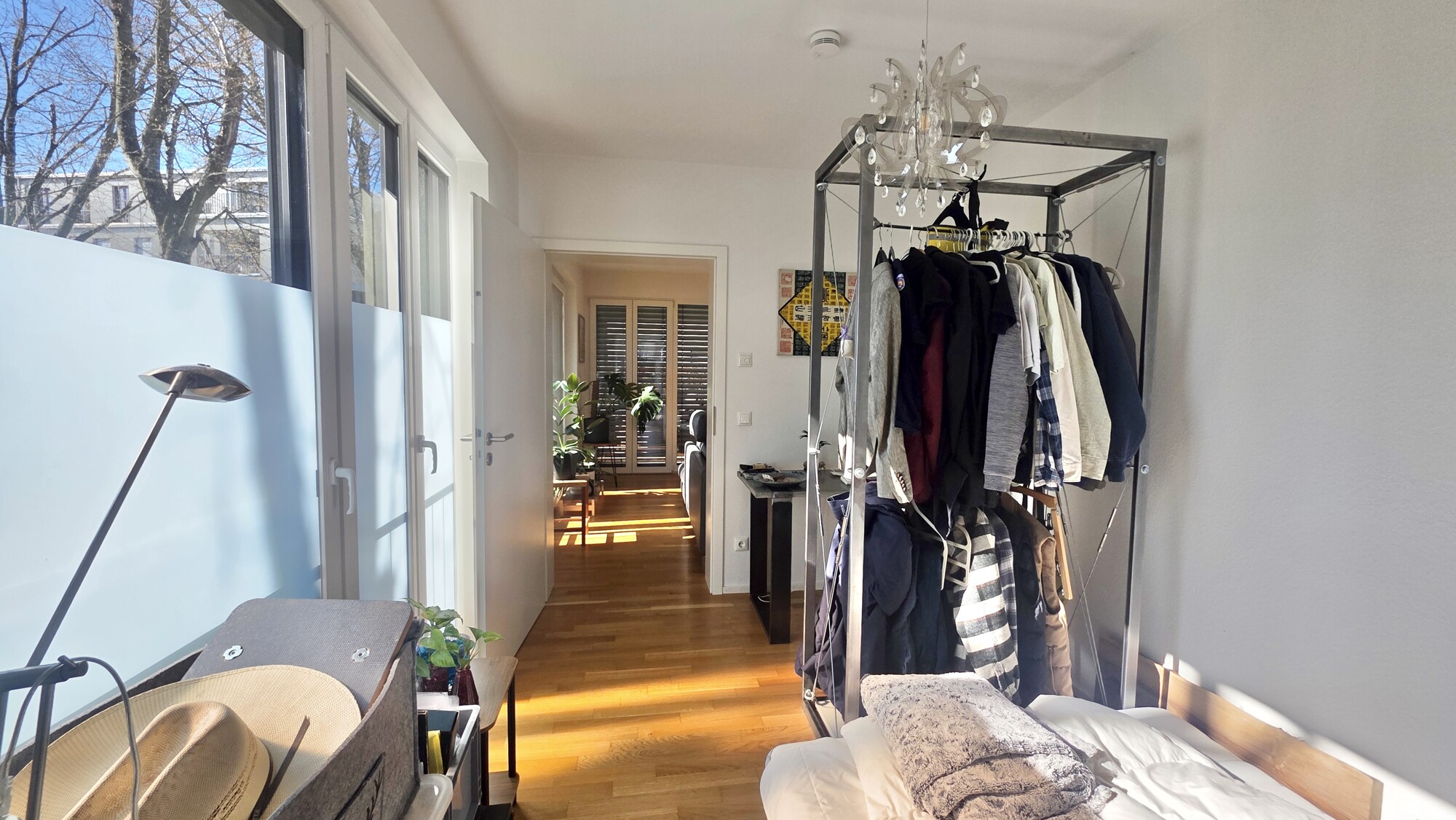 Im vorderen Bereich der Wohnung befindet sich das geräumigen Schlafzimmer sowie das große Tageslichtbadezimmer mit Waschtisch, ebenerdiger Dusche und WC.