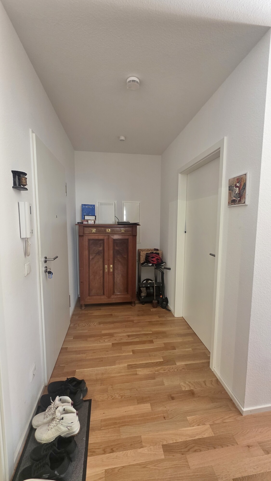 Über den Eingangsbereich des Wohnhauses gelangen Sie ebenerdig in die moderne 3-Zimmer Wohnung im EG. Ein Flurbereich bietet Platz für eine Garderobe. Ebenfalls im Flur finden Sie einen Abstellraum mit Anschlüssen für Waschmaschine und Trockner.