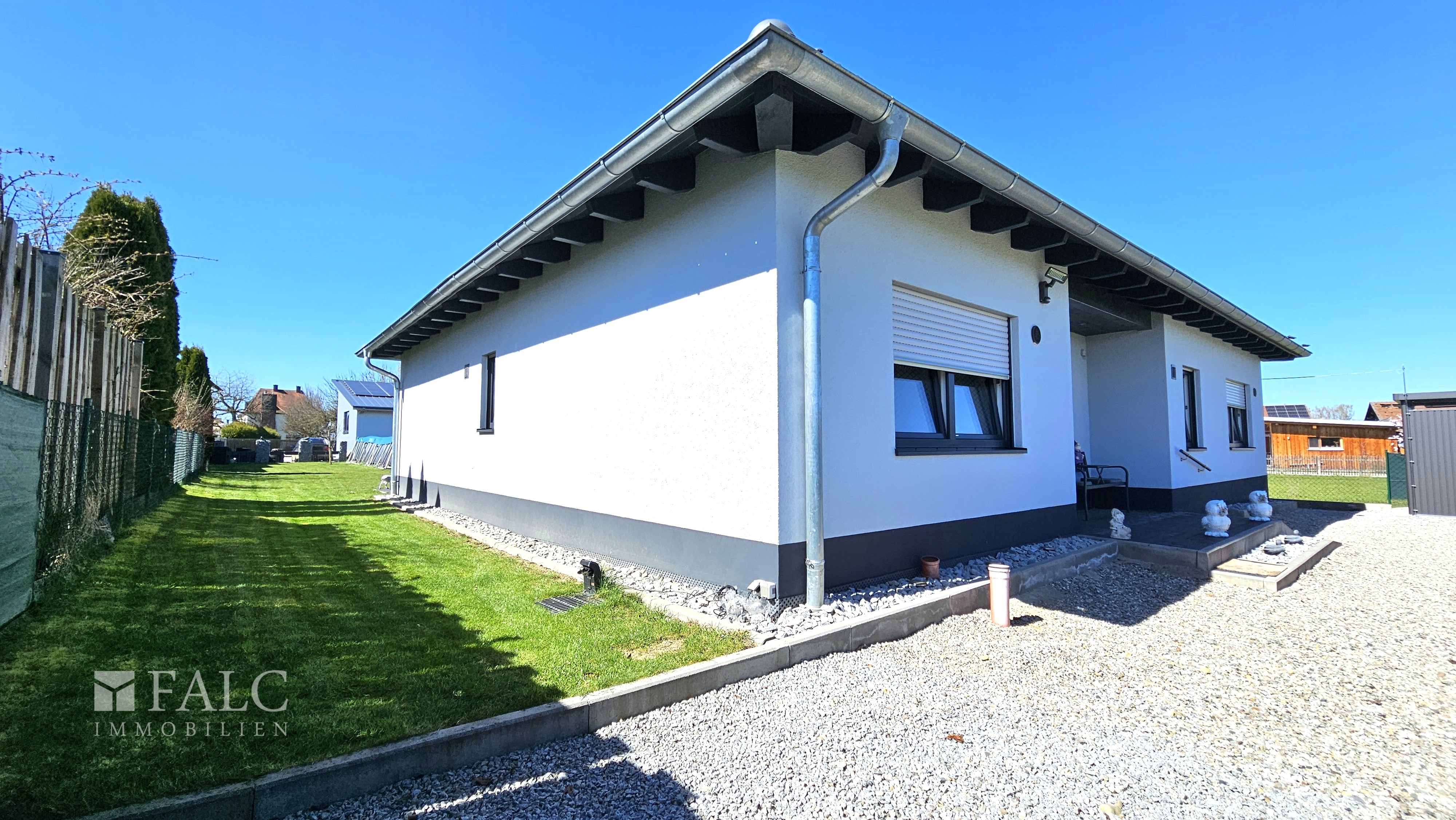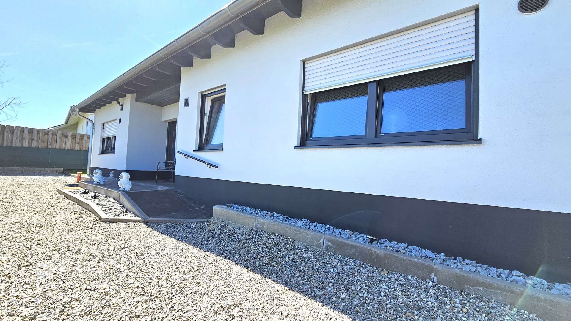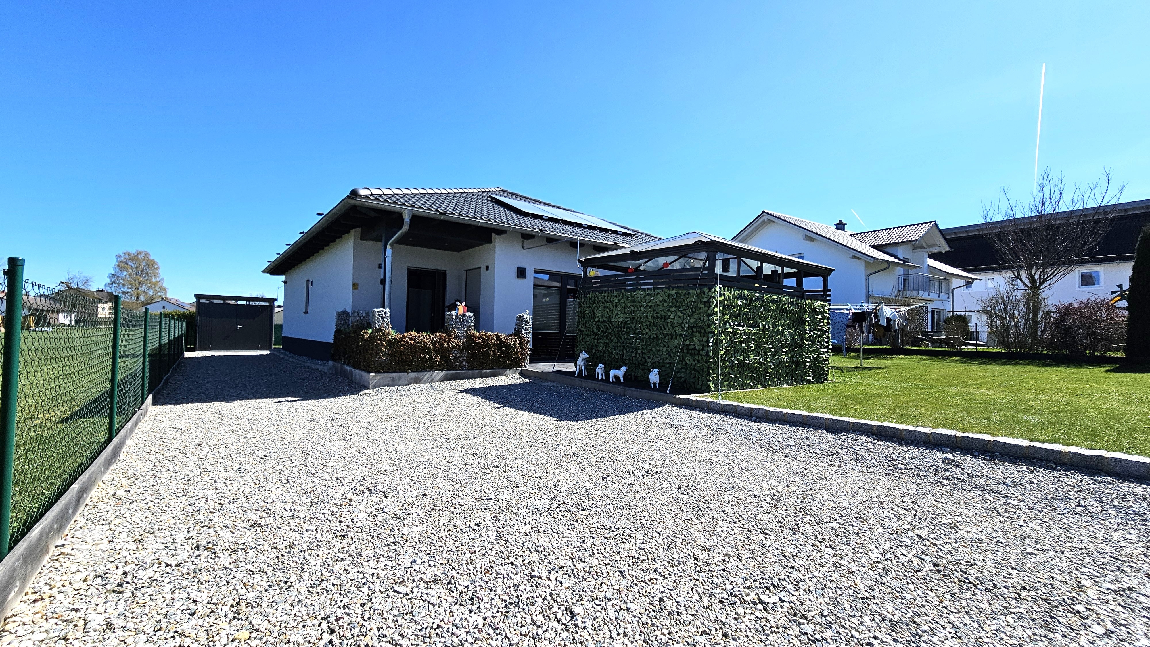 Das Haus überzeugt durch seine klare Architektur, die ebenerdige Bauweise sowie ein angenehmes Wohngefühl mit viel Licht und Offenheit. Die großzügige Terrasse lädt dazu ein, entspannte Stunden im Freien zu verbringen und erweitert den Wohnraum ideal nach draußen.