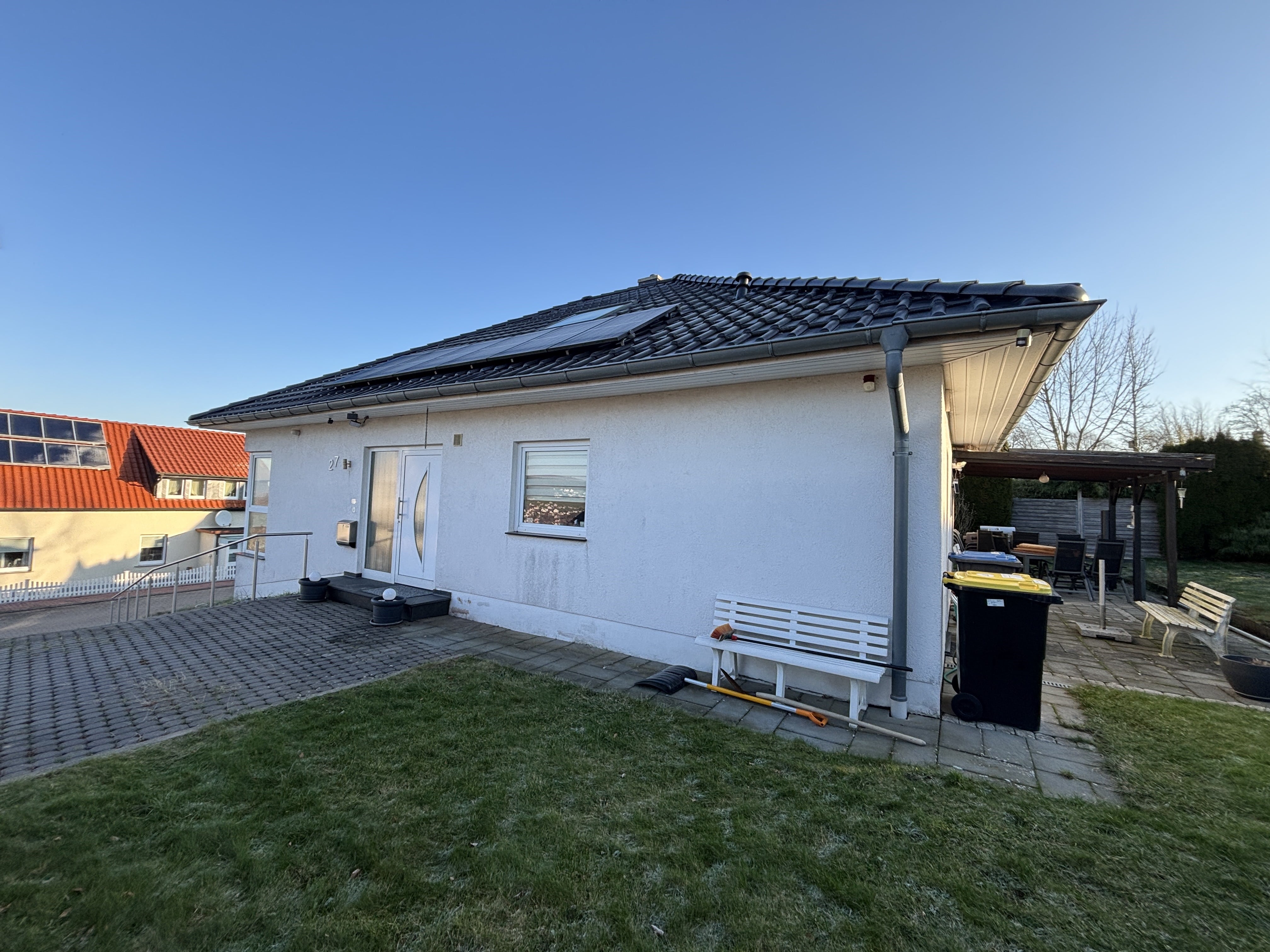 Dieser wunderschöne Bungalow in Vlotho bietet Ihnen und Ihrer Familie den perfekten Rückzugsort, um nach einem langen Tag neue Kraft zu tanken. Das Haus steht auf einem Erbpachtgrundstück, dessen Vertrag noch bis zum Jahr 2101 läuft. Es bietet eine Wohnfläche von 125,38 m², verteilt auf vier helle Zimmer, eine moderne Küche und ein Tageslicht‑Badezimmer. Sie finden ausreichend Platz für ein komfortables Familienleben. Vom Wohnzimmer und von der Küche aus gelangen Sie über eine sonnige Terrasse direkt in den liebevoll gestalteten Garten, der sich auf insgesamt 525 m² erstreckt und einen phantastischen Ausblick bietet.. Zwei praktische Stellplätze, ein Gartenhaus und eine Photovoltaikanlage runden das nachhaltige Wohnkonzept ab. Der ausgebaute Dachboden beherbergt einen Hobbyraum sowie eine zusätzliche Toilette – ideal für kreative Projekte oder als Gäste‑Suite. Lassen Sie sich von diesem einladenden Zuhause verzaubern und genießen Sie das harmonische Zusammenspiel von Komfort, Funktionalität und umweltfreundlicher Ausstattung.