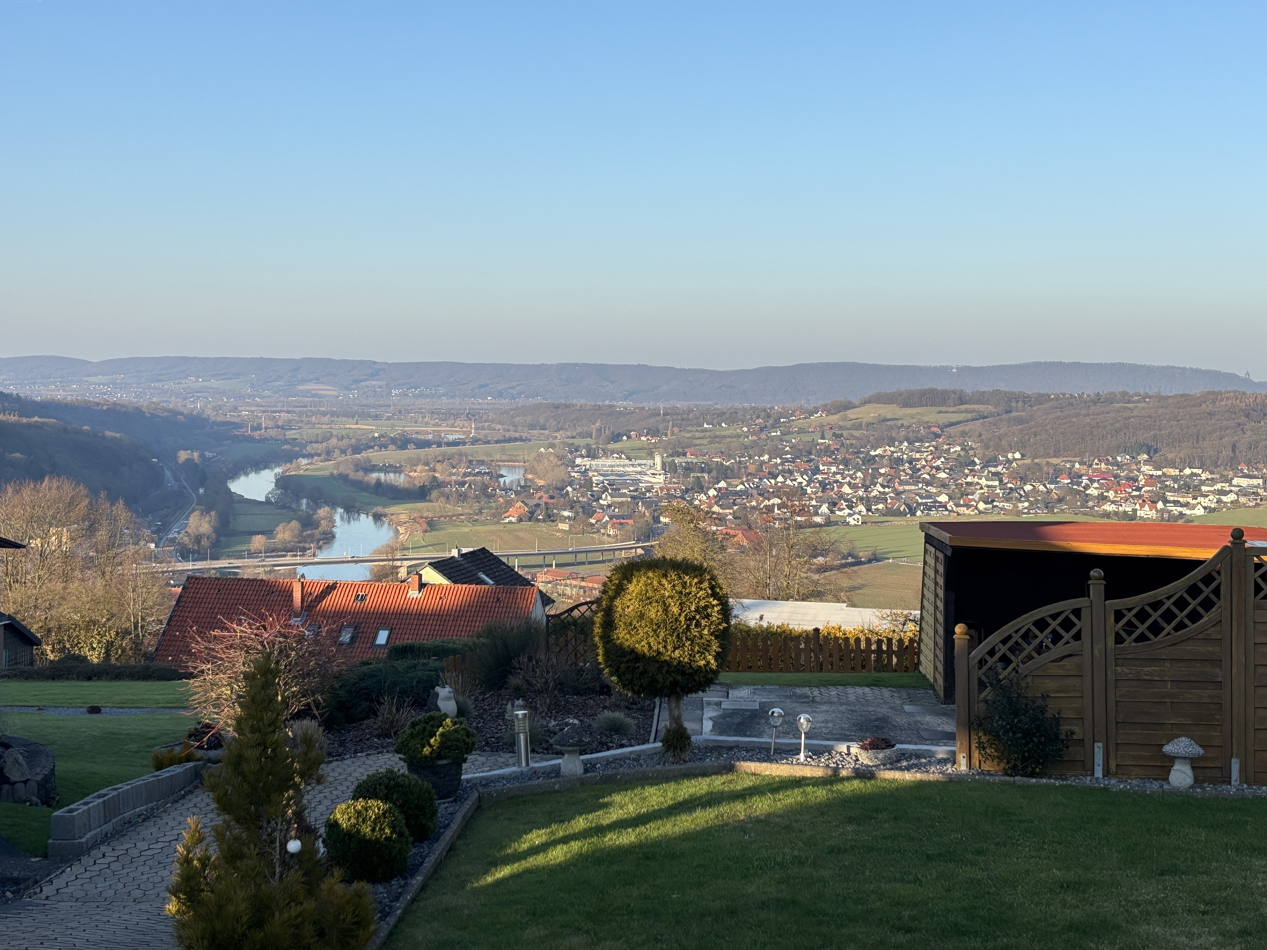 Der Bungalow befindet sich auf einem fast rechteckigen Grundstück mit Hanglage in der ruhigen Kleinstadt Vlotho, einer ostwestfälischen Stadt im Lipper Bergland mit annähernd 18.500 Einwohnern. Die Immobilie liegt rund 1 km südöstlich vom Stadtzentrum entfernt und bietet eine gute Anbindung an öffentliche Verkehrsmittel, mit einer Bushaltestelle in unmittelbarer Nähe und der Zugstation rund 1,6 km entfernt. In der Nähe finden Sie verschiedene Einkaufsmöglichkeiten, wie Supermärkte, Bäckereien und einen Baumarkt. Zudem sind Schulen, Kindergärten, medizinische Einrichtungen und verschiedene Freizeiteinrichtungen, wie ein Wasserpark und ein Fitnessstudio, in der Umgebung leicht erreichbar. Durch die zentrale Lage und gute Infrastruktur bietet diese Immobilie eine hervorragende Möglichkeit, ein ruhiges und abwechslungsreiches Leben in Vlotho zu führen.