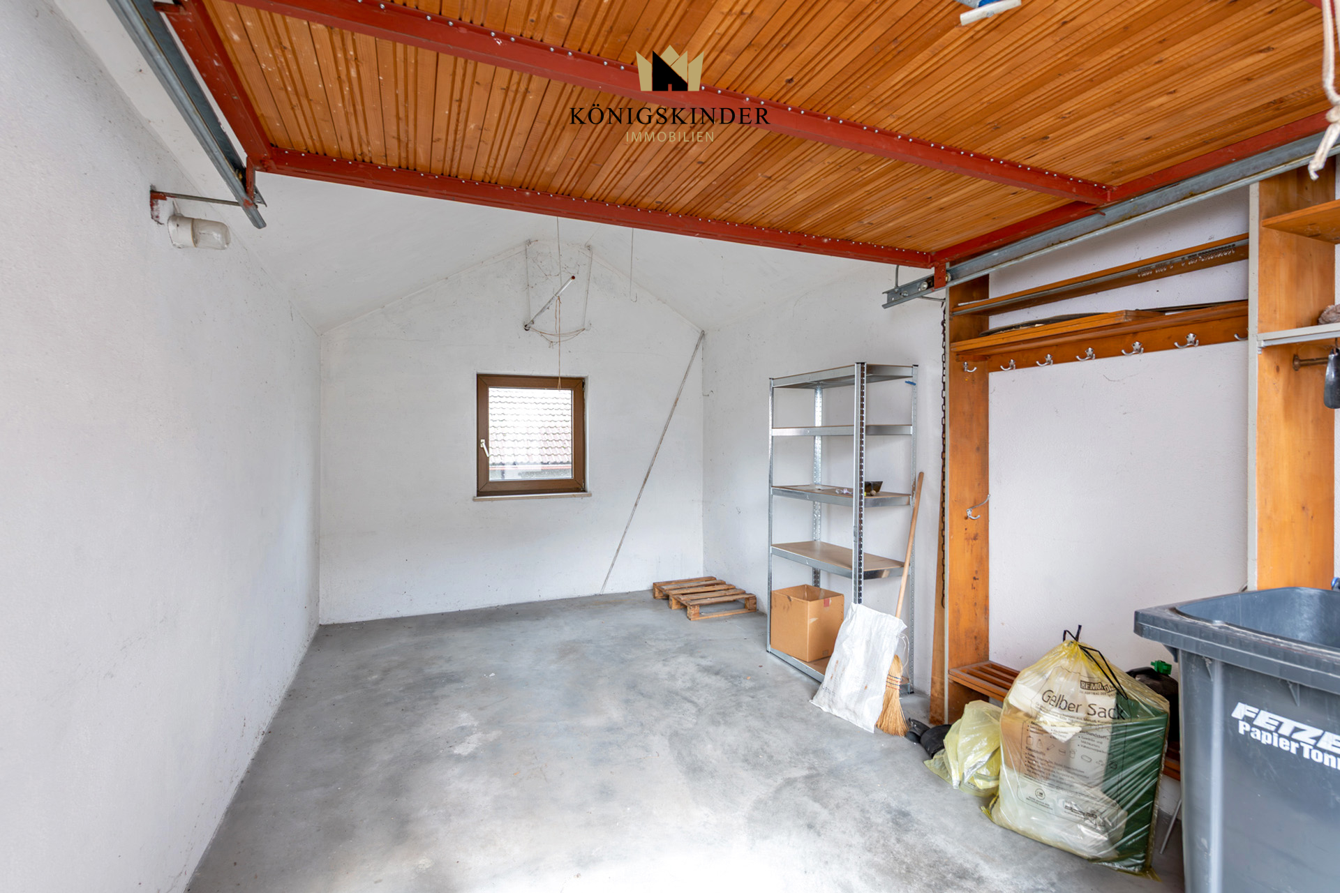 Daran angebaut ist eine zweigeschossige Garage, die sowohl von der Eingangsseite, als auch von der Hofseite befahren werden kann.