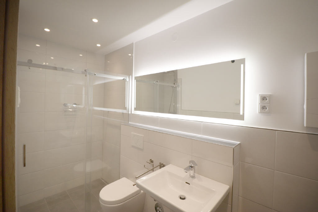 Als besonderes Highlight verfügt das Bad über eine schicke, bodengleiche Walk-In-Dusche mit eleganter Glasabtrennung. Hänge-WC, Waschtisch und Heizkörper beschreiben die restliche Ausstattung.