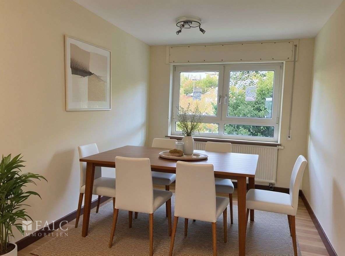 Das angrenzende Esszimmer lädt zu geselligen Abenden mit Familie und Freunden ein. Die Küche ist funktional gestaltet und bietet ausreichend Platz für kulinarische Entfaltung. Ein besonderes Highlight ist der Zugang zum Balkon, der an warmen Tagen zusätzlichen Wohnraum im Freien bietet.