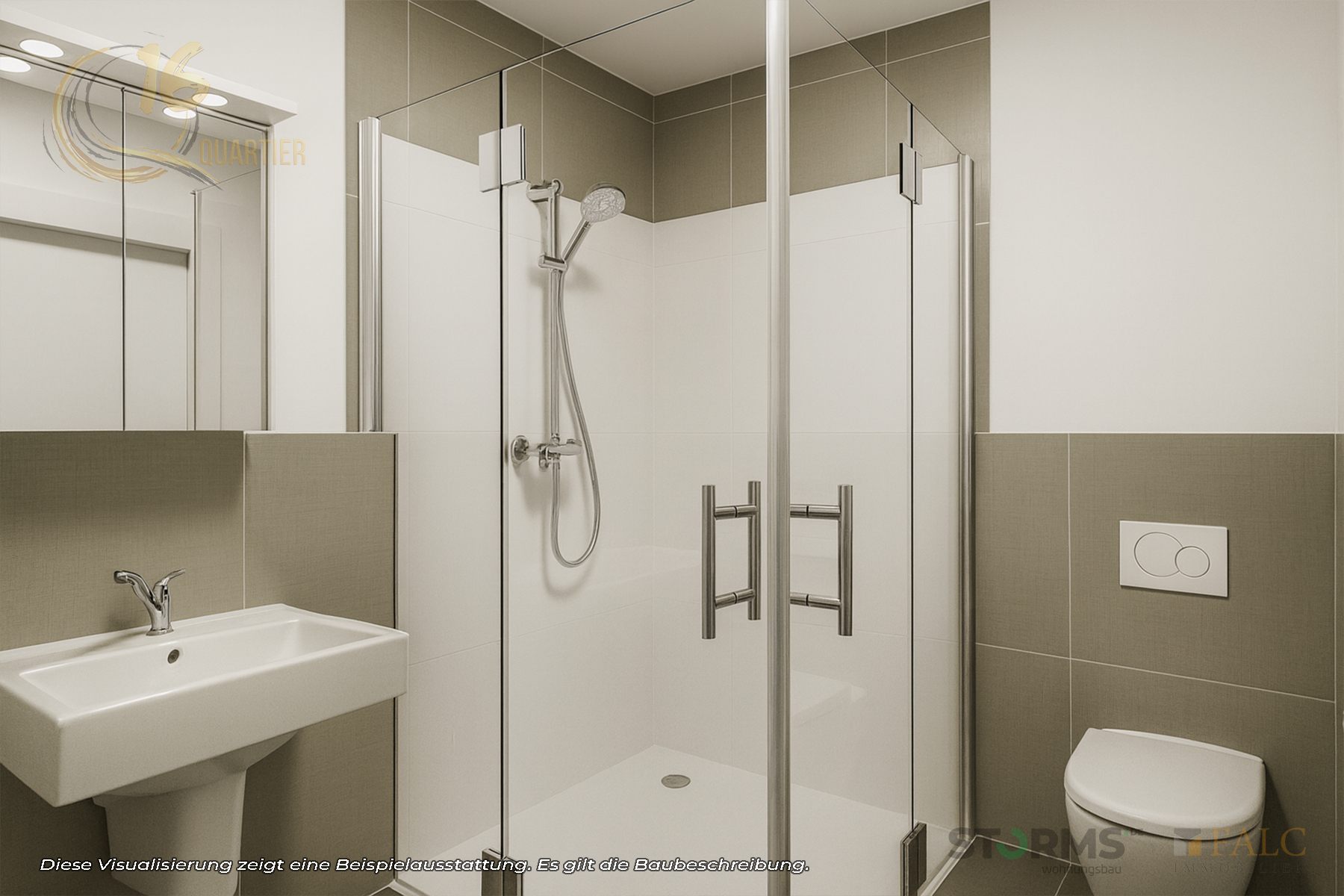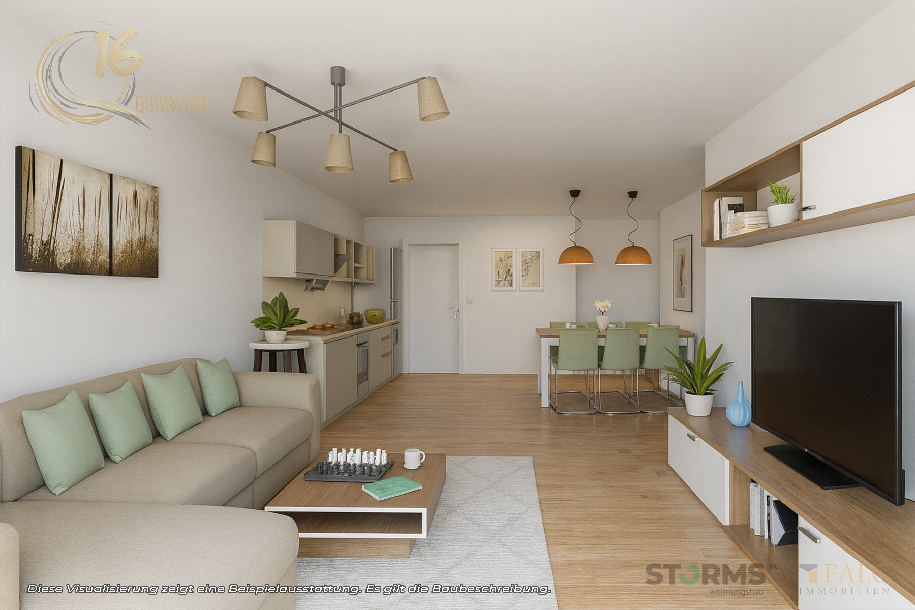 Die Wohnung ist mit einem offen geplanten Wohn-/Essbereich samt Küche konzipiert. Das Schlafzimmer ist separat gelegen. Ergänzend sind ein Hauswirtschaftsraum sowie ein separates Gäste-WC vorgesehen, wodurch zusätzliche Alltagstauglichkeit entsteht.