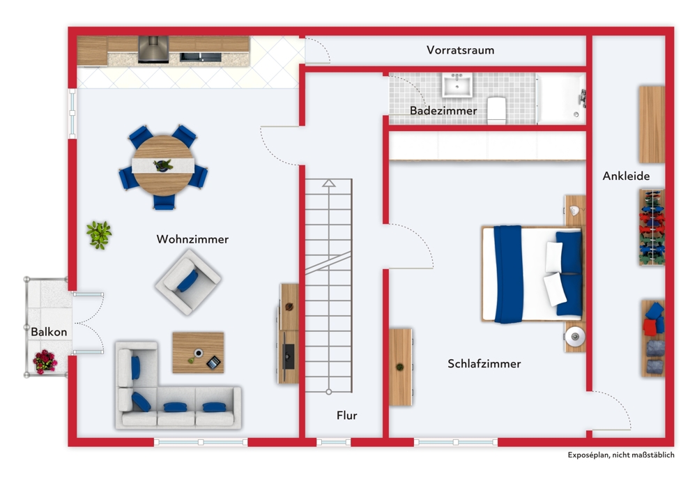 Das Erdgeschoss besteht aus Flur, Wohn-/Esszimmer mit Balkon und offenem Küchenbereich, Speisekammer, Bad mit Dusche, einem Schlafzimmer und Abstellraum.
