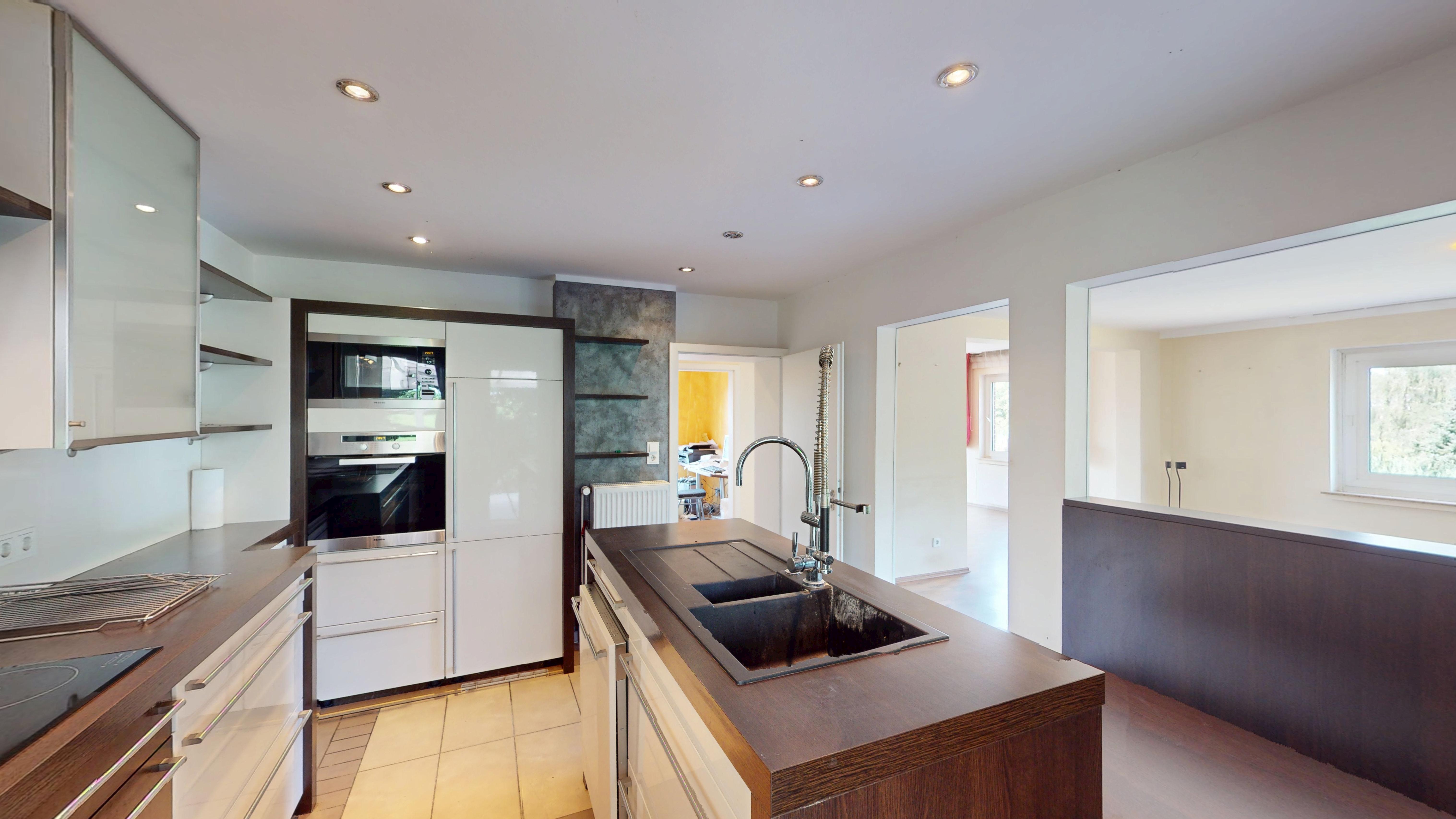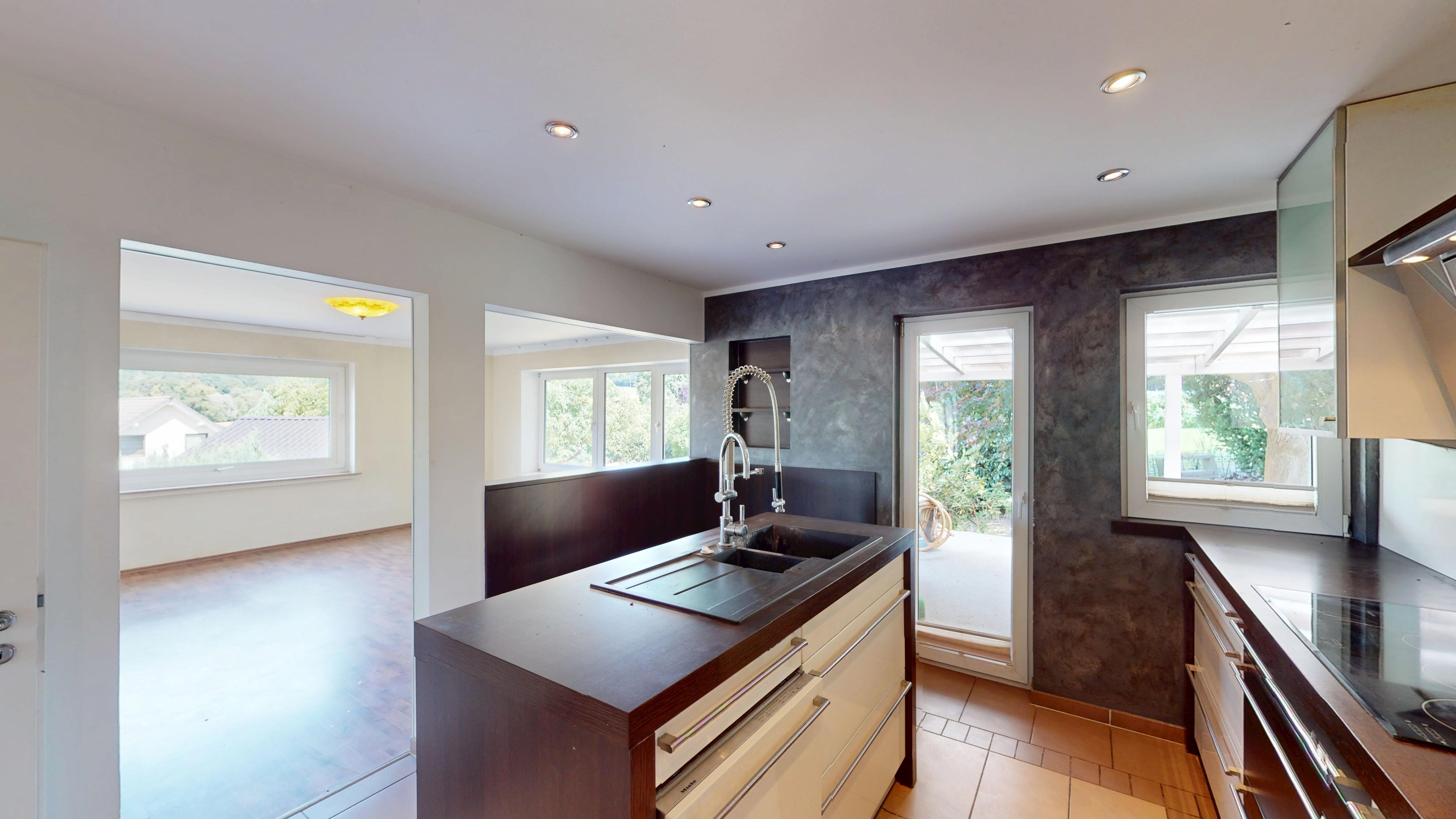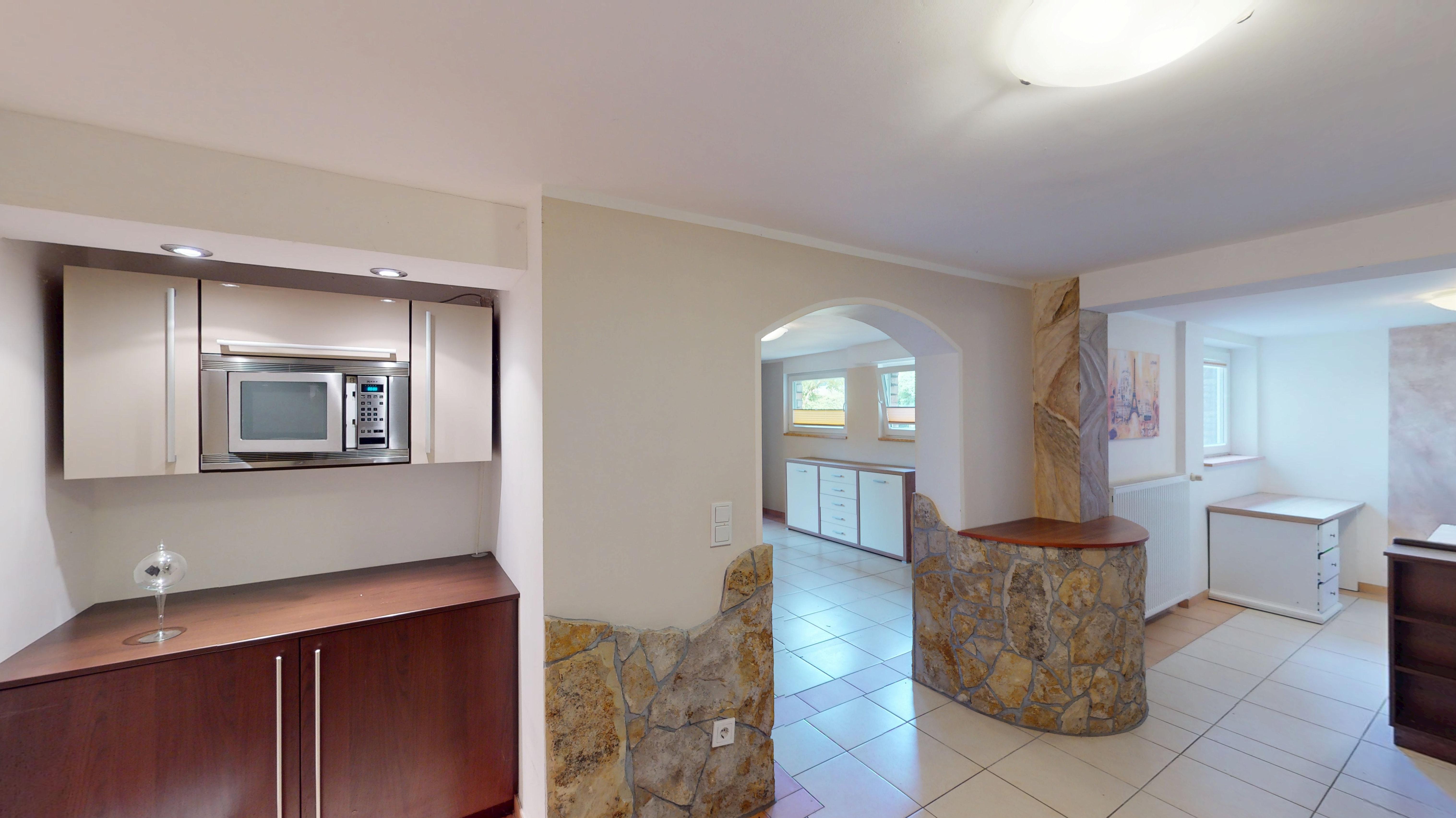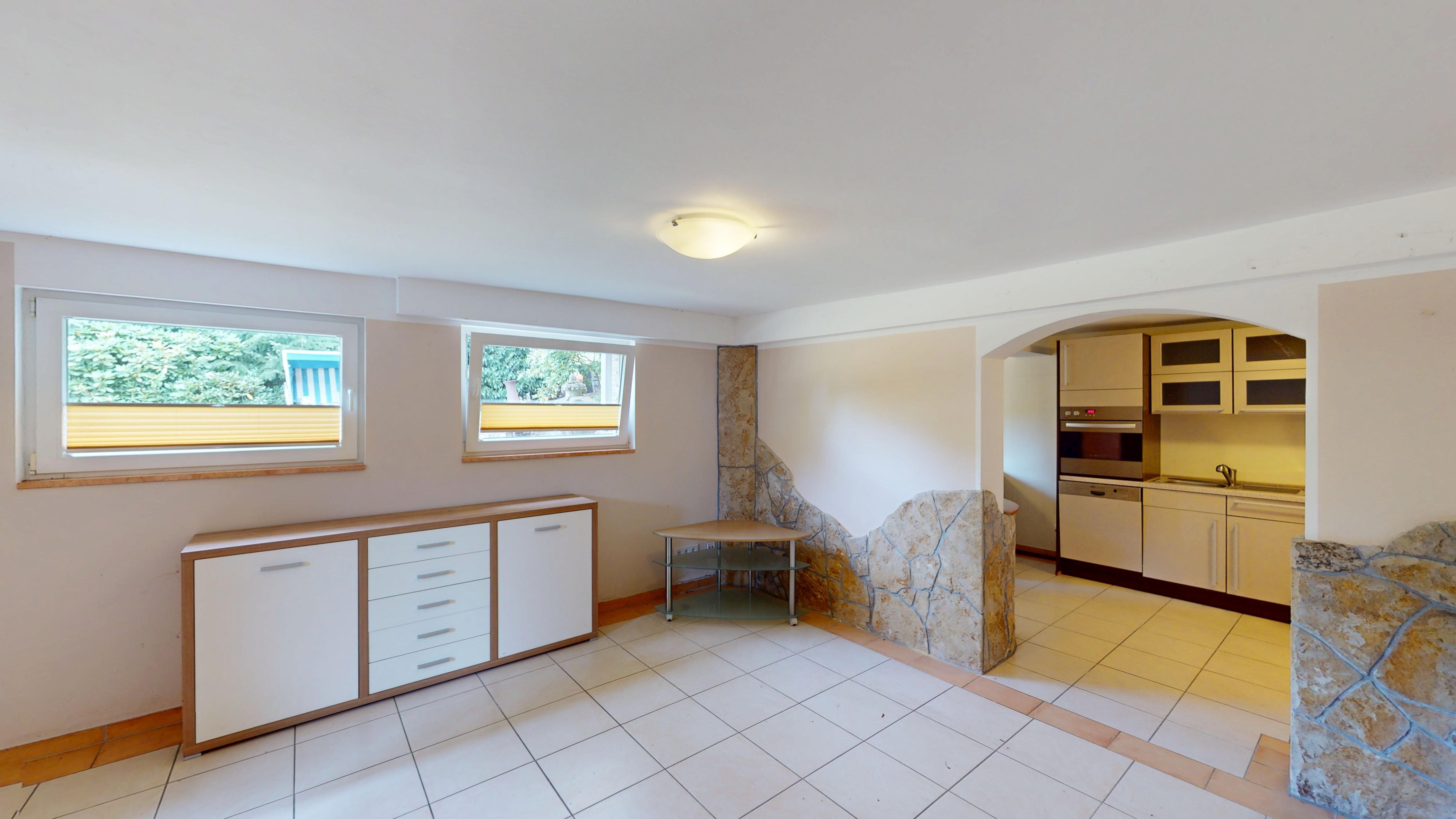 Der ausgebaute Keller eröffnet weitere Möglichkeiten: eine gemütliche Küche mit Sitzgelegenheit, ein Badezimmer, mehrere großzügige Räume für Gäste, Hobby oder Home-Office sowie ein direkter Zugang zur integrierten Tiefgarage und in den Gartenbereich. Grundsätzlich handelt ers auch hierbei um eine komplett ausgebaute Wohneinheit – lediglich ein paar cm hinsichtlich der Deckenhöhe fehlen, um diesen Bereich als offizielle Wohnfläche ausweisen zu können.