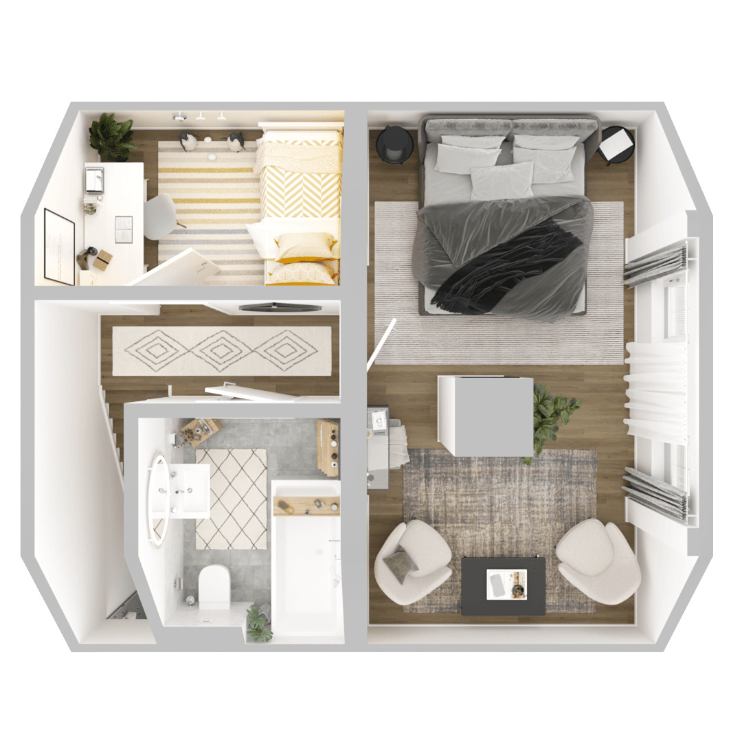 Im Obergeschoss verteilen sich zwei weitere helle Zimmer und ein modernes Wannenbad. Die Räume sind freundlich gestaltet, mit weißen Wänden und modernen Fußböden, wodurch ein zeitloses und einladendes Ambiente entsteht. Eines der Schlafzimmer verfügt auch hier über einen separaten Kamin, sodass hier ebenfalls eine behagliche Atmosphäre möglich ist. Der Spitzboden bietet zusätzlichen Stauraum.