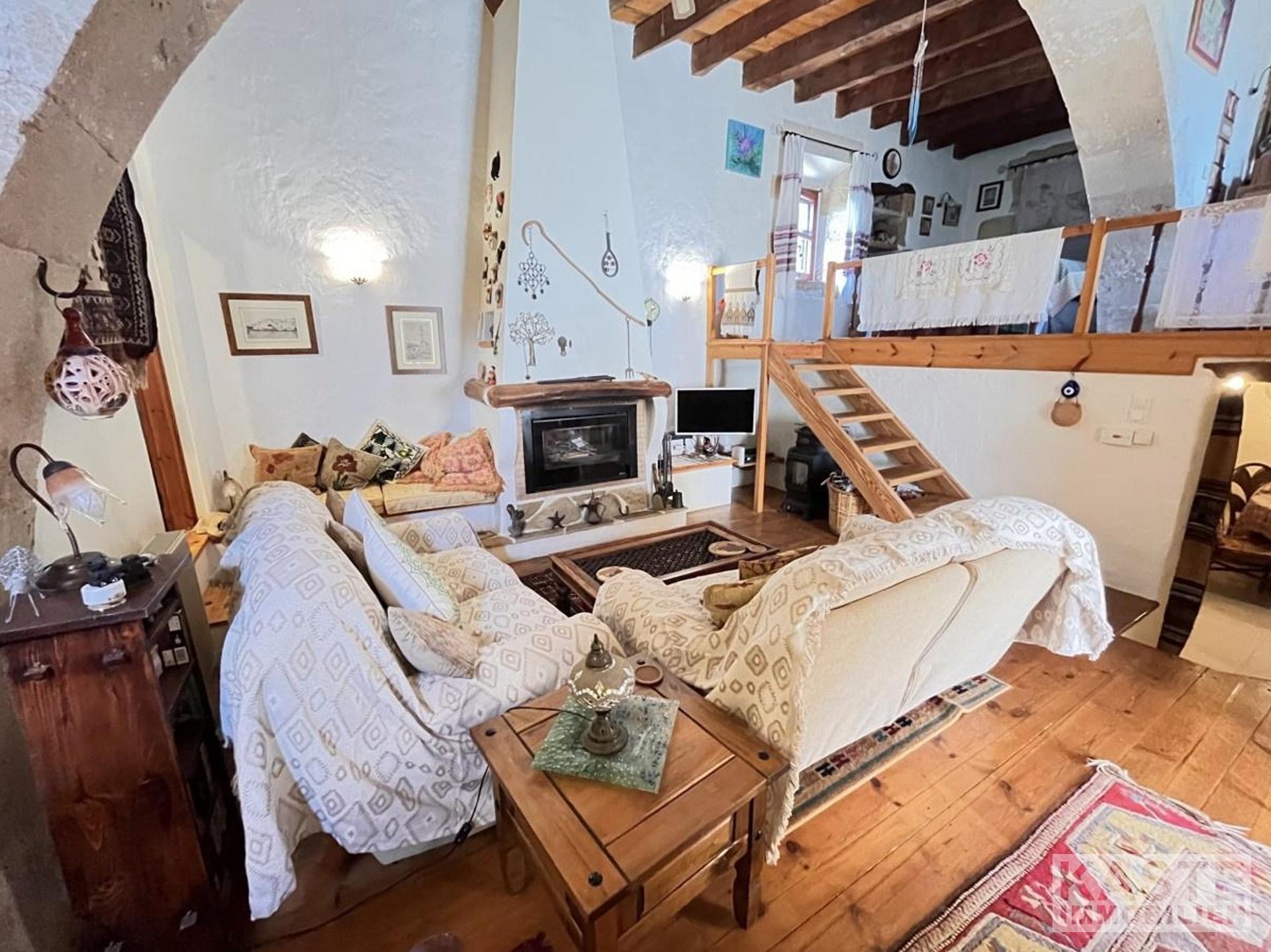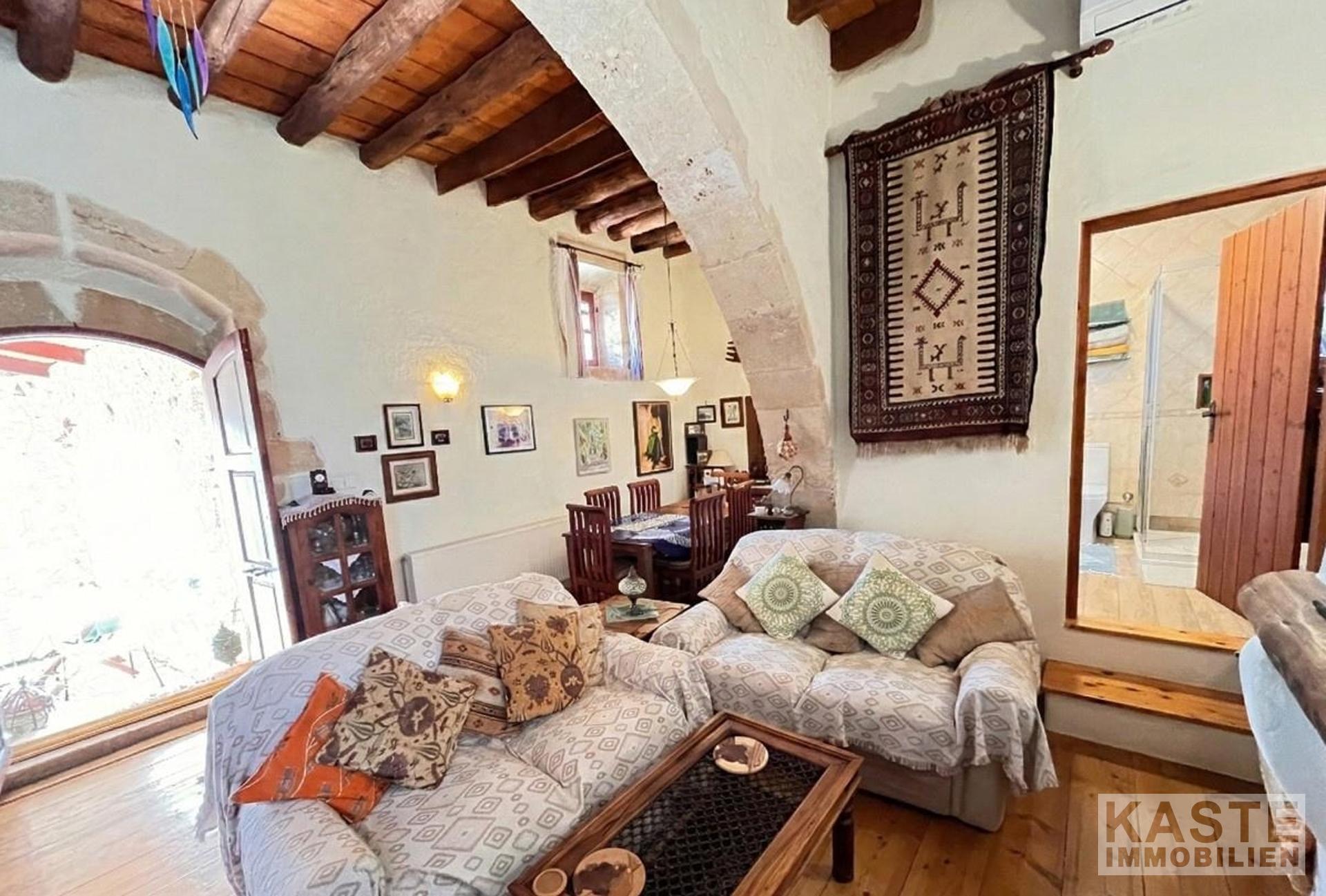 Die Innenräume sind geprägt von klassischem kretischen Design – harmonisch ineinander übergehende Räume mit echten Natursteinvorsprüngen schaffen ein behagliches Zuhause. Ein beeindruckender Kamin sowie hochwertige Holzböden und Decken runden das Erscheinungsbild ab und machen den Wohnbereich zum gemütlichen Mittelpunkt.