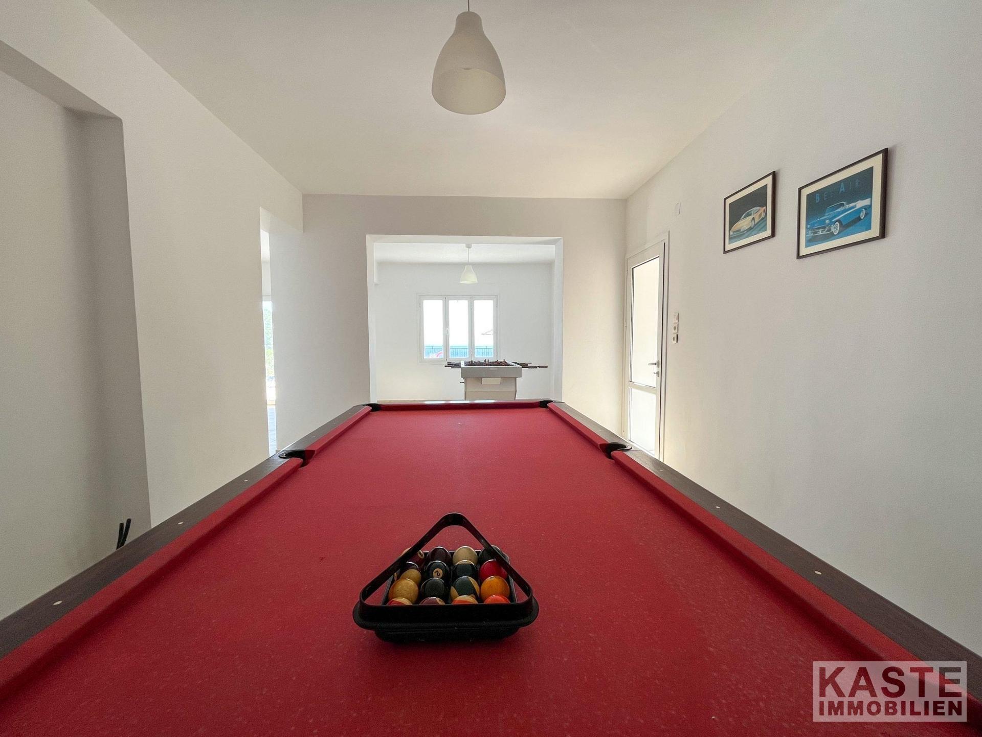 Das Erdgeschoss beherbergt eine Garage, einen Lagerraum, ein Spielzimmer - das auch als zusätzliches Schlafzimmer genutzt werden könnte -, sowie ein Badezimmer. Von hier aus führen Türen direkt zum Pool und zur Terrasse, die ideale Orte für gesellige Zusammenkünfte und Entspannung im Freien bieten.