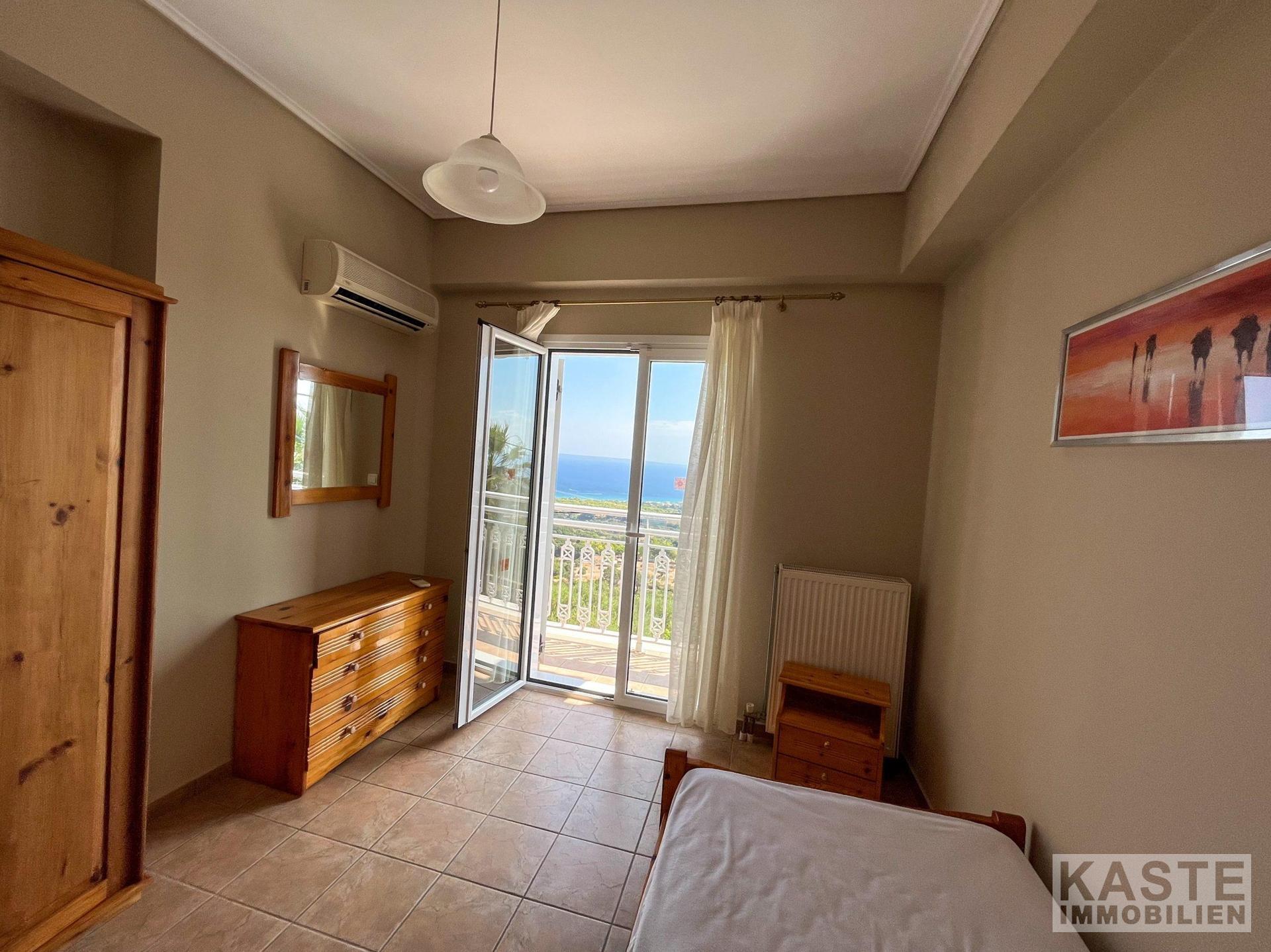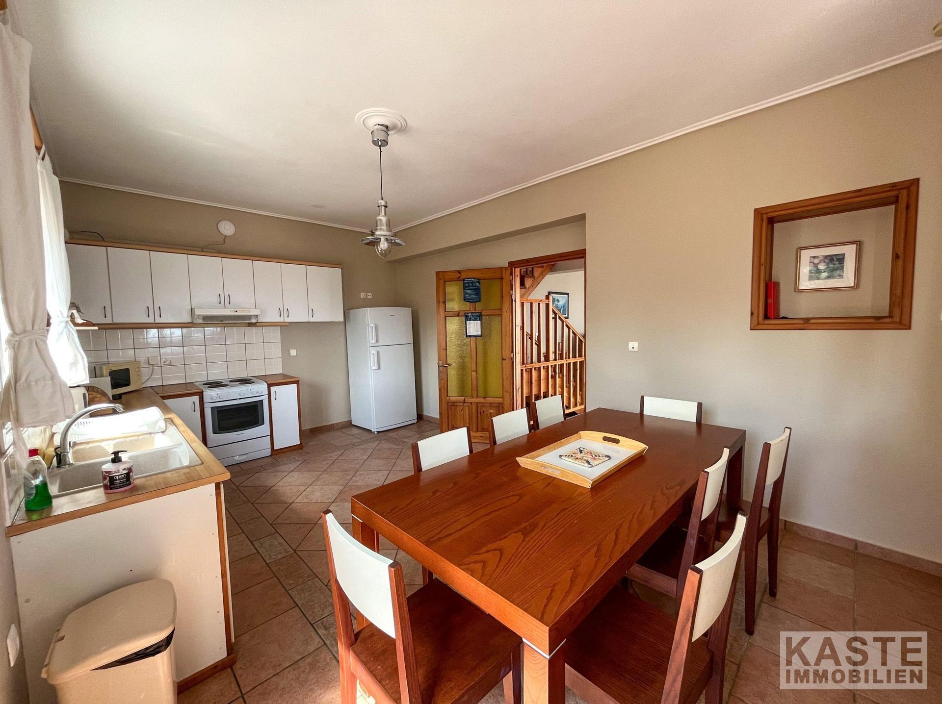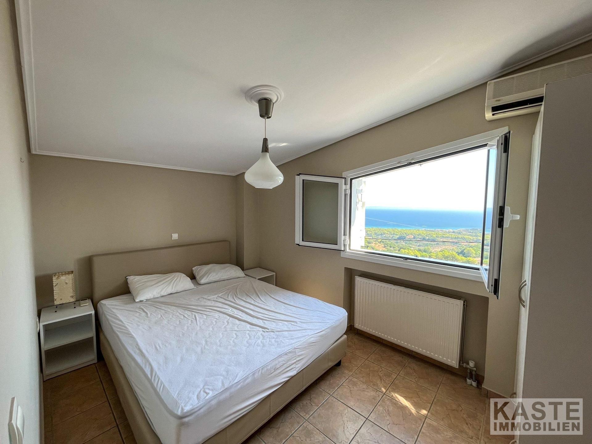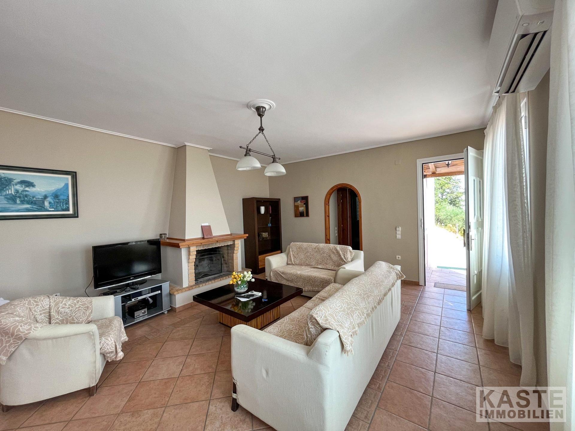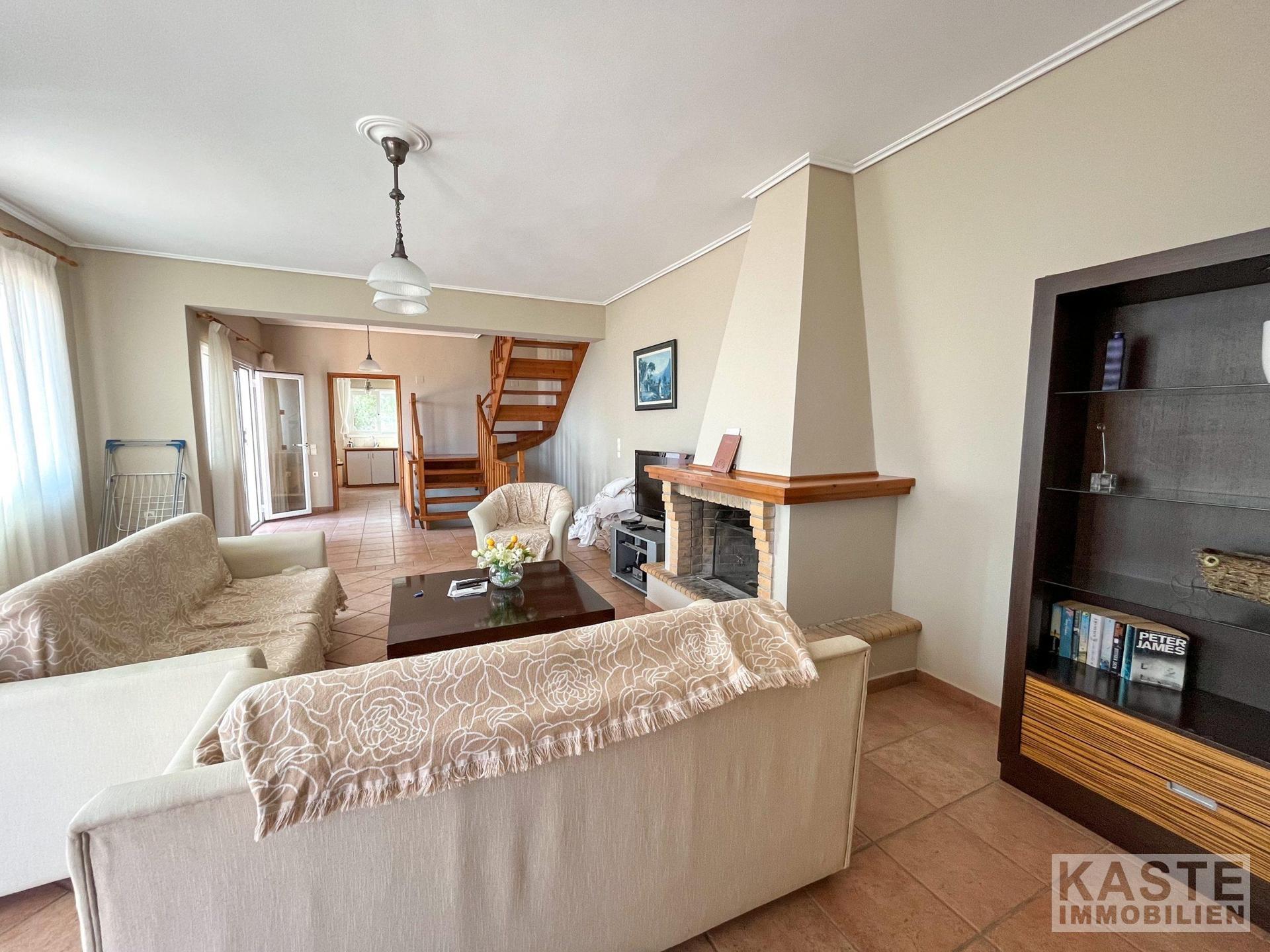 Der erste Stock begeistert mit einem großzügigen Wohnzimmer, das durch einen gemütlichen Kamin ergänzt wird, und einer voll ausgestatteten Küche. Ein Schlafzimmer sowie ein Bad mit Dusche komplettieren diese Ebene. Eine weitläufige Veranda auf dieser Etage bietet einen perfekten Panoramablick über die umliegende Landschaft und das Meer.