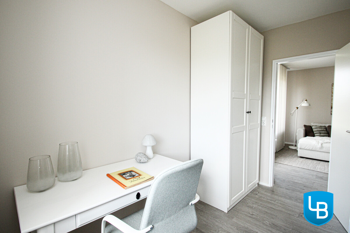 + Renovierte 2,5-Zimmer Wohnung + Lichtdurchflutetes Wohnzimmer mit Zugang zum kleinen Zimmer + Kleines Büro oder Esszimmer + Großzügiges Schlafzimmer + Einbauküche mit Elektrogeräten und Fenster + Innenliegendes Badezimmer mit bodentiefer Dusche + Komplett möbliert und ausgestattet