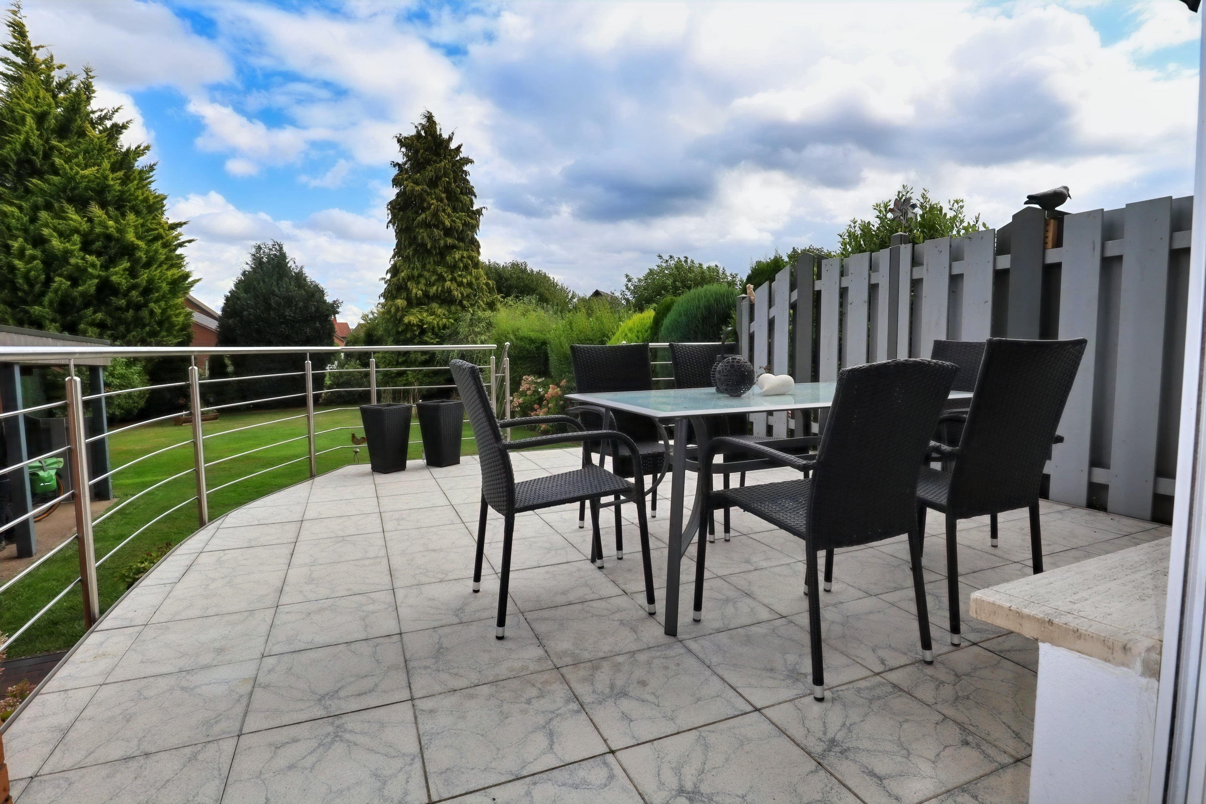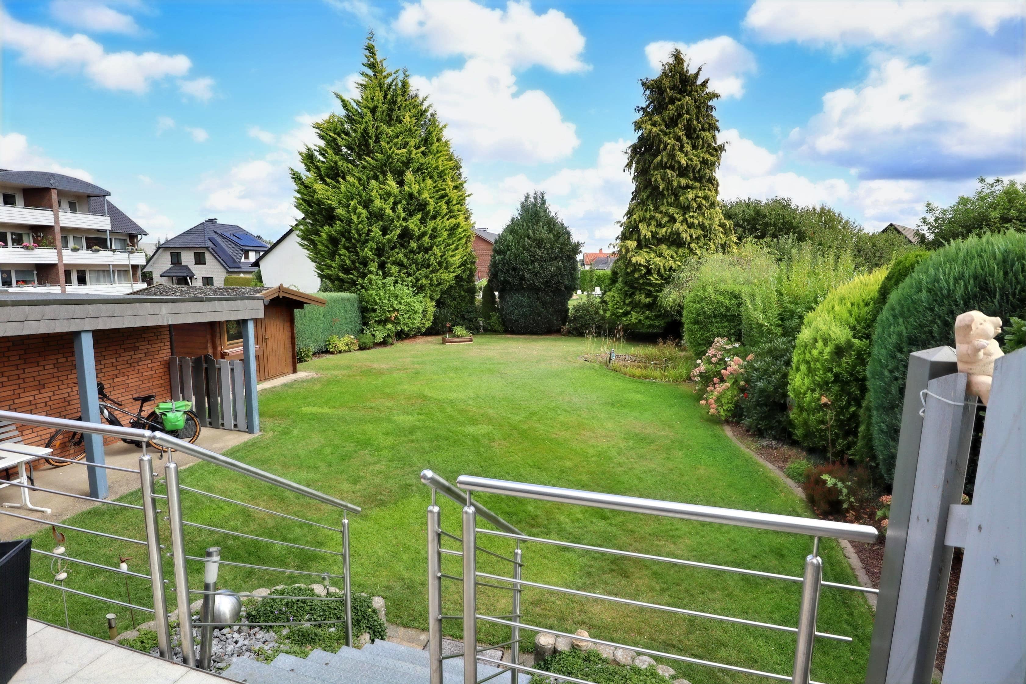 In der imposanten Gartenoase, beinah schon mit Parkcharakter, entspannen Sie nach langen Arbeitstagen oder schauen dem Nachwuchs und dem Vierbeiner beim Herumtollen zu.