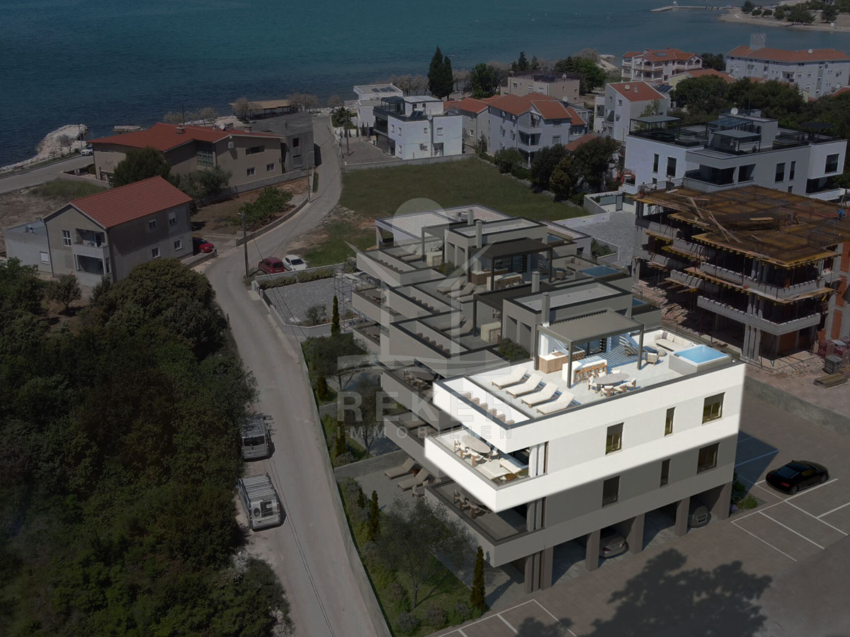 In Zaton, einem charmanten Ortsteil bei Nin, entsteht ein hochwertiges Neubauprojekt, nur rund 100 Meter vom Meer entfernt. Die Anlage fügt sich harmonisch in das mediterrane Umfeld ein und eröffnet dank ihrer erhöhten Position einen weiten Blick auf die vorgelagerten Inseln und die Bucht von Zadar. Die Nähe zur Küste und die ruhige Nachbarschaft verleihen dem Ort eine Atmosphäre von Beständigkeit und Exklusivität.