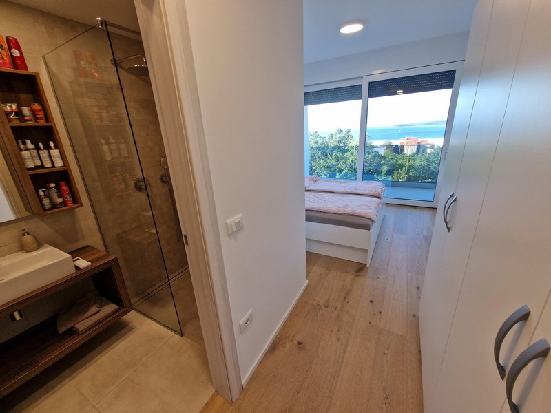 Besonders von der Terrasse besteht ein wunderschöner Blick auf das Meer. Zum Appartement gehören noch ein ca. 74 m² großer Garten / Außenbereich sowie drei Stellplätze.