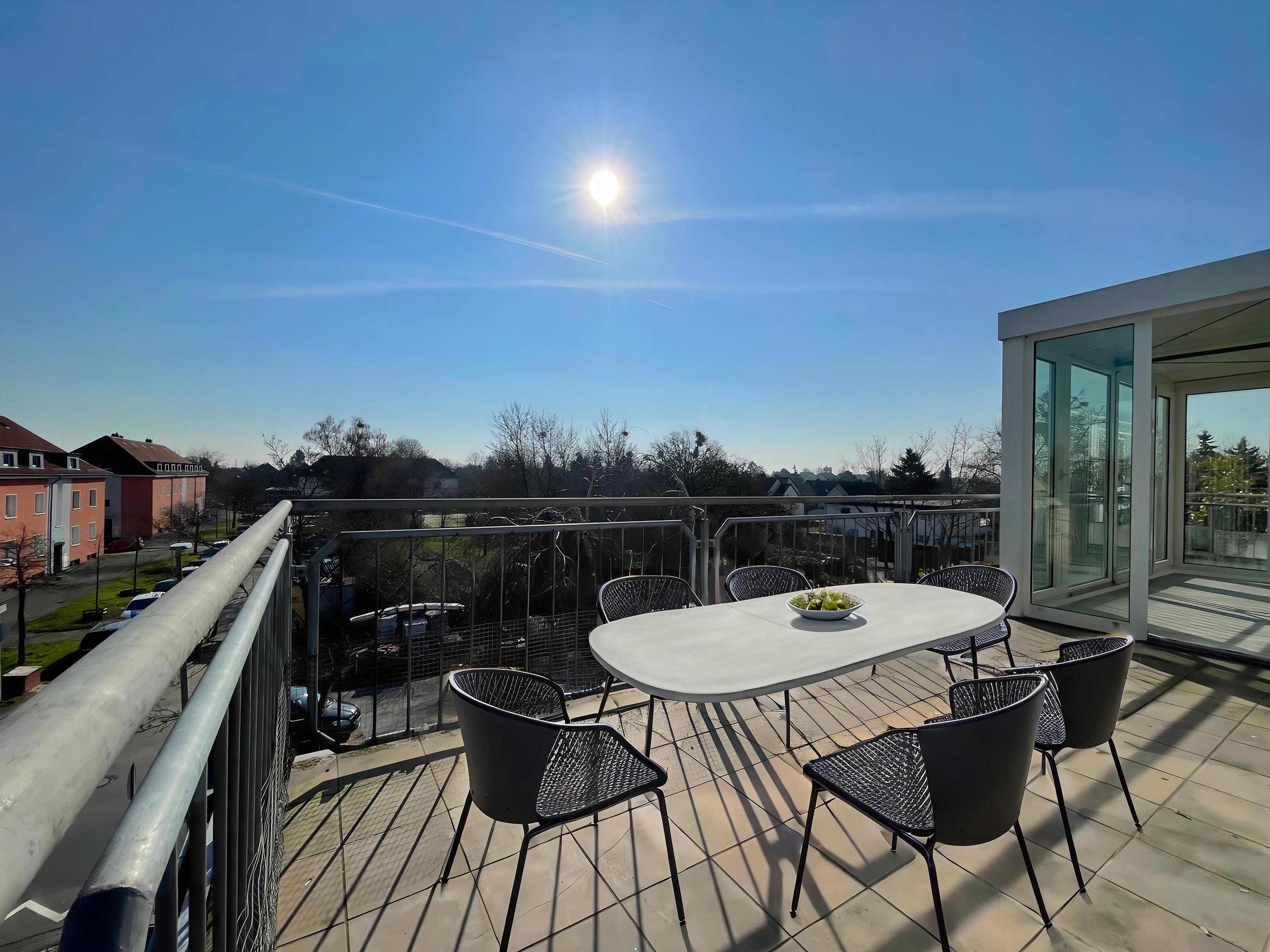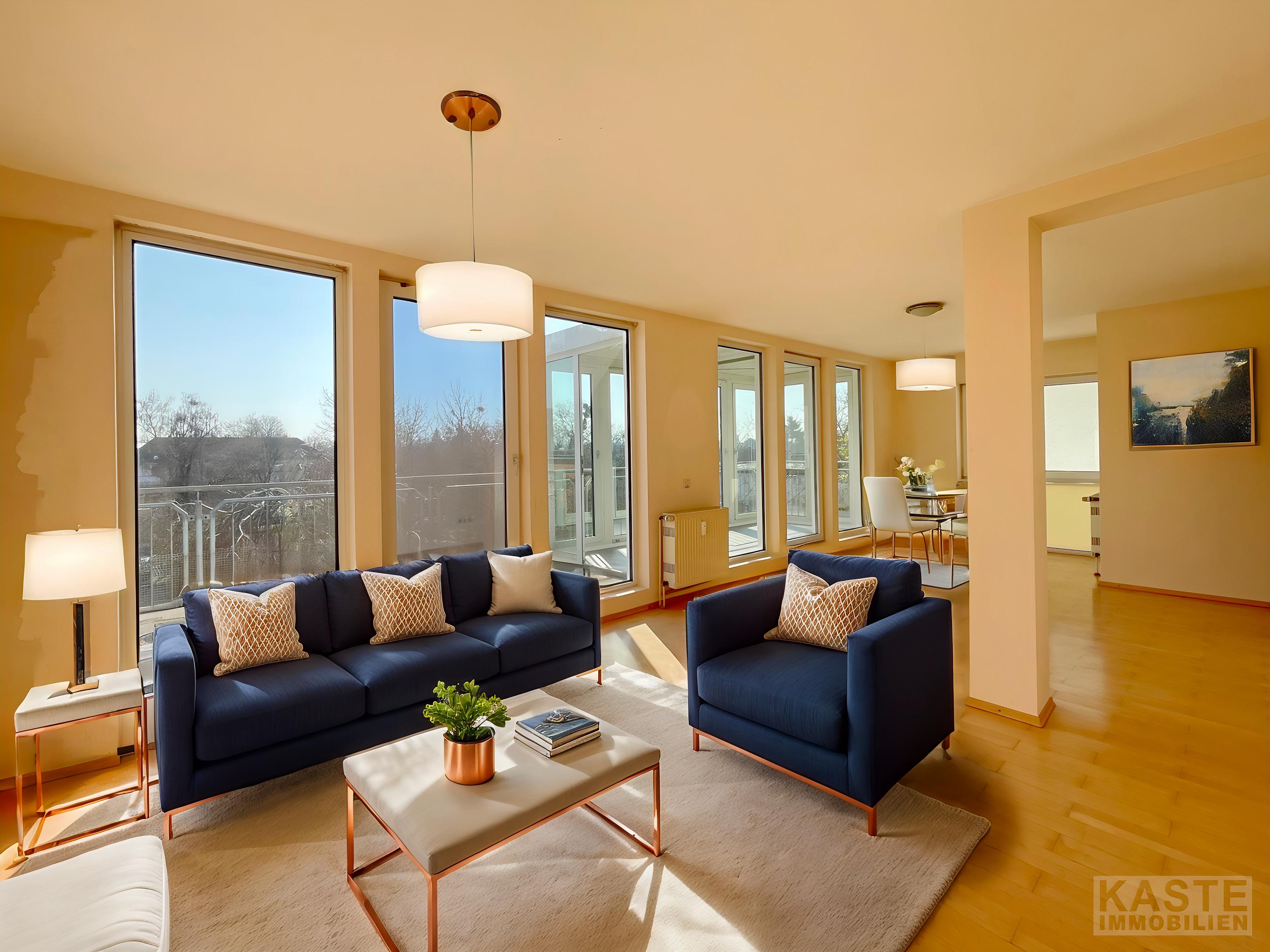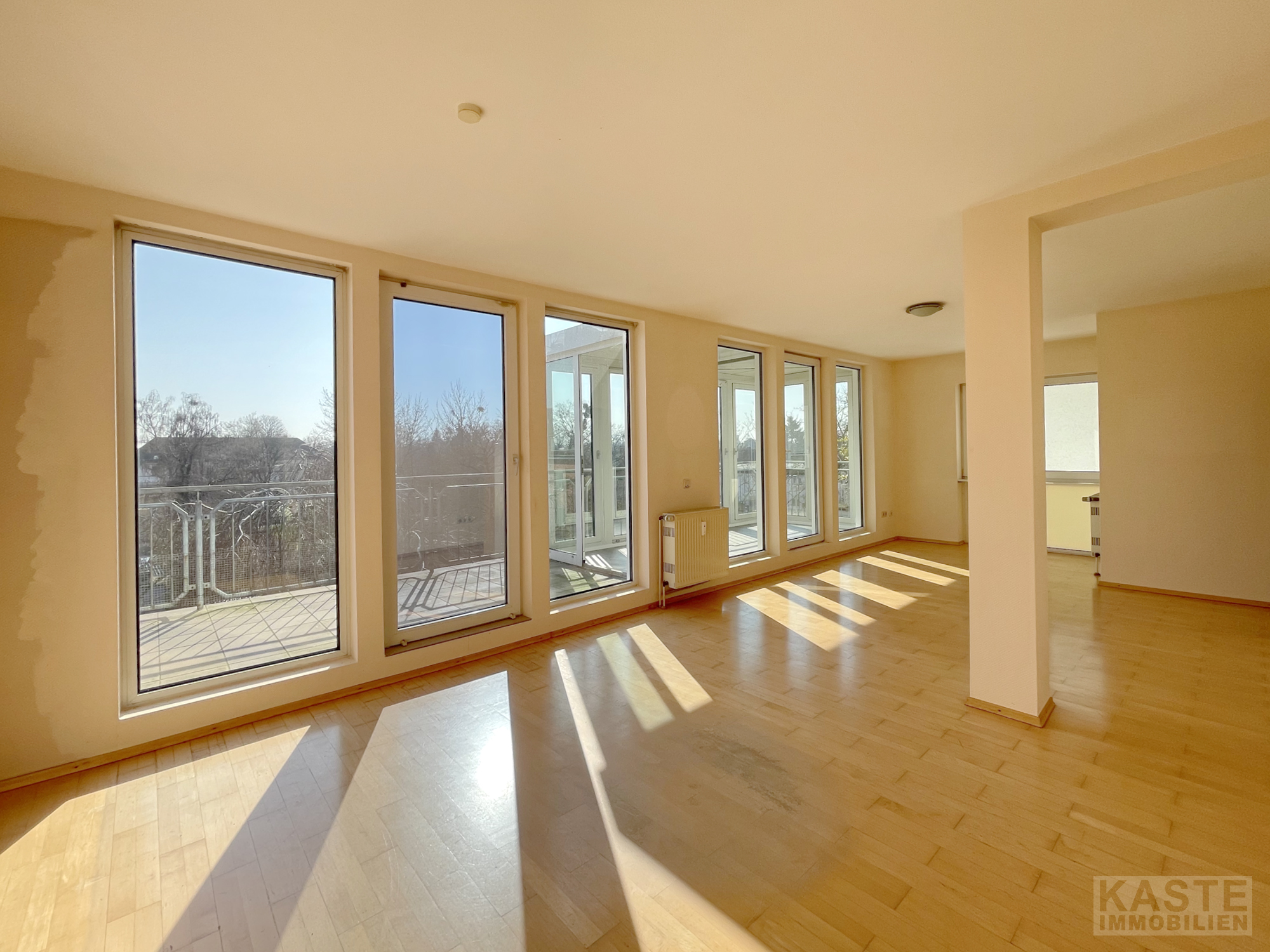 Besonders positiv wirkt der direkte Bezug zum Platz mit Baumbestand, auf den man von der Terrasse aus offen blickt. Dadurch entsteht ein luftigeres Wohngefühl mit Weite und Grünbezug. Die erhöhte Lage des Penthouses trägt zusätzlich dazu bei, dass sich die Wohnung angenehm vom direkten Straßenraum absetzt.