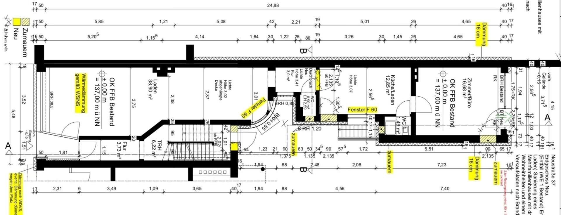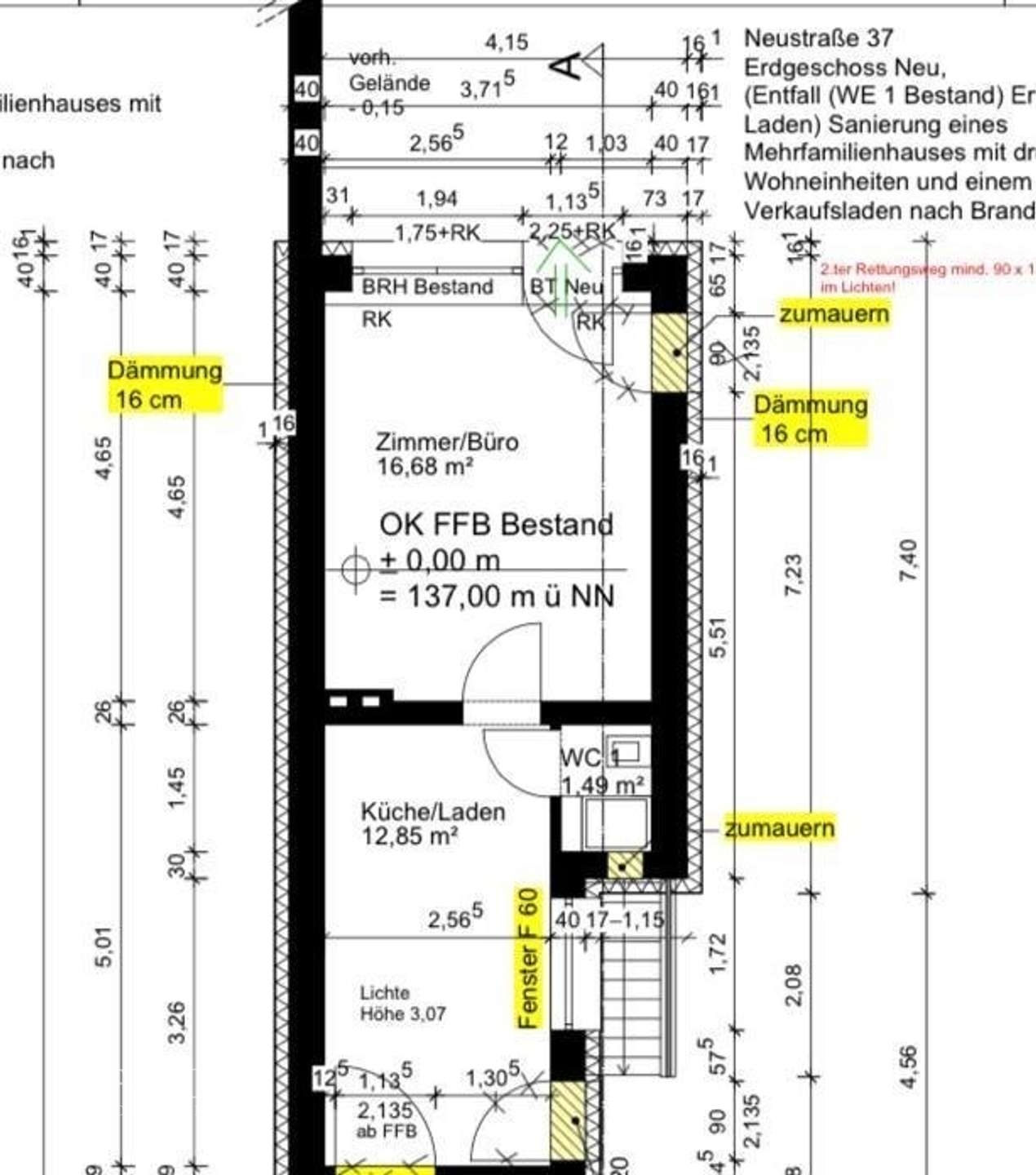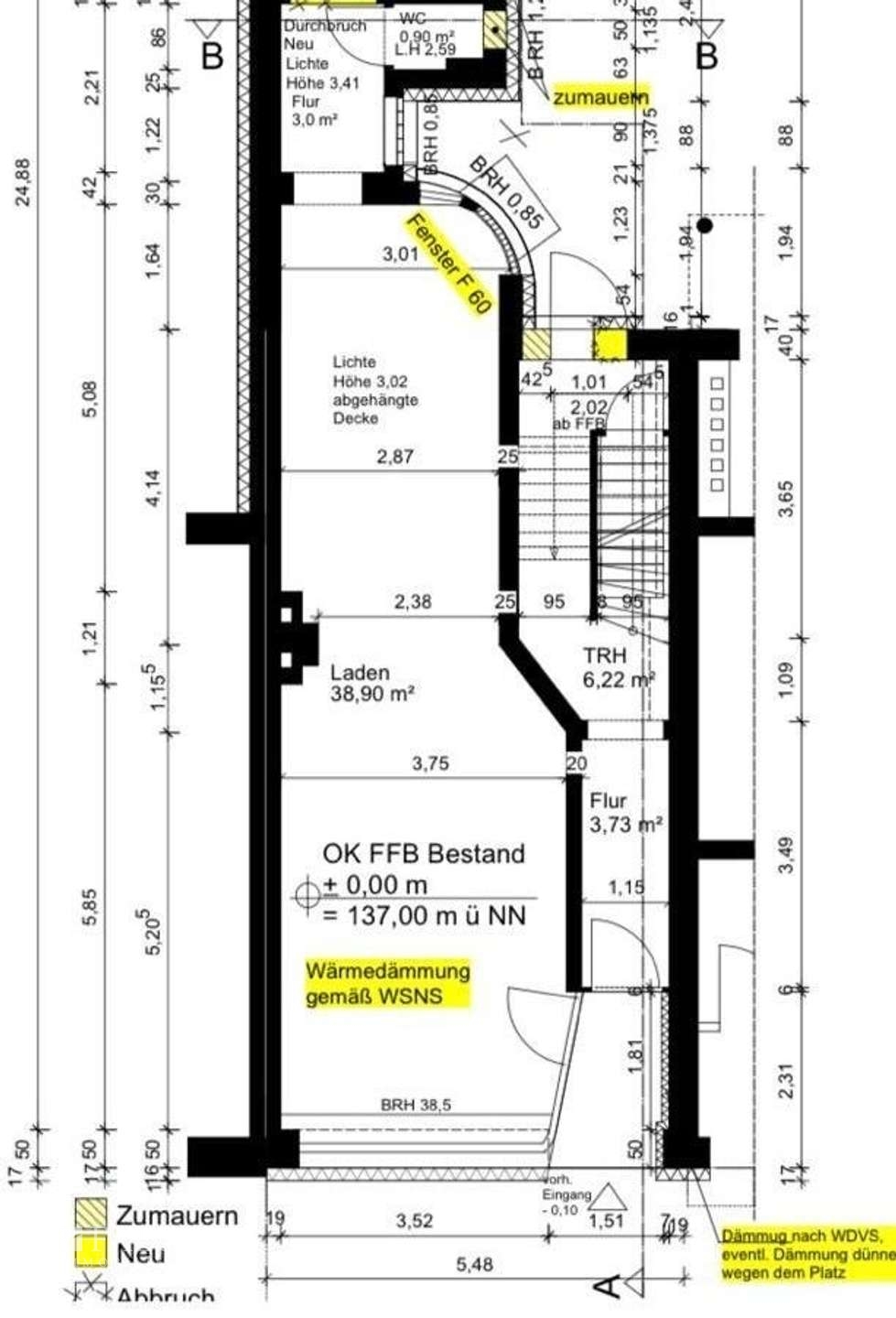 Zur Vermietung stehen in diesem Wohn- und Geschäftshaus 72 m² Büro- und Praxisfläche im Erdgeschoss. Das Haus wird nach einer Explosion nach den neuesten Standards (GEG gerecht) wieder aufgebaut bzw. saniert. Ihre neue Büro- /Praxisfläche erstreckt sich über einen großen Raum (39 m2) mit einer Kundentoilette mit Schaufensterfont zur Fussgängerzone. Durch einen kleinen Flur gelangen Sie in zwei weitere Räume, der erste (ca. 13 m2) bietet Zugang zu einem weiteren Bad/WC, direkt anschließend ein weiterer heller Raum.