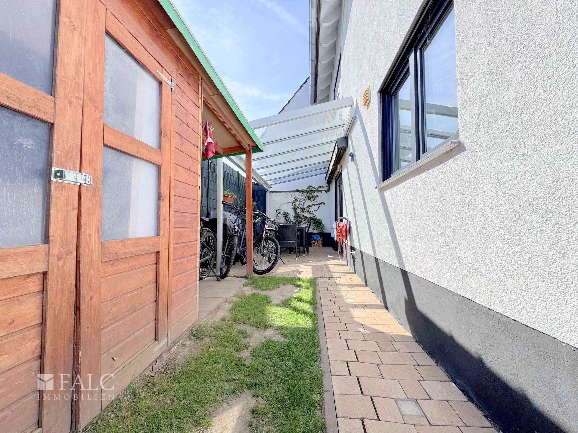 Der Außenbereich ist pflegeleicht und praktisch gestaltet: Ein kleiner Vorgarten unterstreicht den freundlichen Charakter des Hauses, während im hinteren Bereich ein Gartenhaus zusätzlichen Platz für Fahrräder, Gartengeräte oder saisonale Dinge schafft. Die überdachte Terrasse an der Hausseite lädt zu geselligen Stunden im Freien ein und macht den Außenbereich das ganze Jahr über nutzbar.