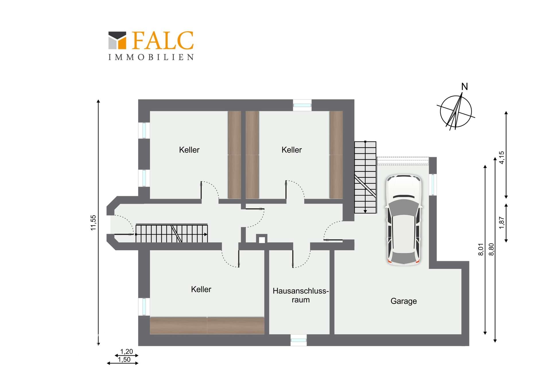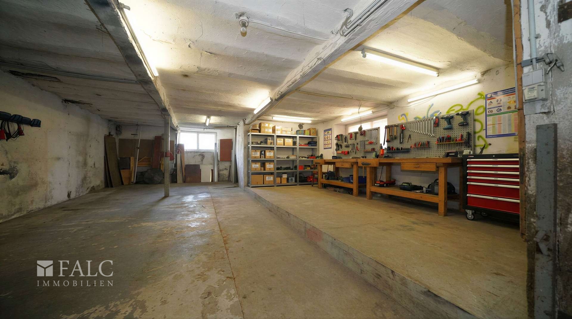 Im Erdgeschoss, das eher einem Kellergeschoss ähnelt, befinden sich drei Räume, die sich ideal als Büro, Werkstatt oder großzügige Abstellfläche nutzen lassen. Zusätzlich ist hier die Garage untergebracht, die aufgrund ihrer Größe sogar Platz für ein längeres Fahrzeug bietet.