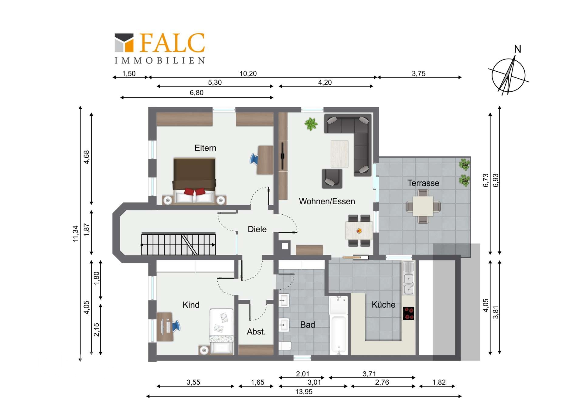 Über das zentrale Treppenhaus gelangen Sie anschließend in das erste Obergeschoss, das sich als großzügiger Wohnbereich für die Familie präsentiert. Direkt zur rechten Seite befindet sich ein erstes großes Schlaf- oder Kinderzimmer, das mit viel Platz für individuelle Einrichtungsideen überzeugt. Nur wenige Schritte weiter erwartet Sie die moderne, helle Einbauküche, die mit einer kleinen Kücheninsel und reichlich Stauraum ausgestattet ist – ein Ort, an dem Kochen und gemeinsames Beisammensein Freude bereiten. Von hier aus gelangen Sie auch auf die überdachte Dachterrasse in Ostausrichtung. Diese lädt dazu ein, den Tag mit einem Frühstück in der Morgensonne zu beginnen oder laue Sommerabende im Freien zu genießen. Besonders praktisch: Die Terrasse ist zusätzlich über eine Außentreppe vom Hof aus erreichbar.